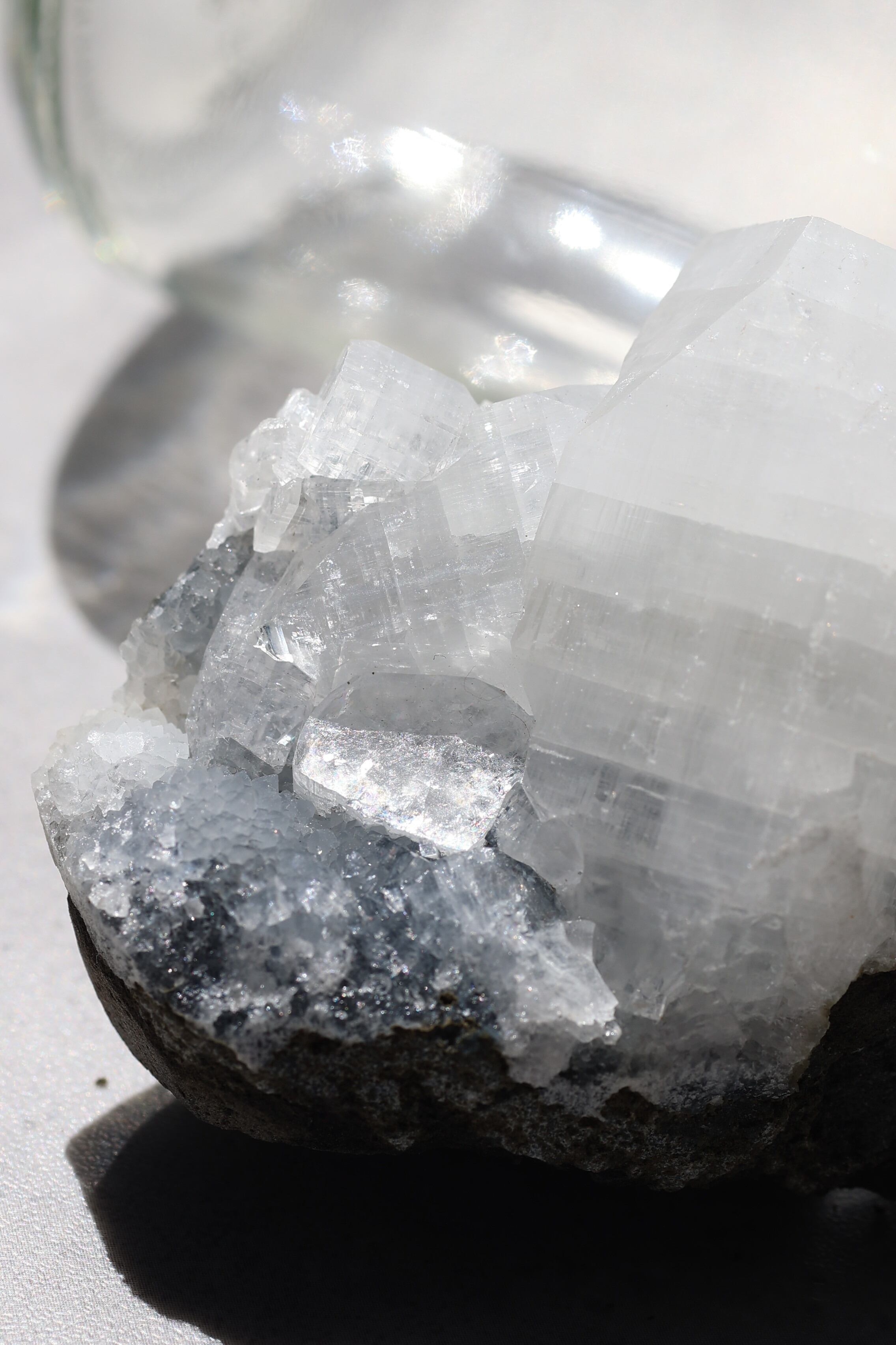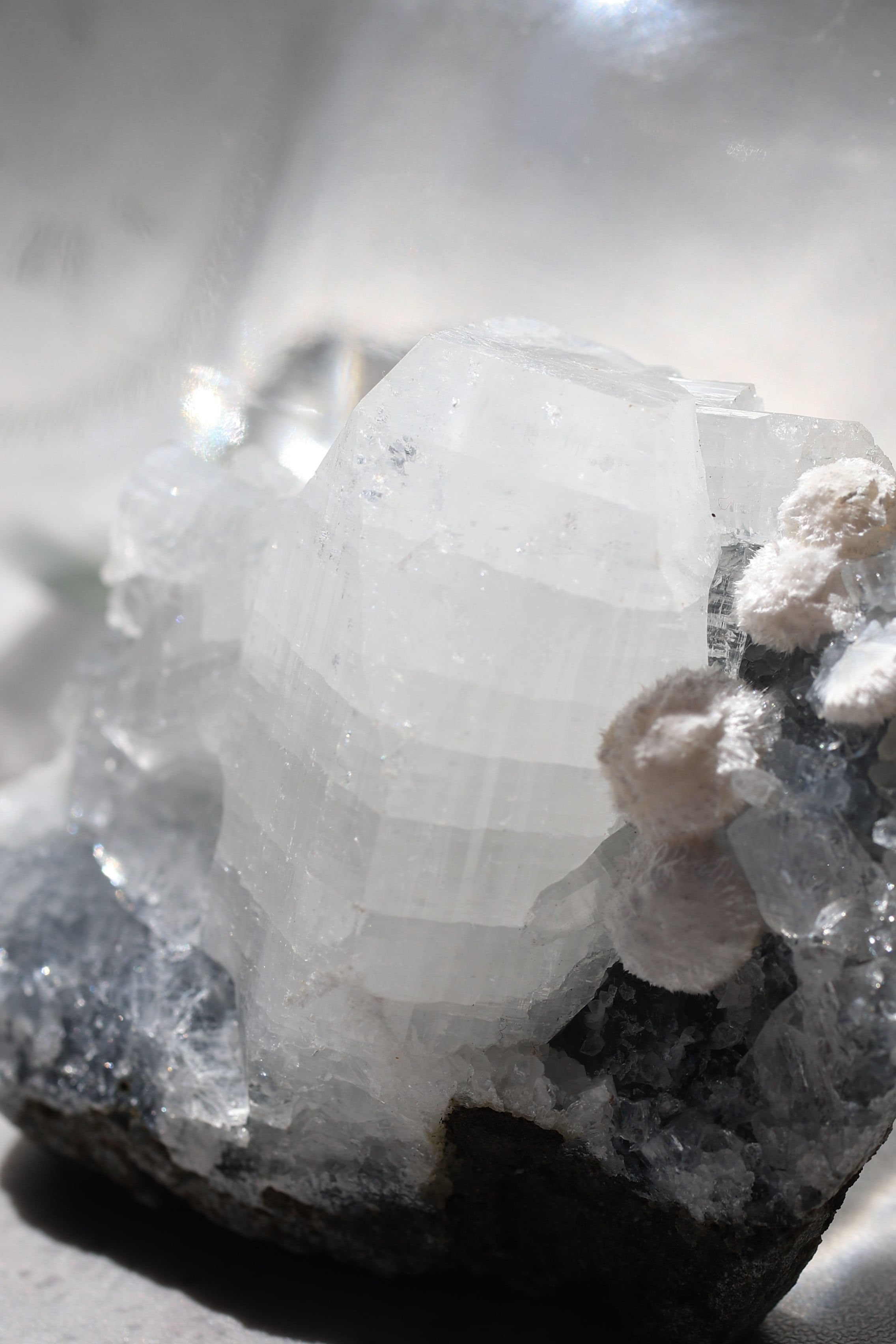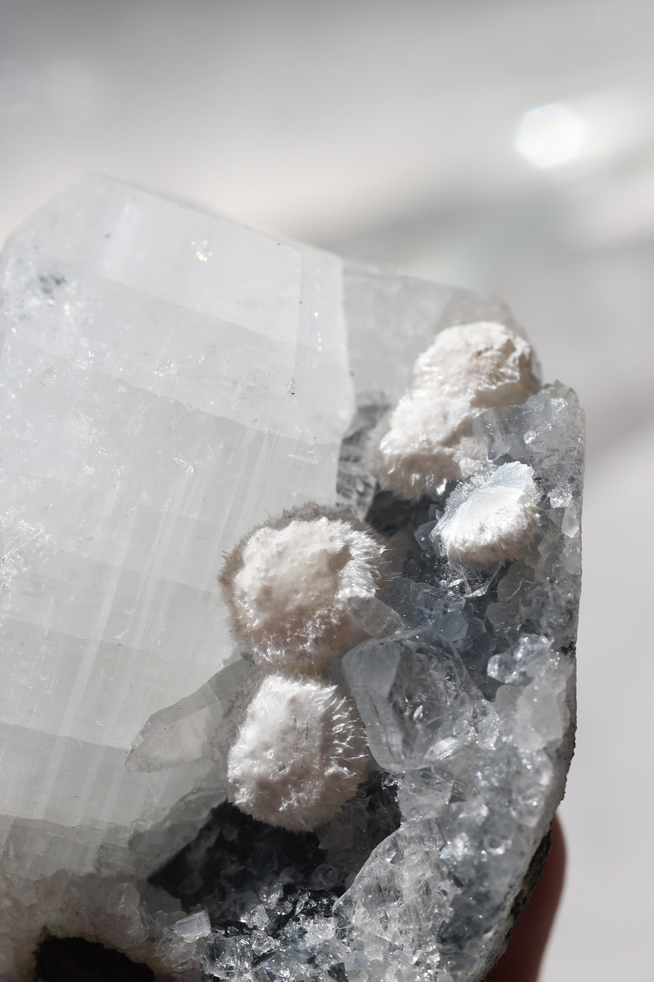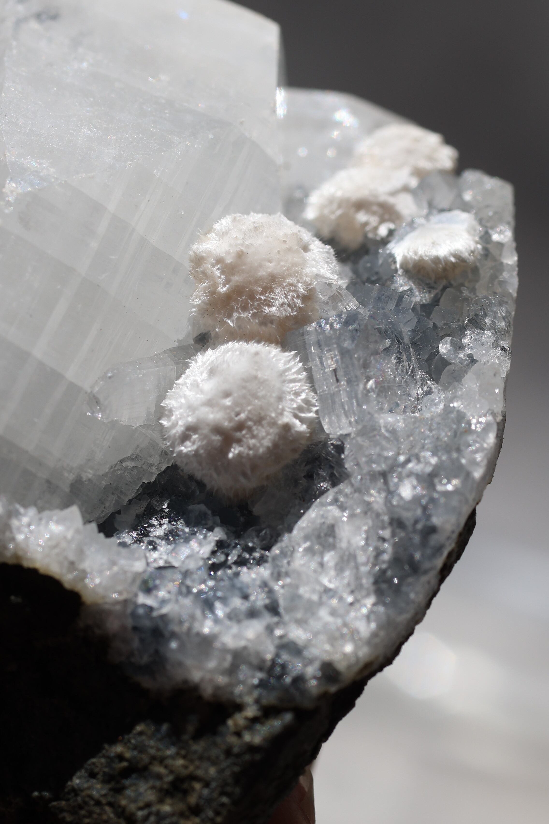 この標本に使われているカルセドニーは、ツヤのないやさしいマットタイプ。キラキラとした輝きとはまた違った、落ち着いた風合いが全体を包み込んでいます。その上に点在するモルデナイトの球状結晶は非常に繊細で、そっと触れただけで崩れてしまうこともあるほど。透明なアポフィライトの結晶がアクセントのように浮かび上がり、控えめながらも凛とした印象を残します。