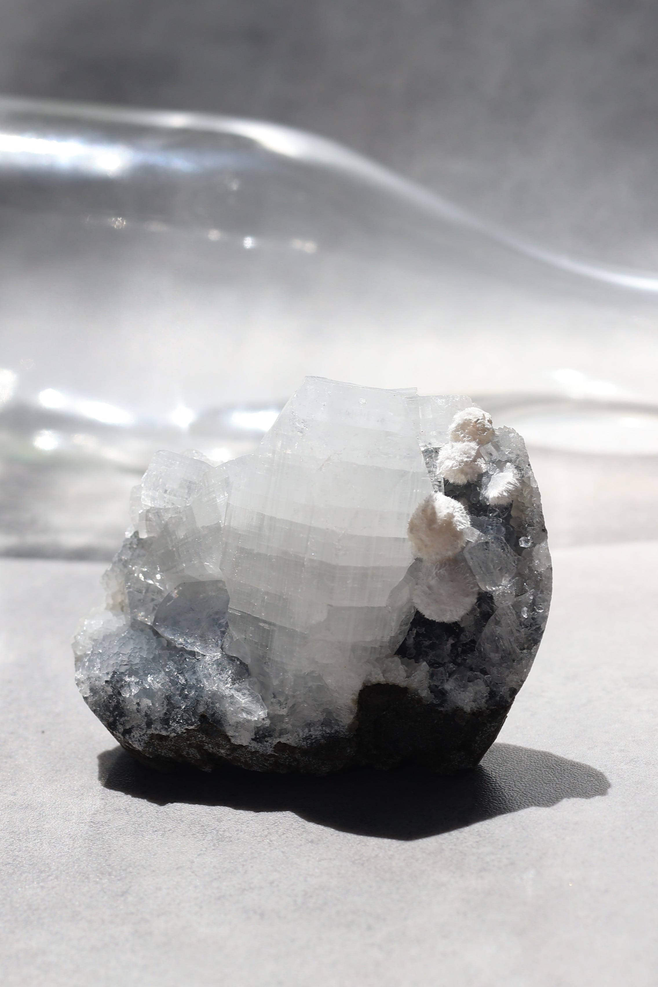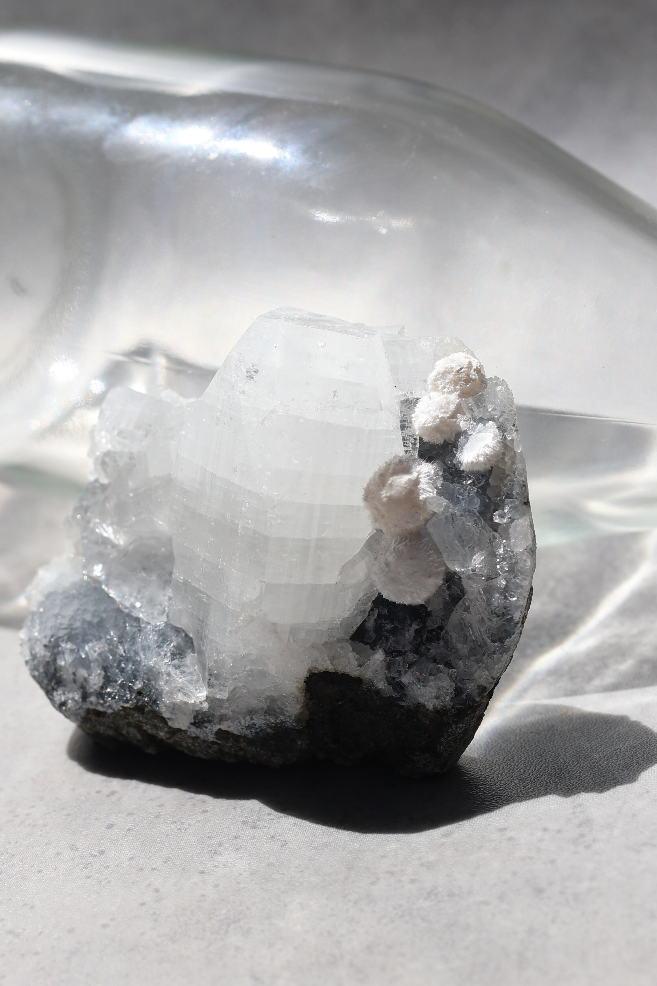 ふわりと咲いた白いモルデナイト、マットな質感をもつカルセドニーの母岩、そして透明感を放つアポフィライトがひとつに集まった共生標本。石同士が語り合うように寄り添いながら、静かな世界をつくりあげています。