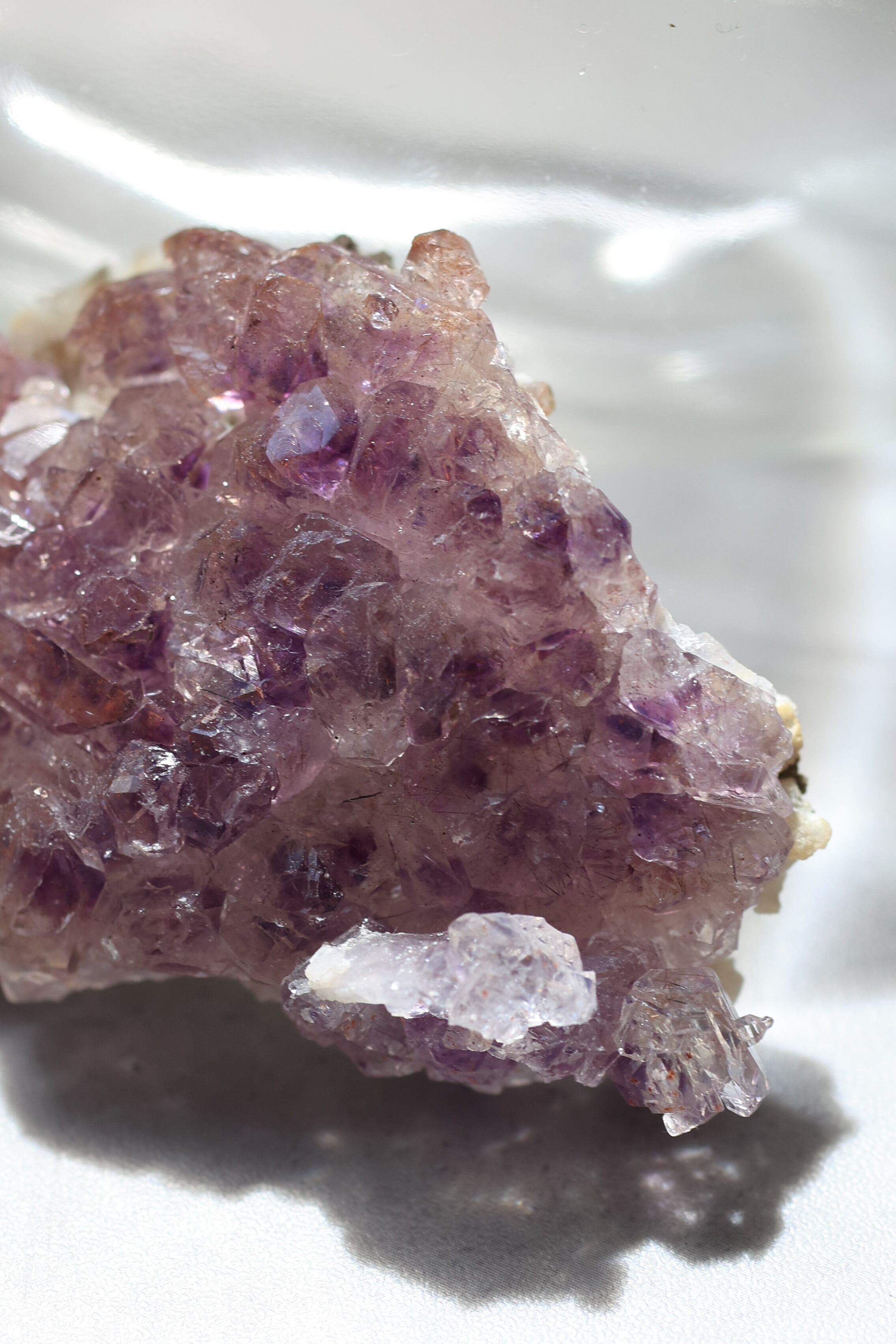 紫の中にさりげなく現れる黒やブラウンのルチルは、結晶に奥行きと個性を与え、まるで自然がそっと描いた線画のような美しさを放ちます。天然でルチルを含むものは産出量が少なく、特にカルール産は希少性が高く、出会える数が限られています。