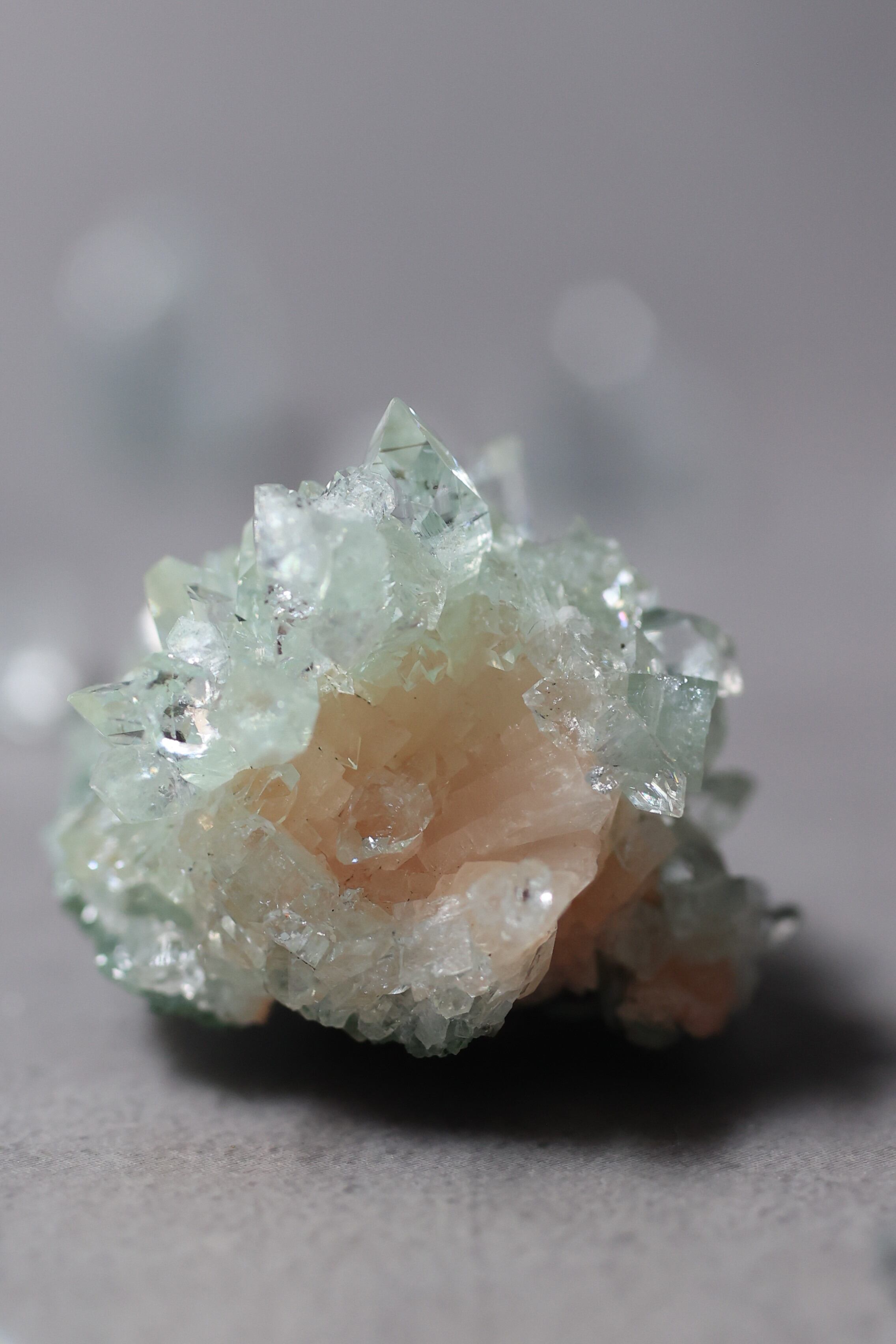 やわらかな緑を湛えたアポフィライトの透明感と、ピンクヒューランダイトの結晶。