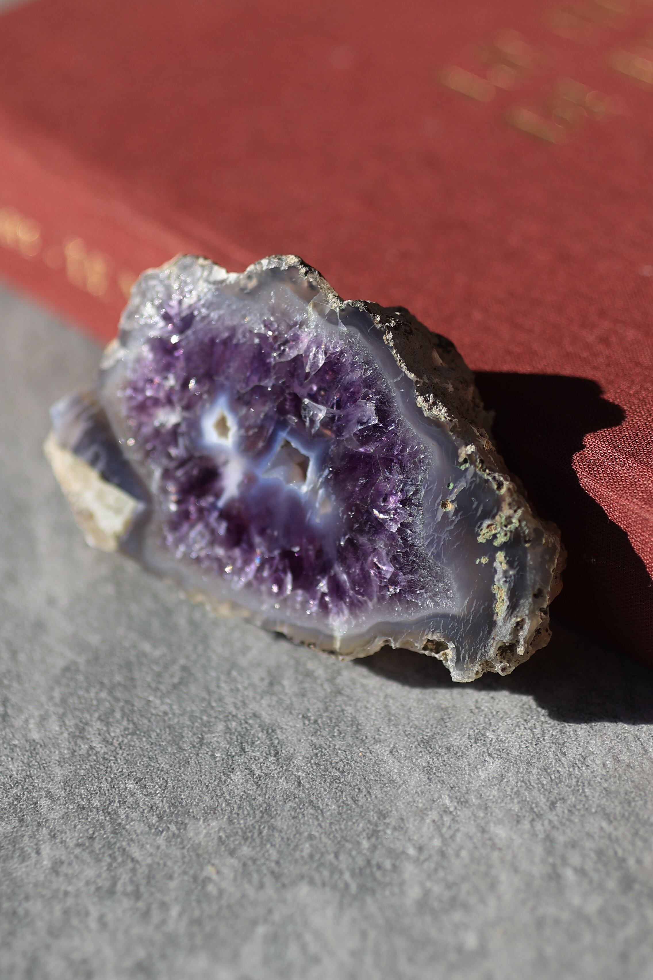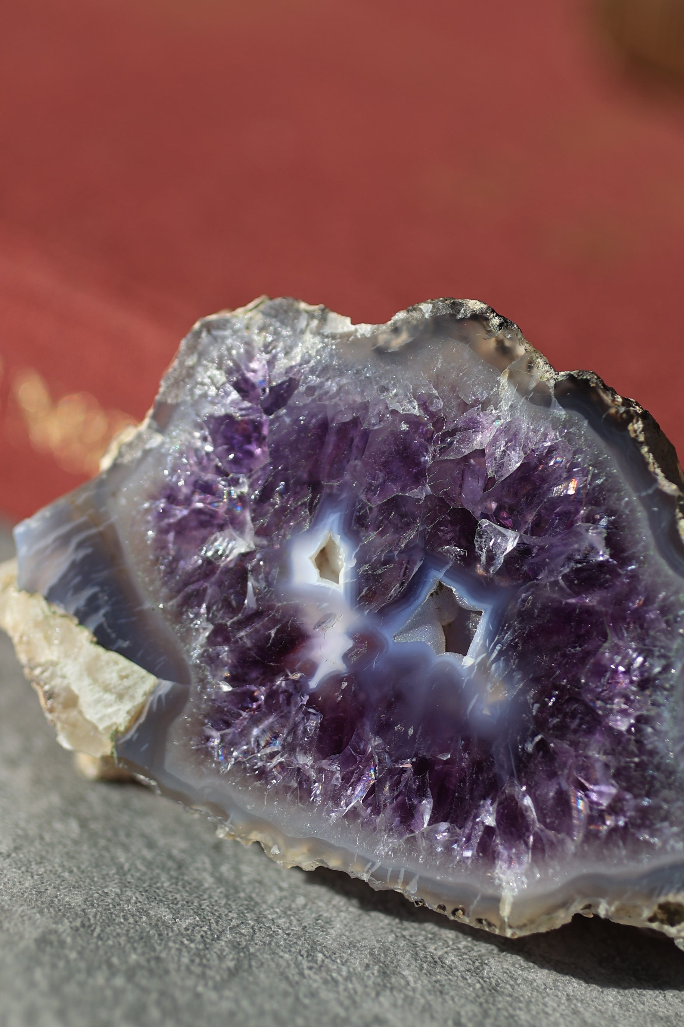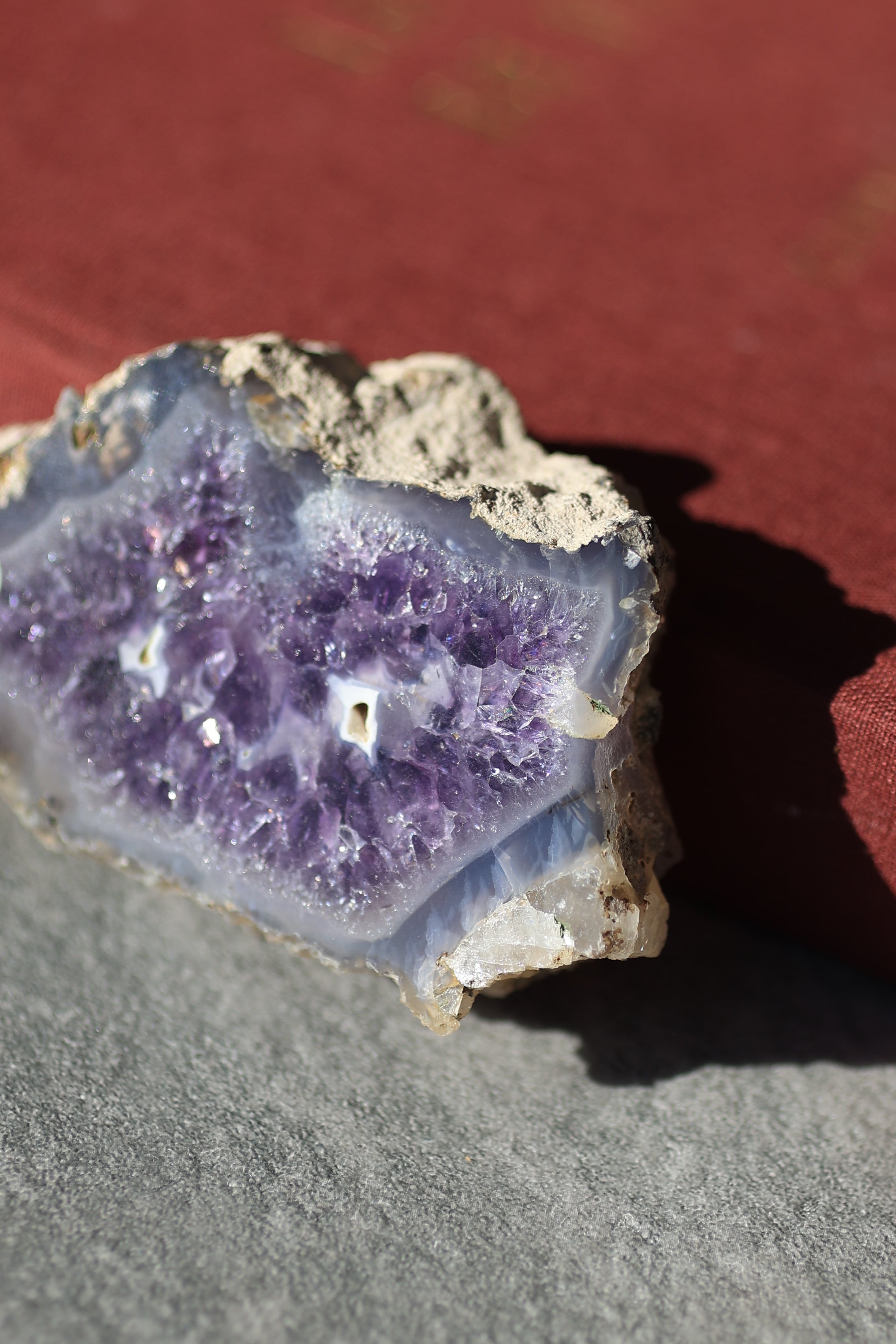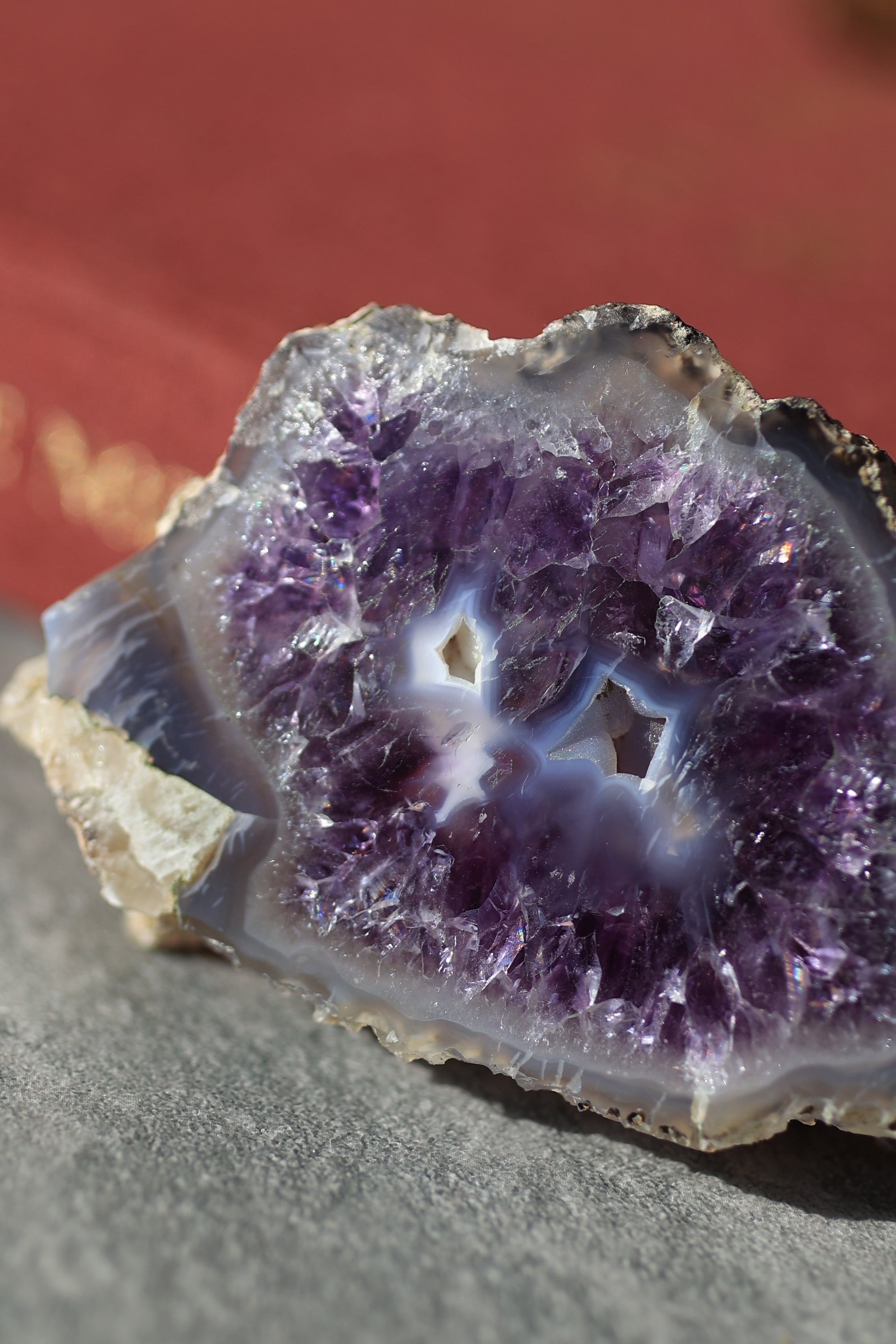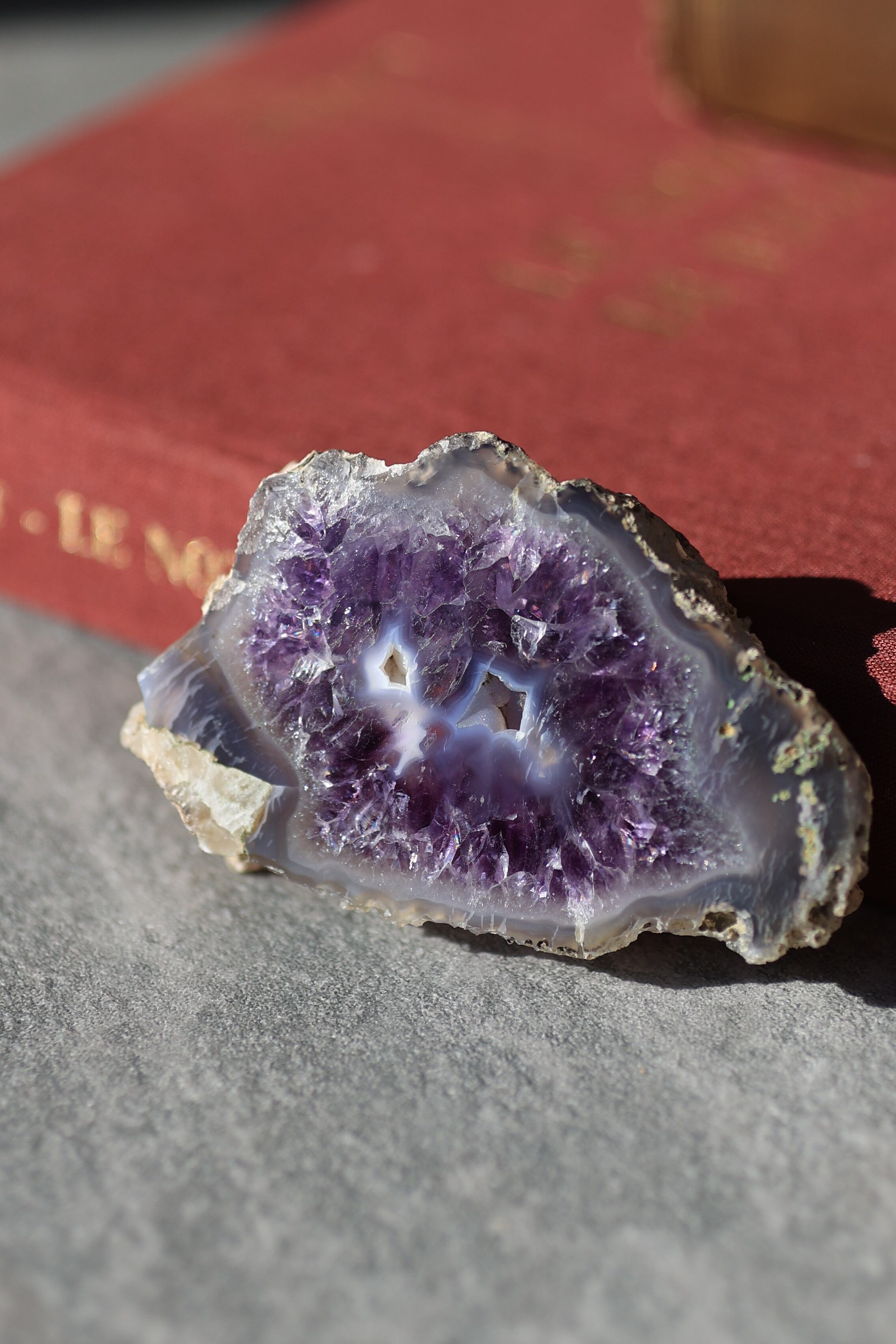 スライスされたアメジストは、原石の力強さと上品さが共存しており、