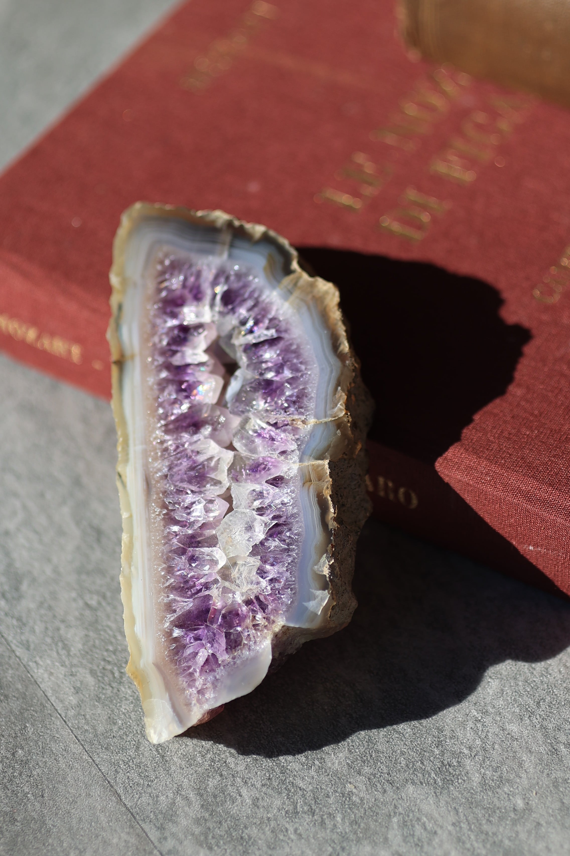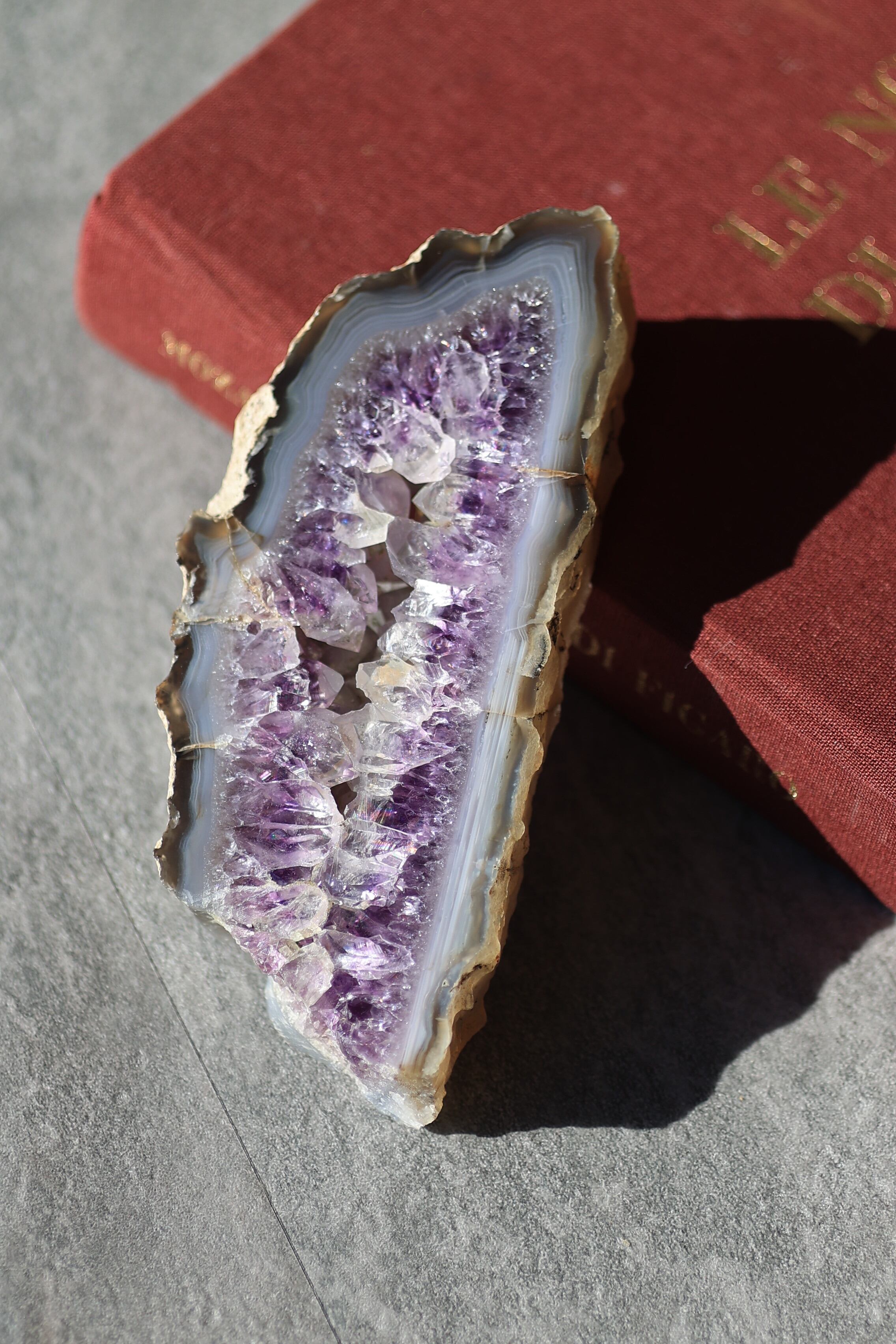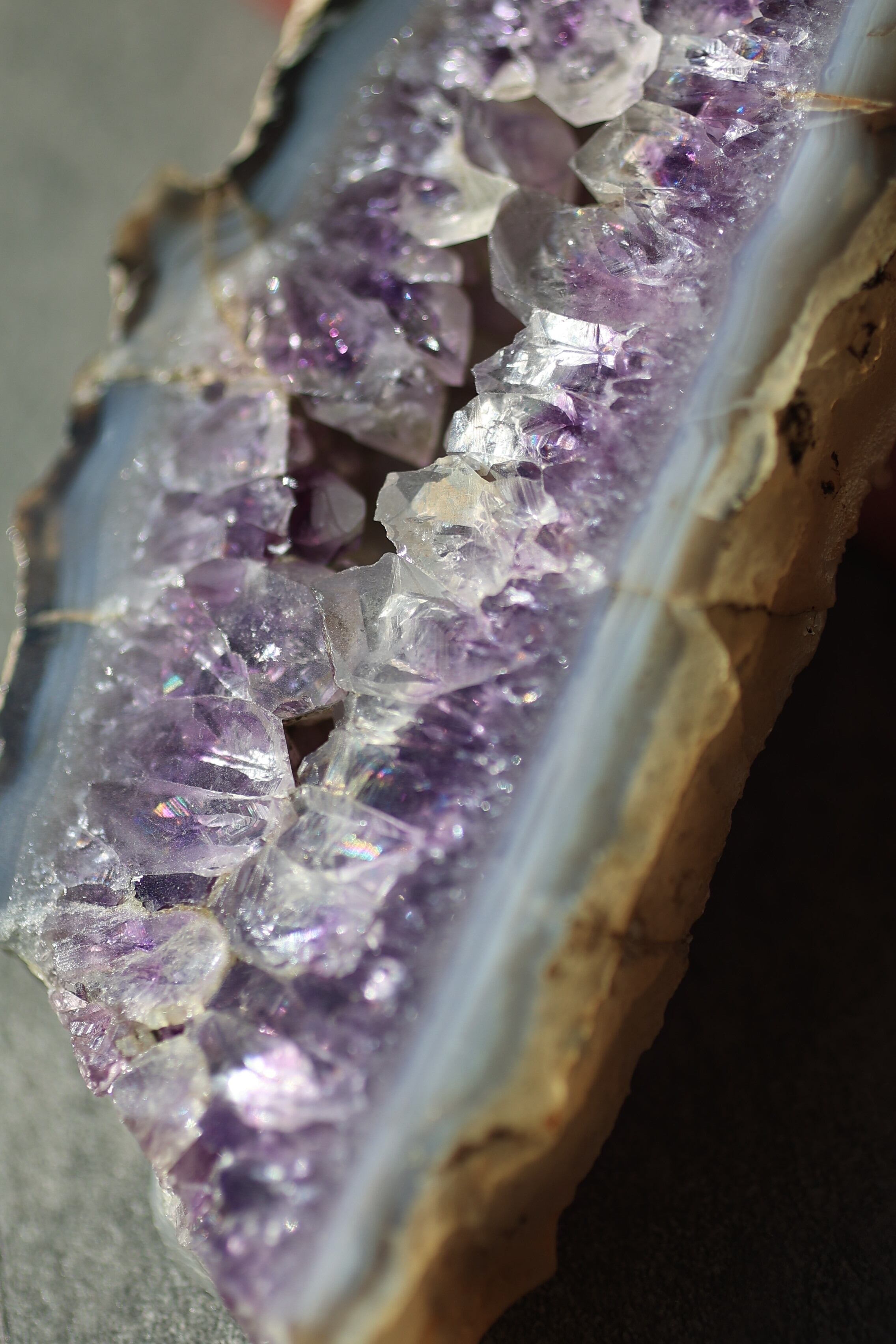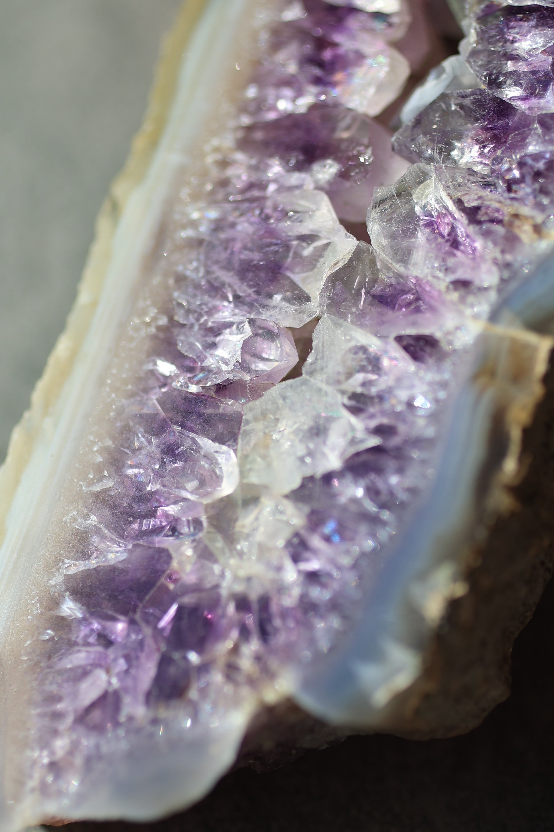 スライスされたアメジストは、原石の力強さと上品さが共存しており、