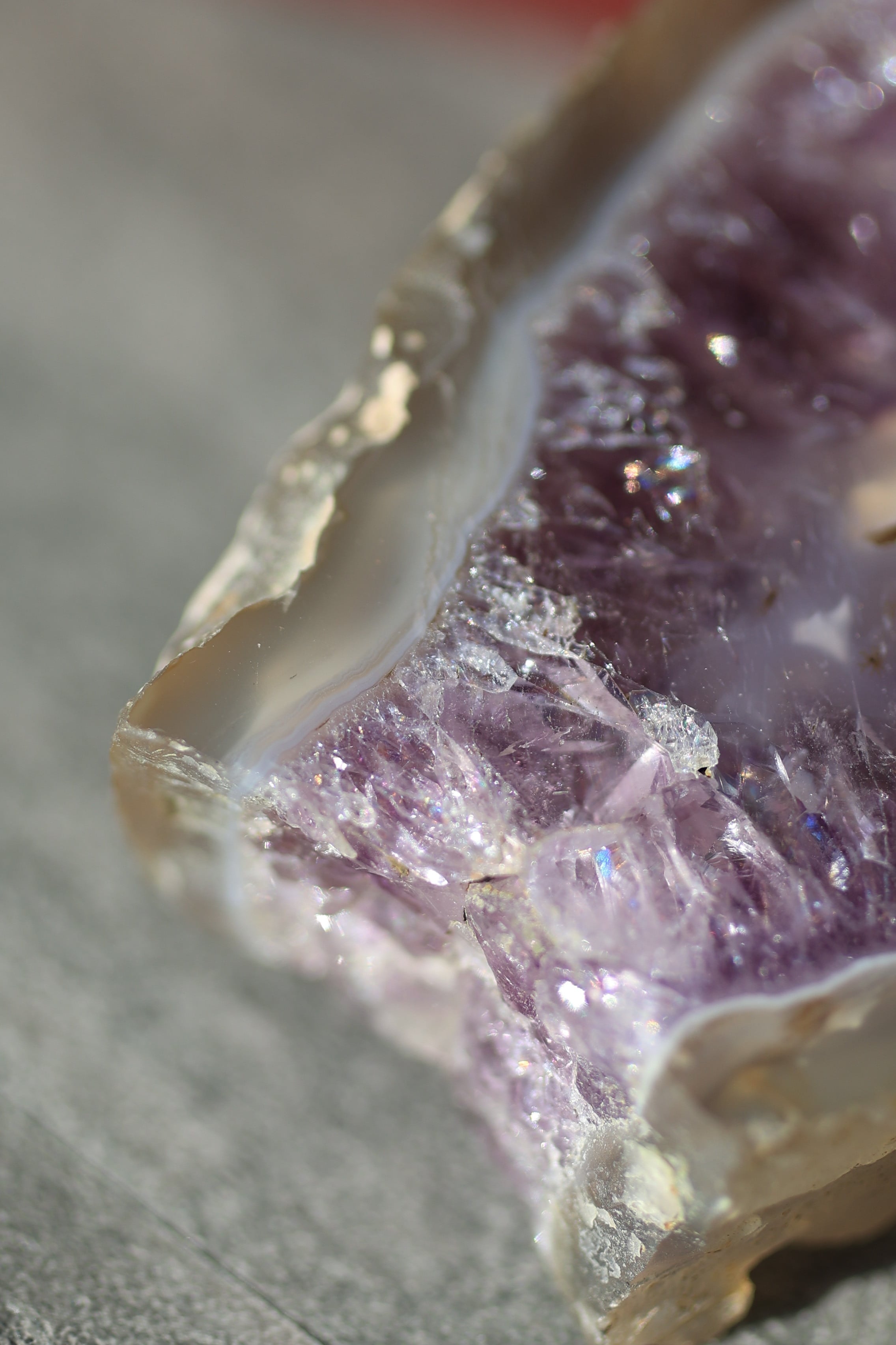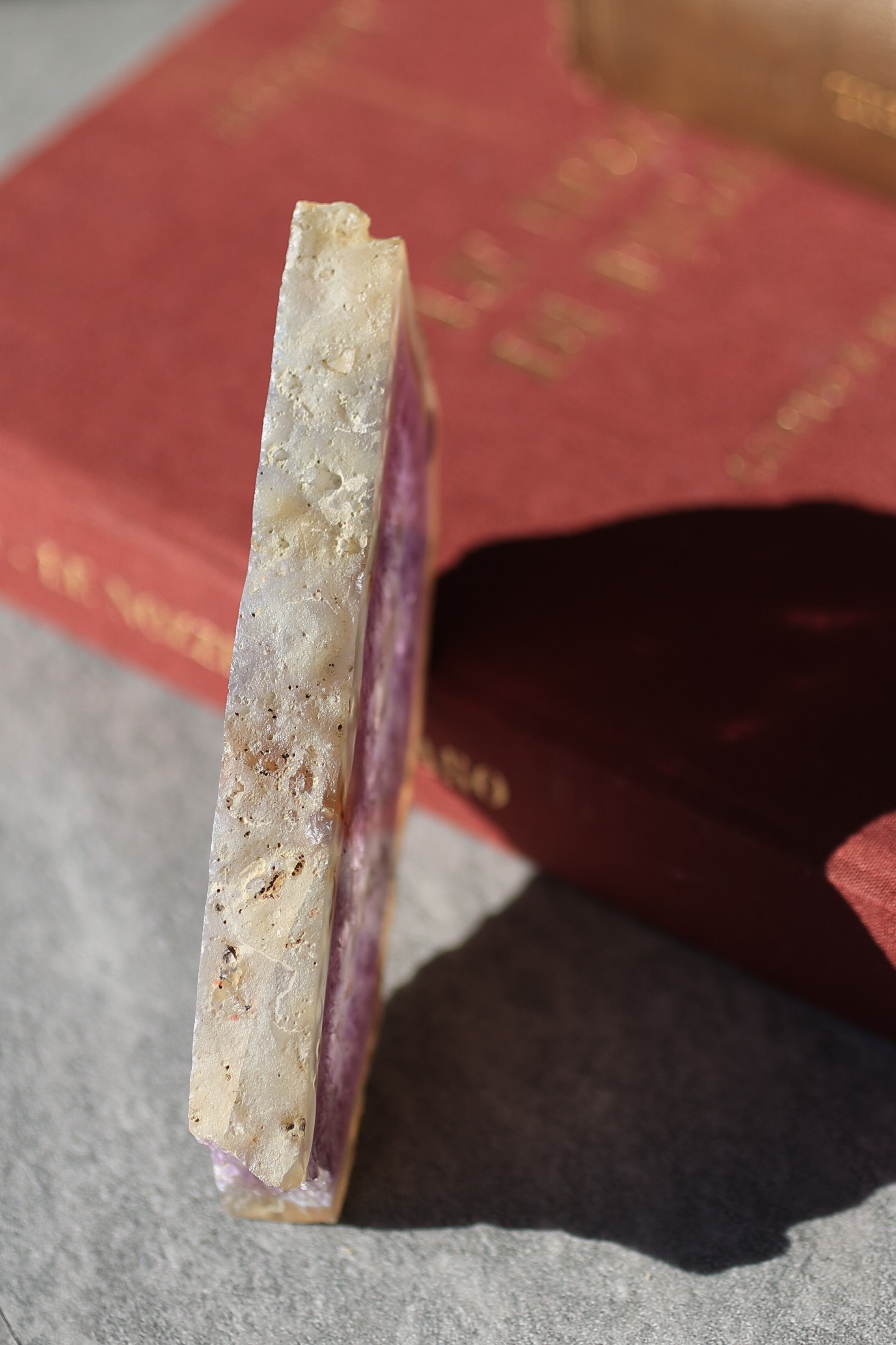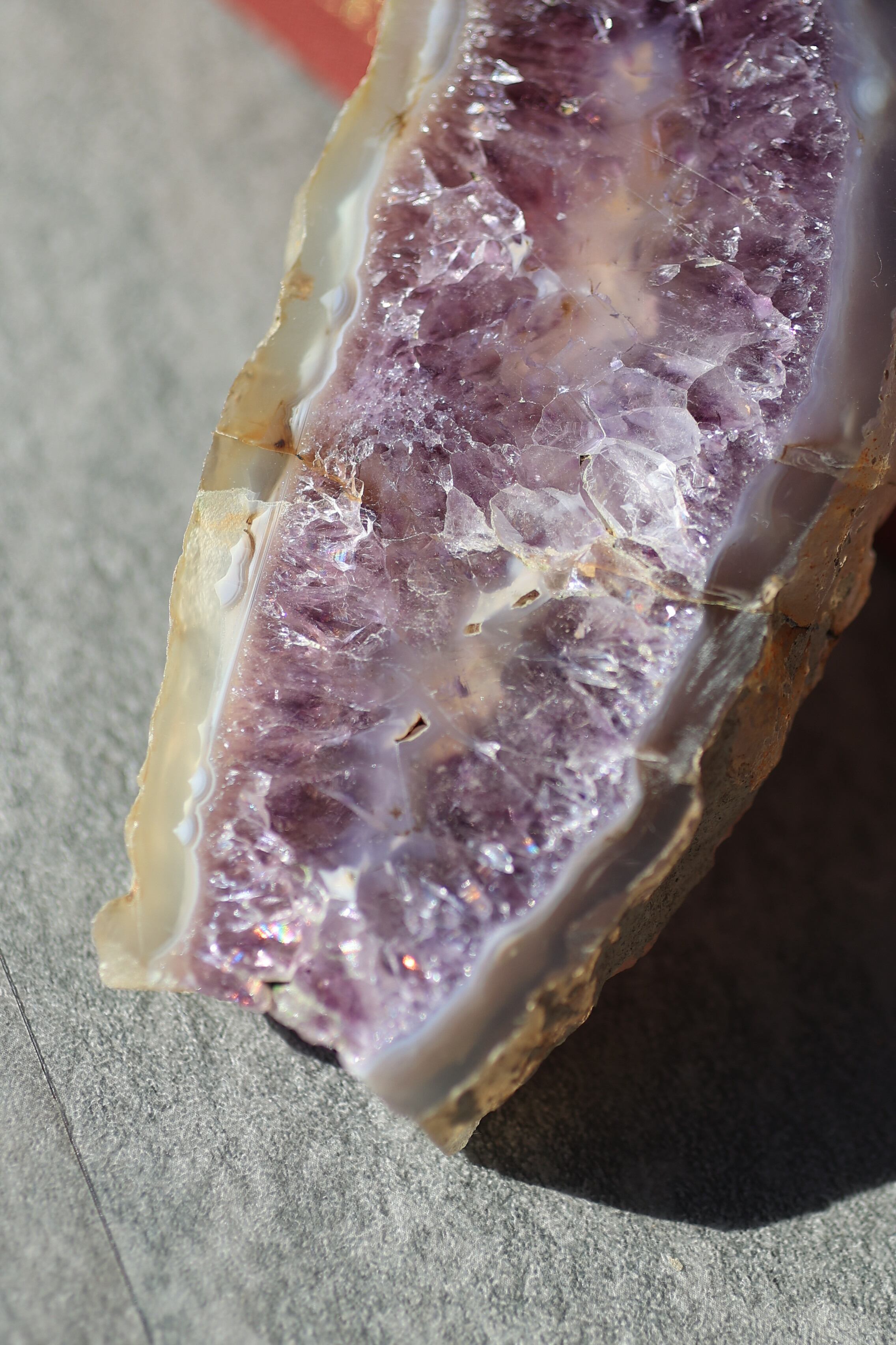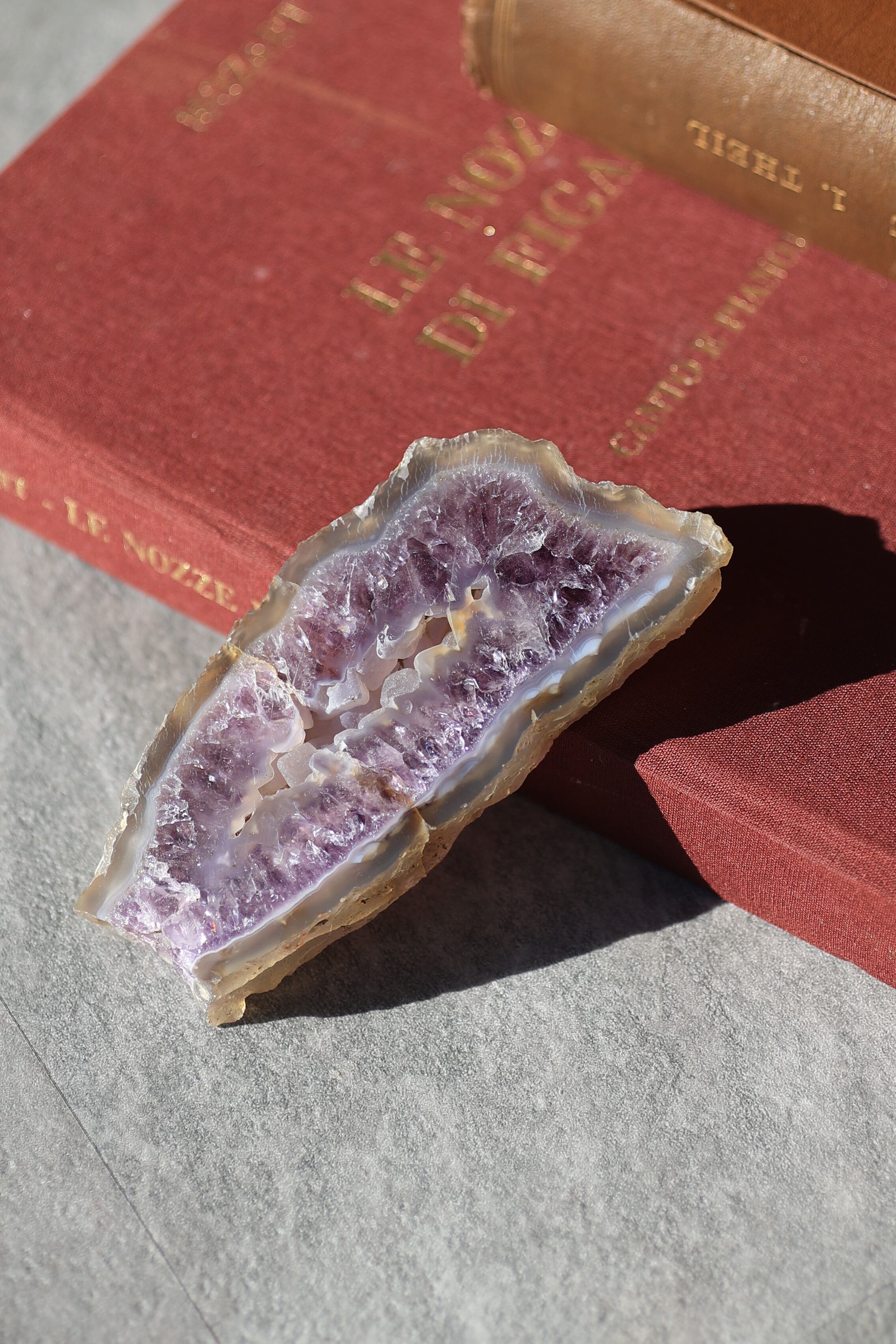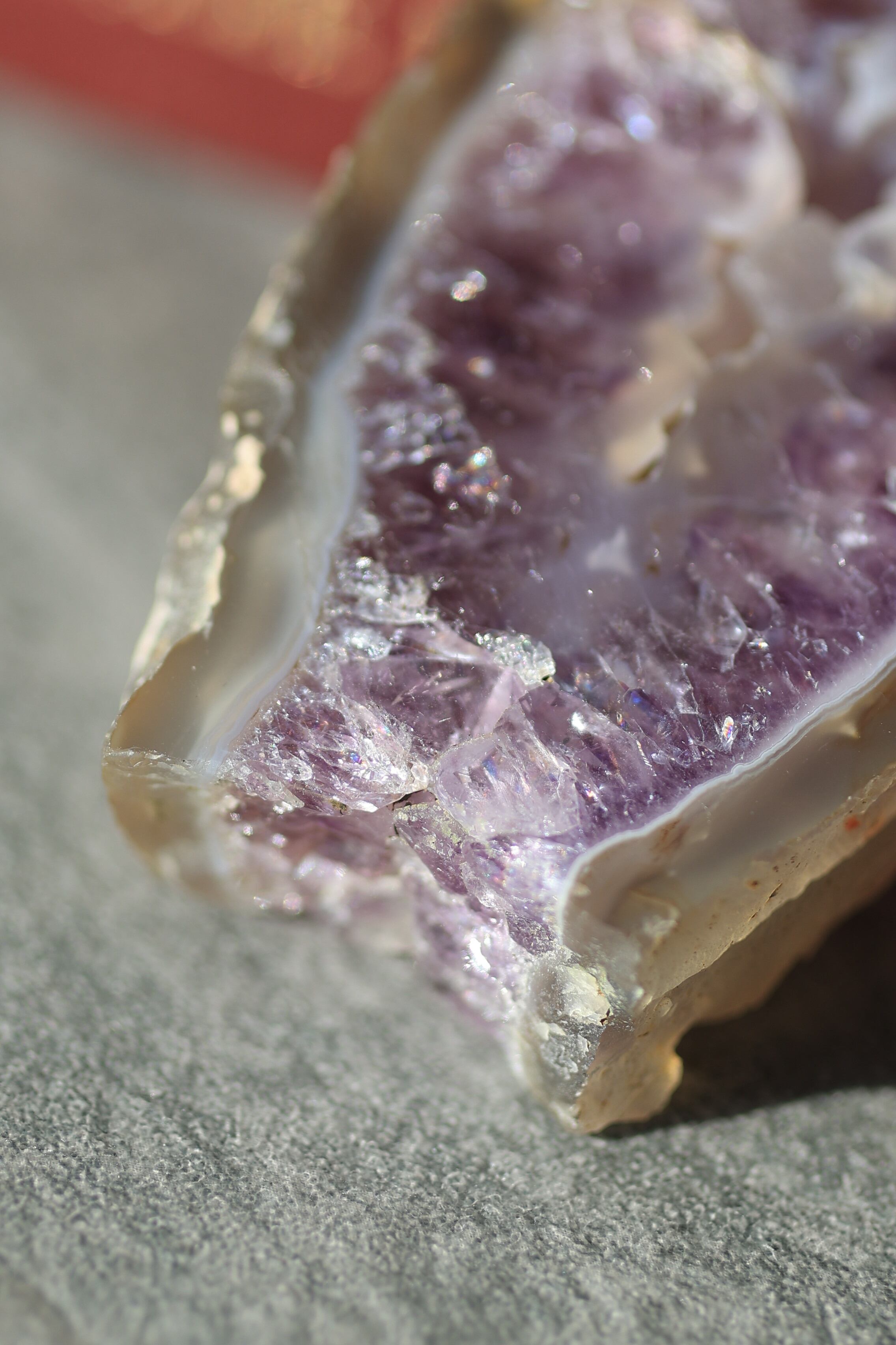 スライスされたアメジストは、原石の力強さと上品さが共存しており、
