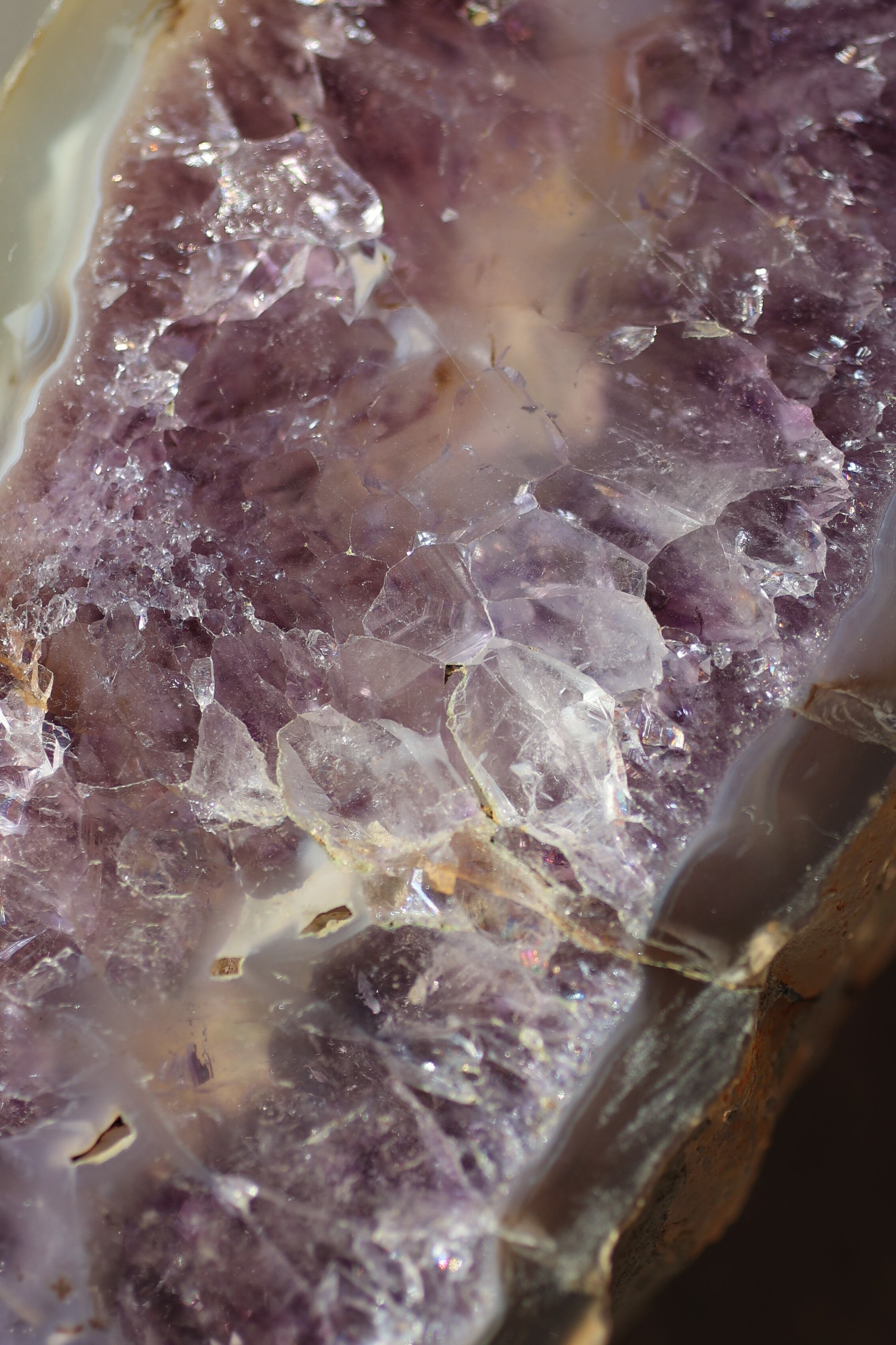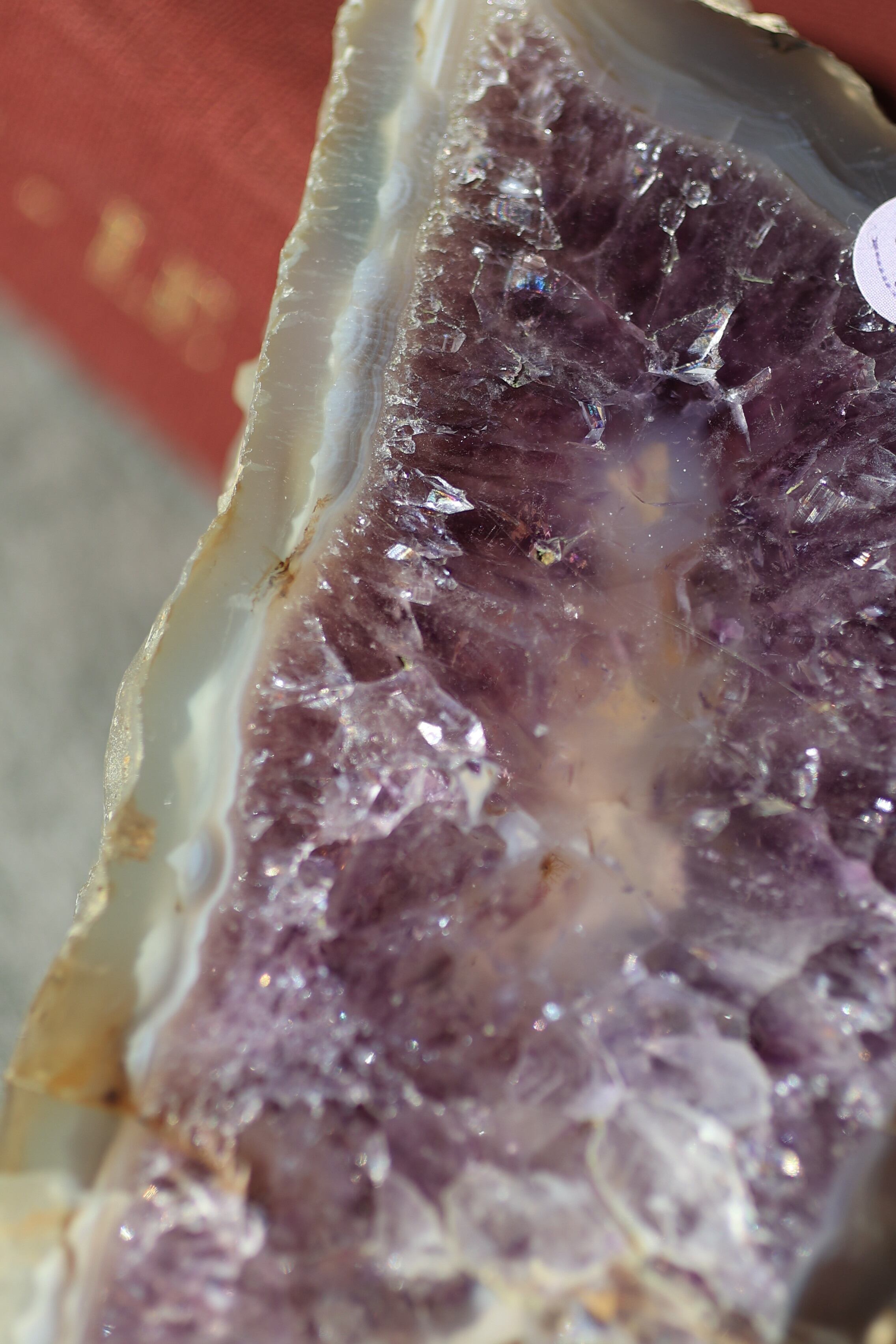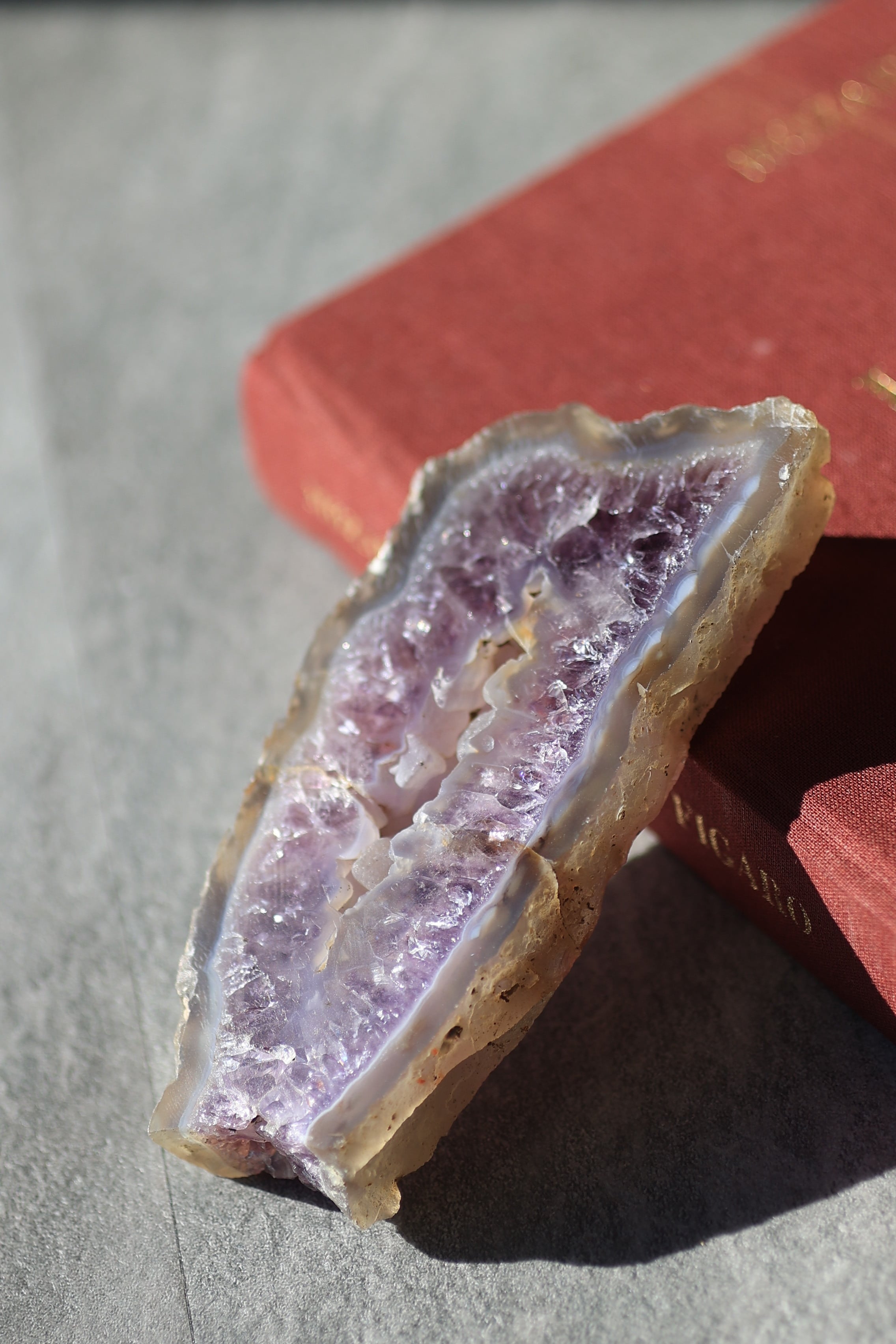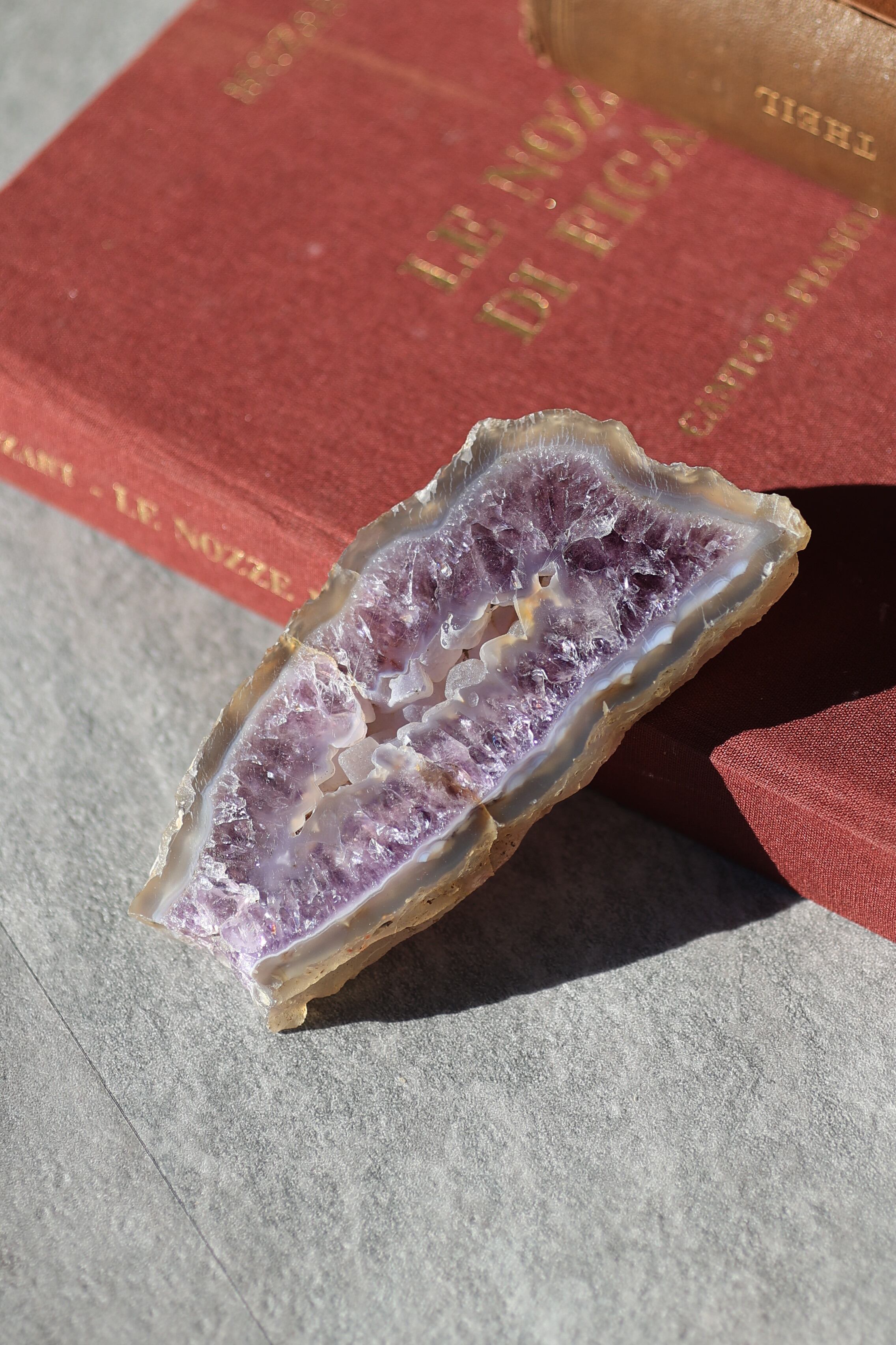 スライスされたアメジストは、原石の力強さと上品さが共存しており、