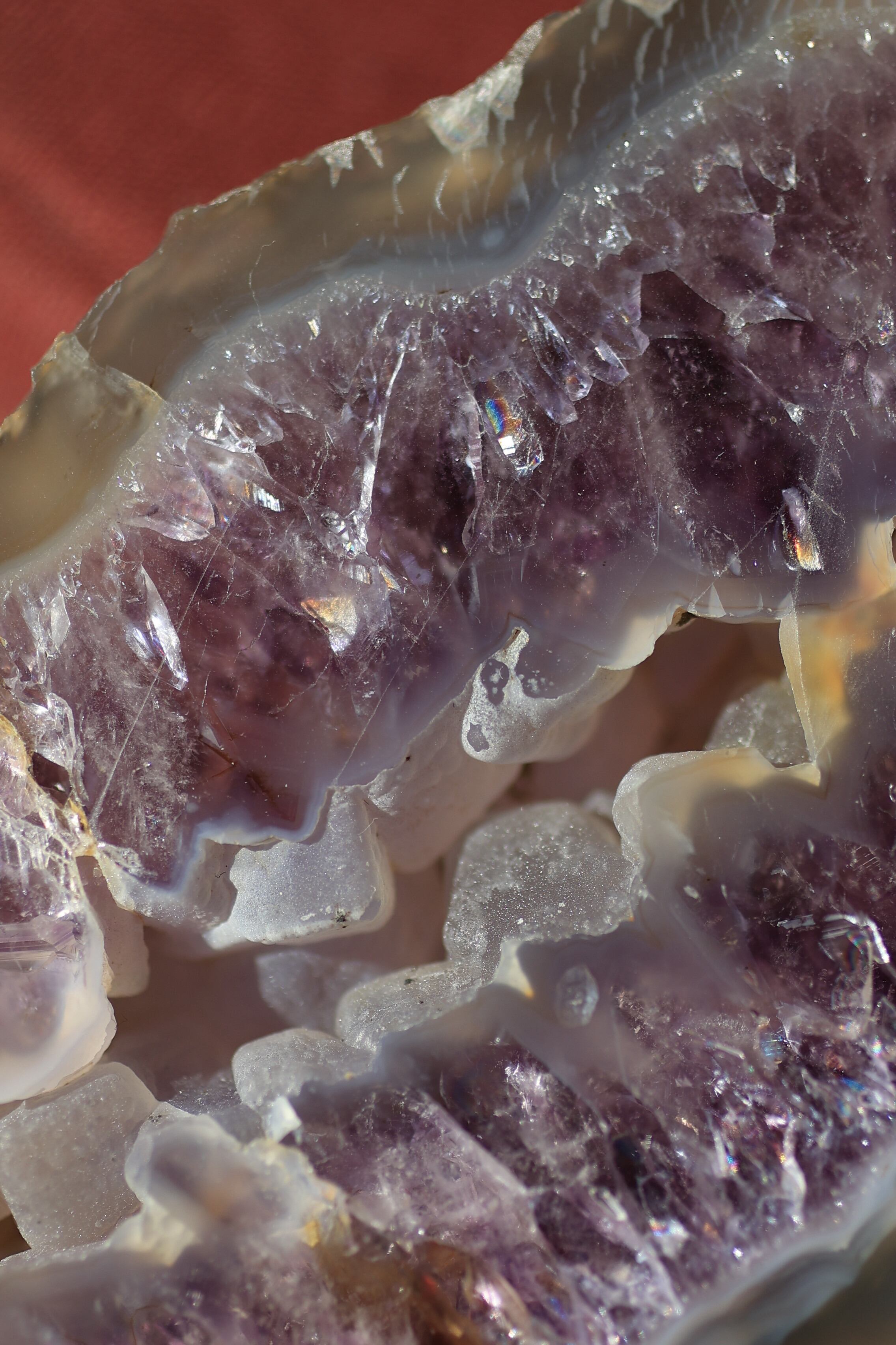 インドの大地で育ったアメジストを薄くスライスし、中に隠れていた結晶の世界をそのまま見せてくれるプレートです。