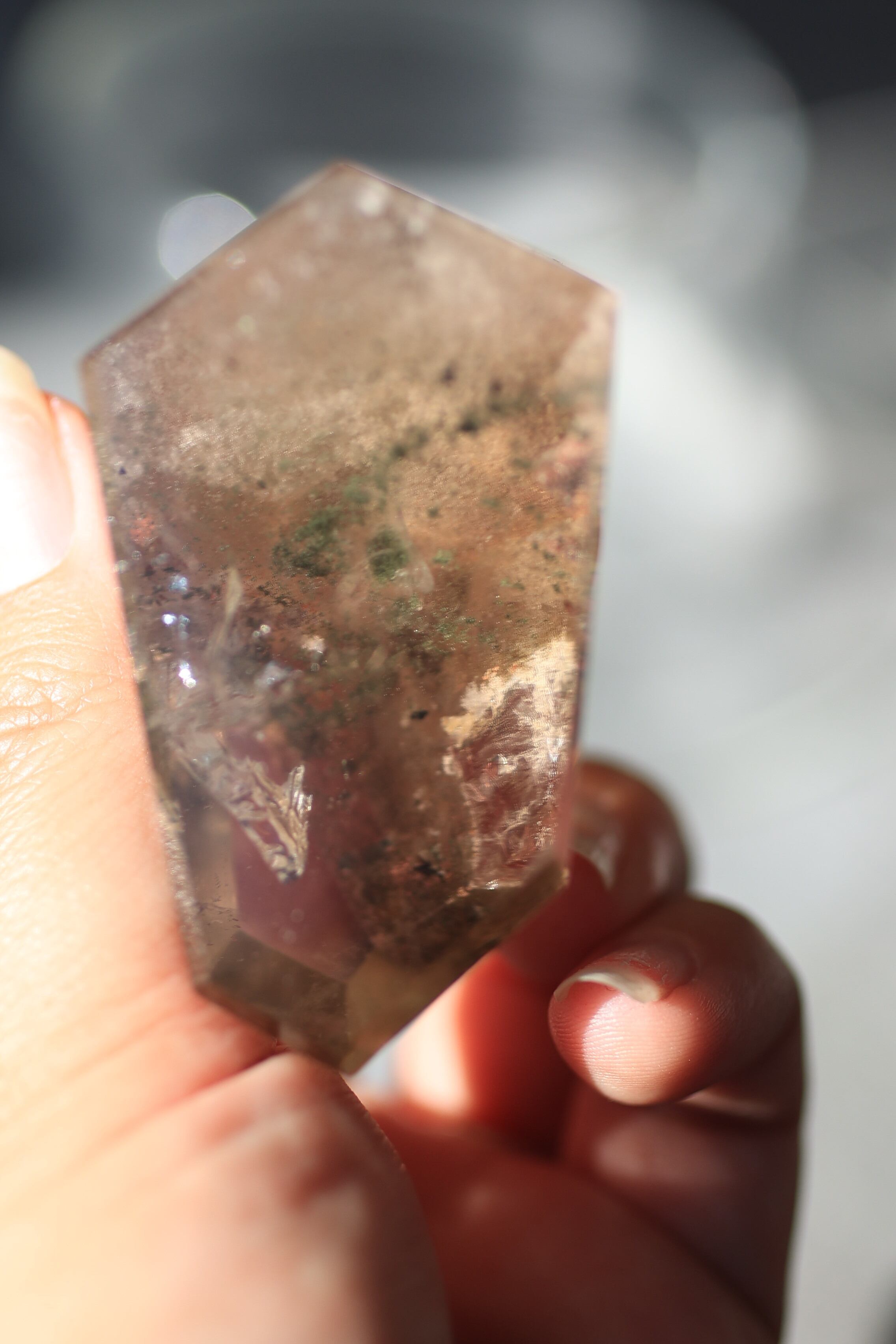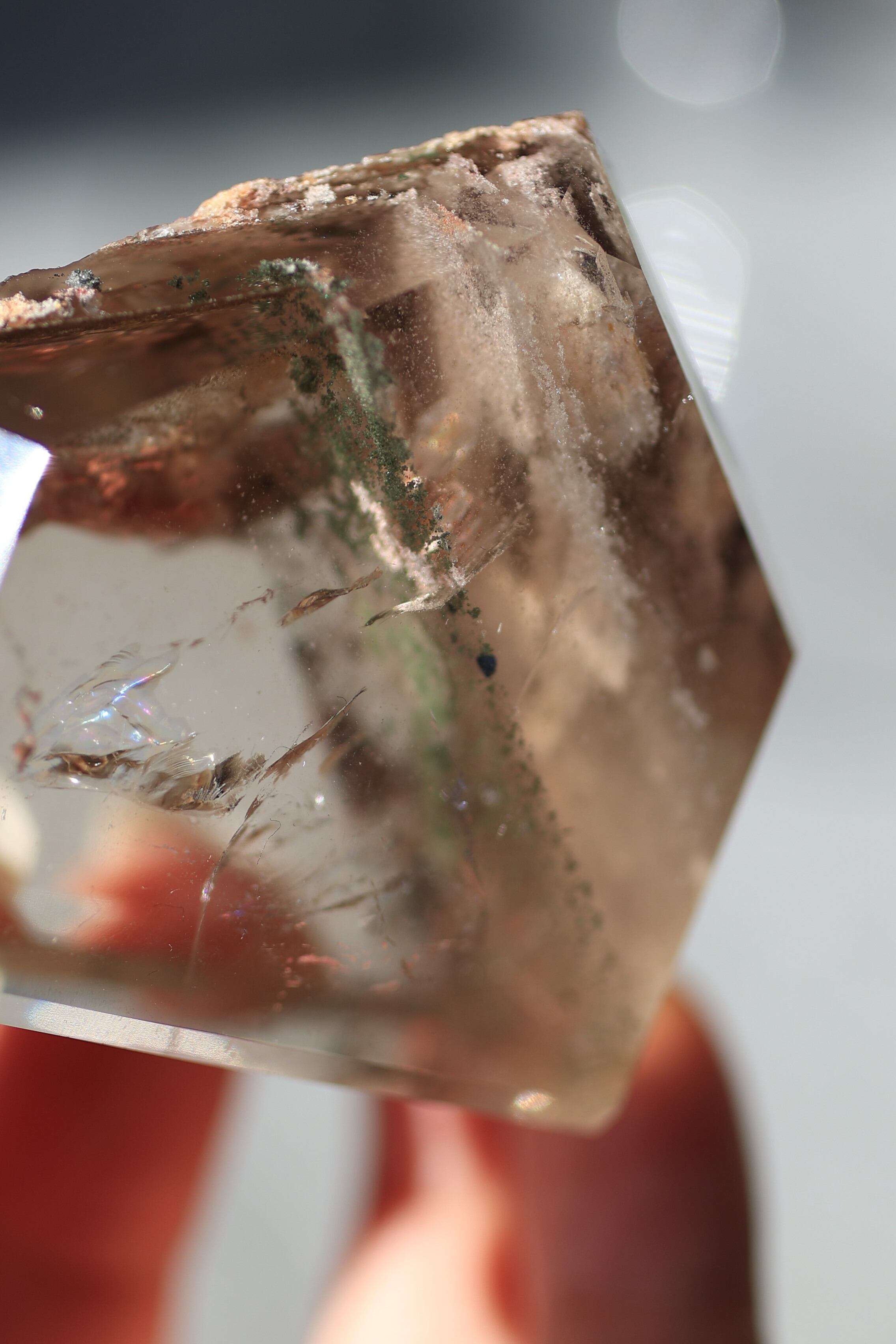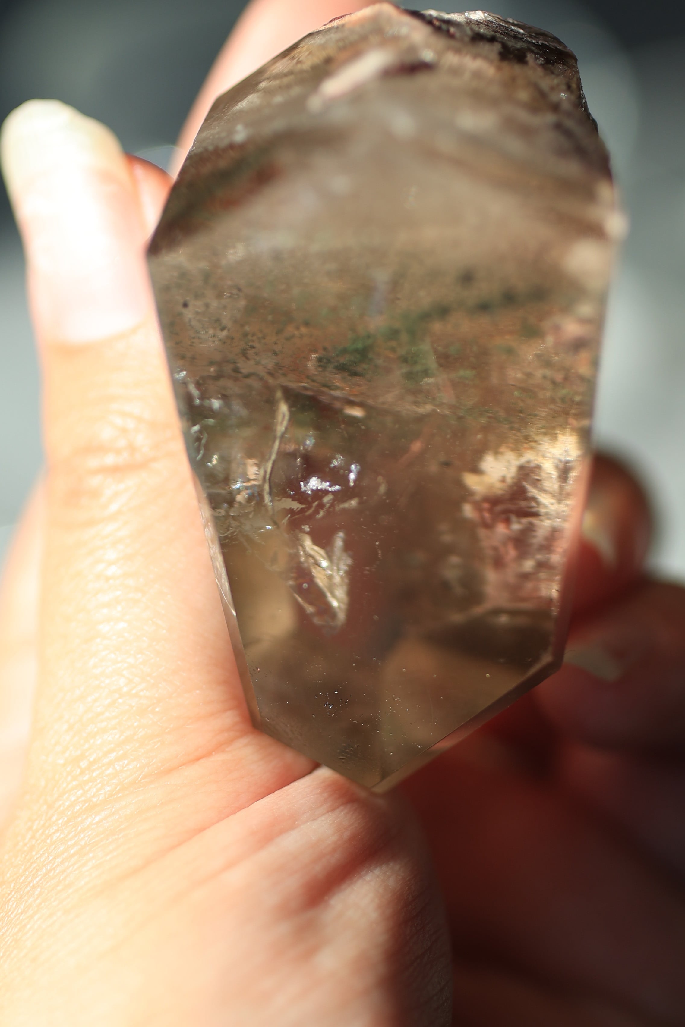 あなたの石には、柔らかなスモーキーカラーの水晶の中に、瑞々しいグリーンのインクルージョンが広がり、まるで深い森の一角を覗き込んでいるような優しい印象があります。