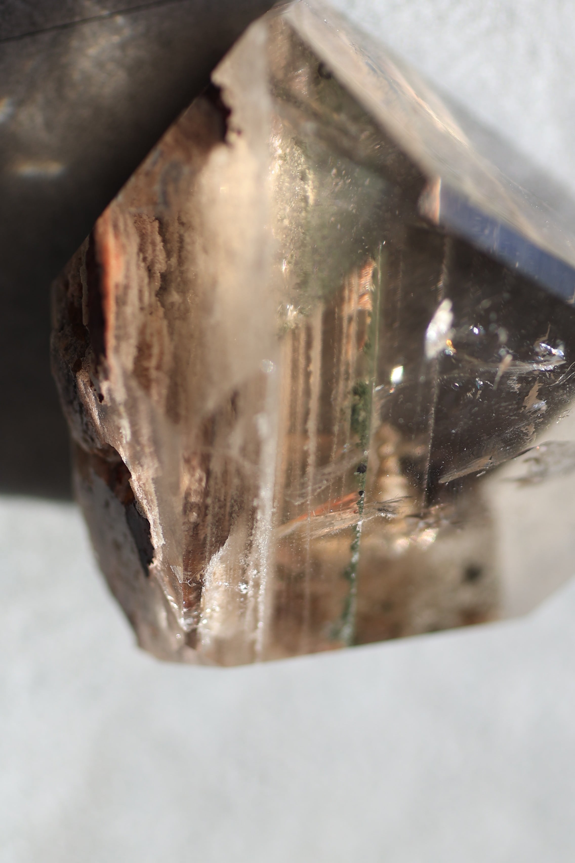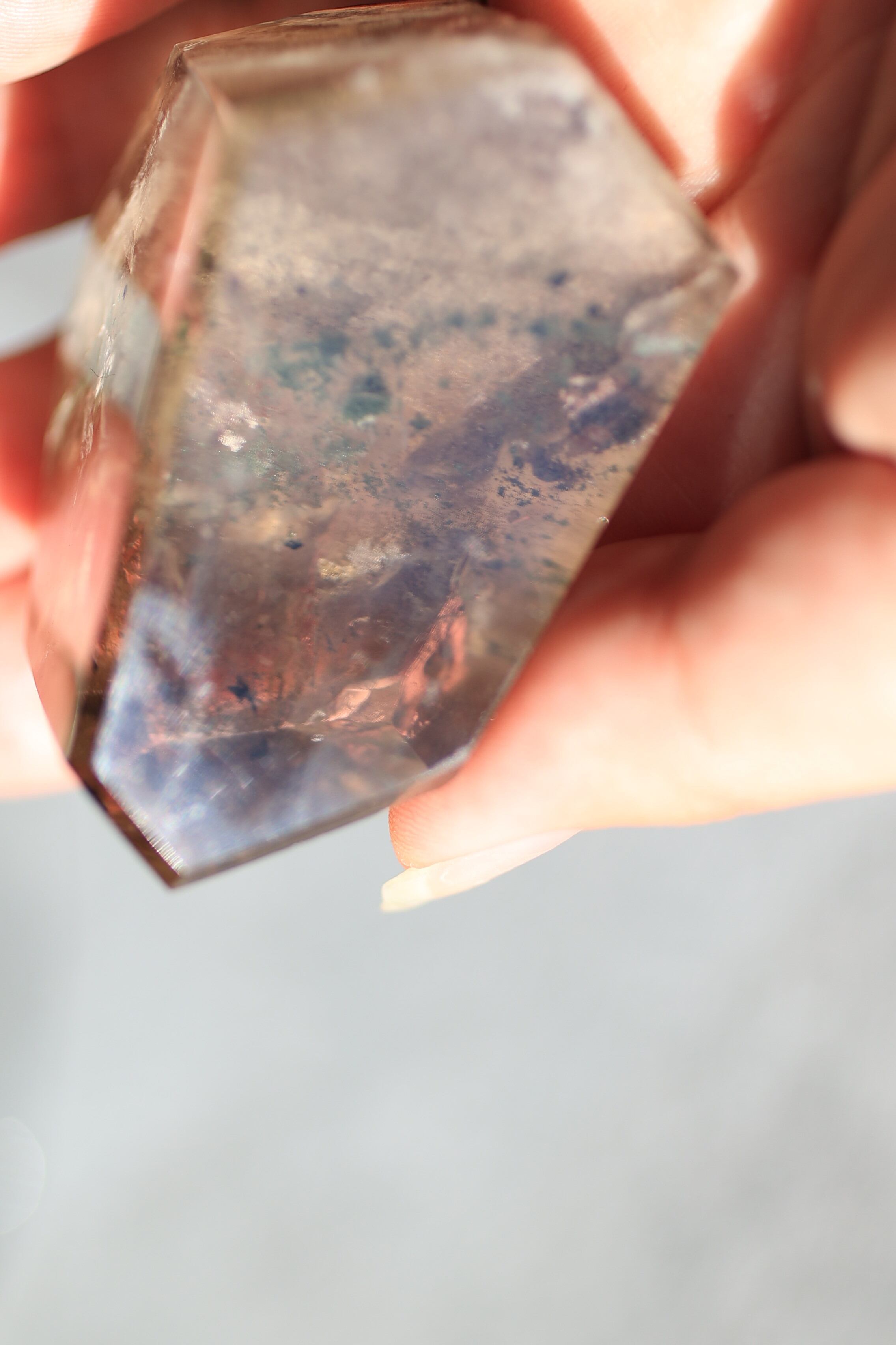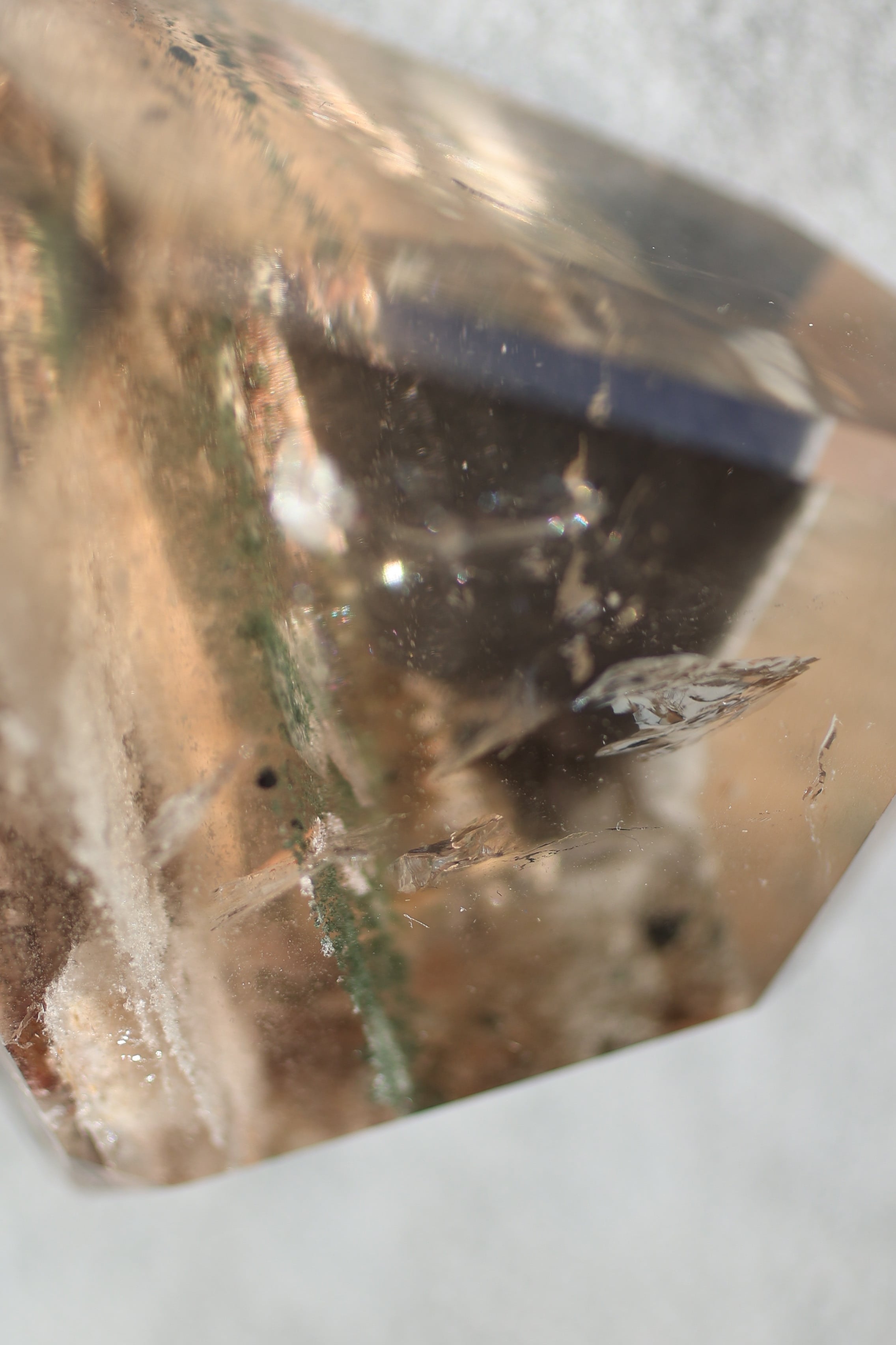 あなたの石には、柔らかなスモーキーカラーの水晶の中に、瑞々しいグリーンのインクルージョンが広がり、まるで深い森の一角を覗き込んでいるような優しい印象があります。