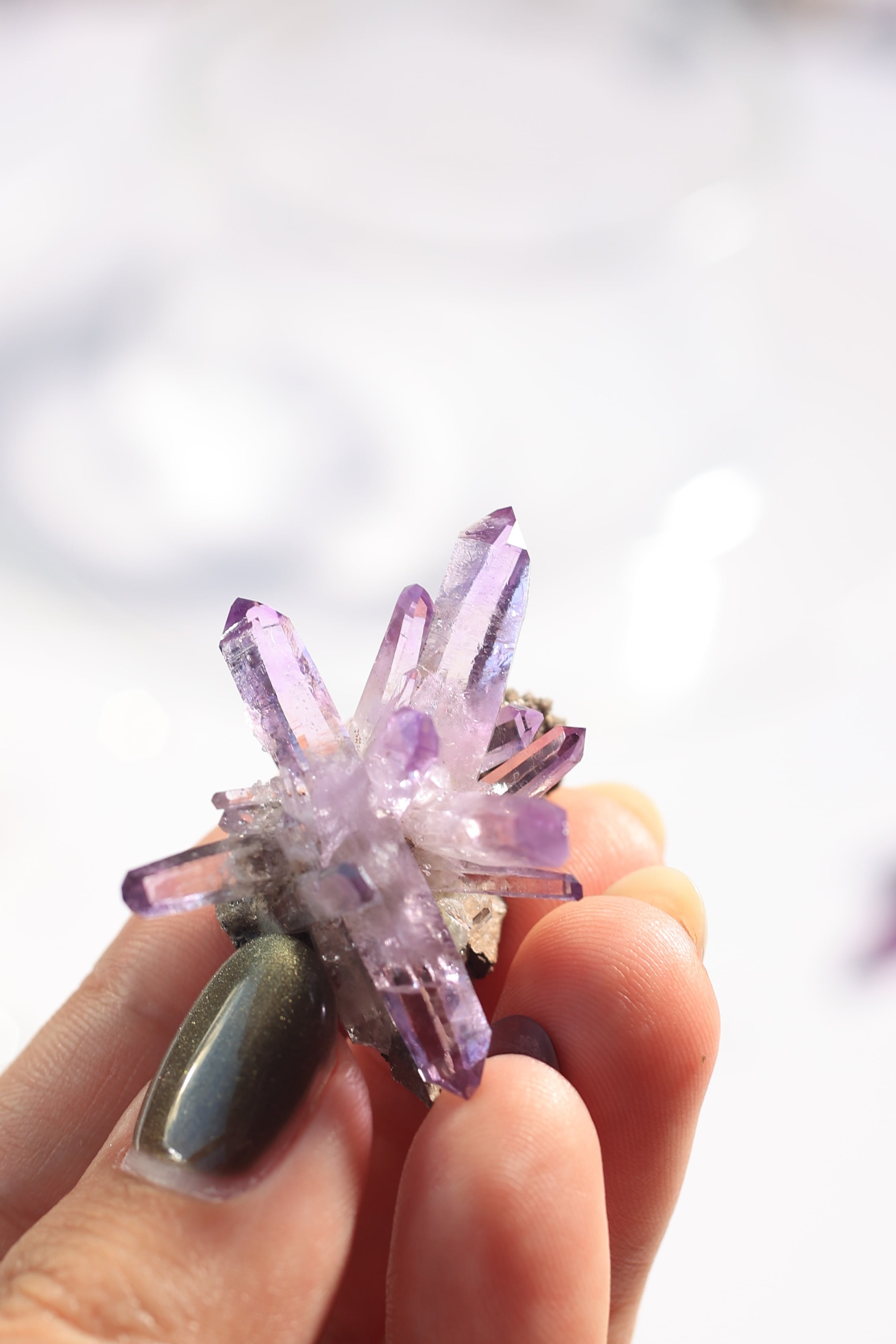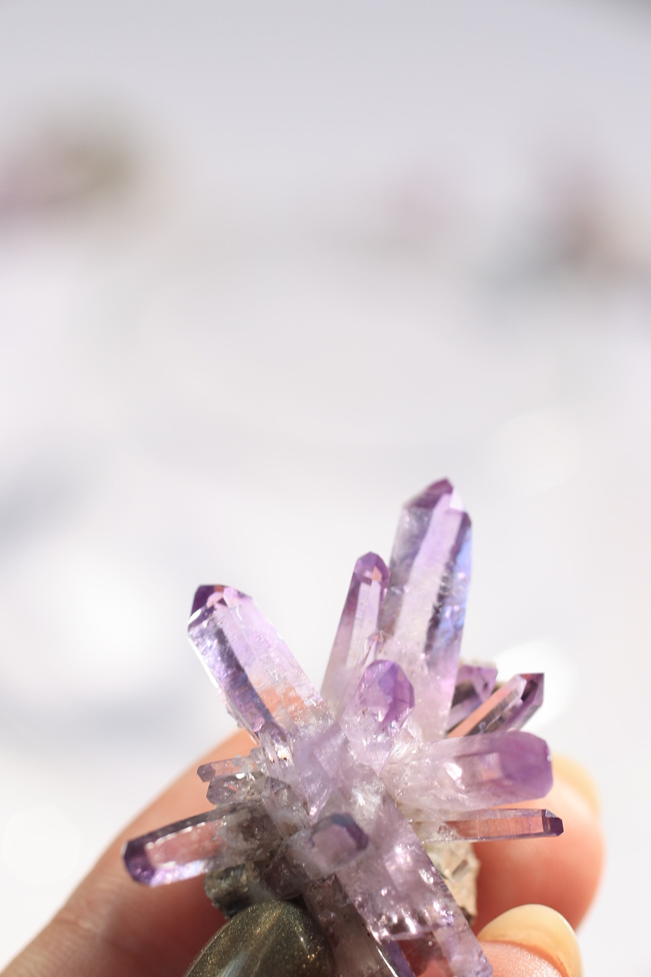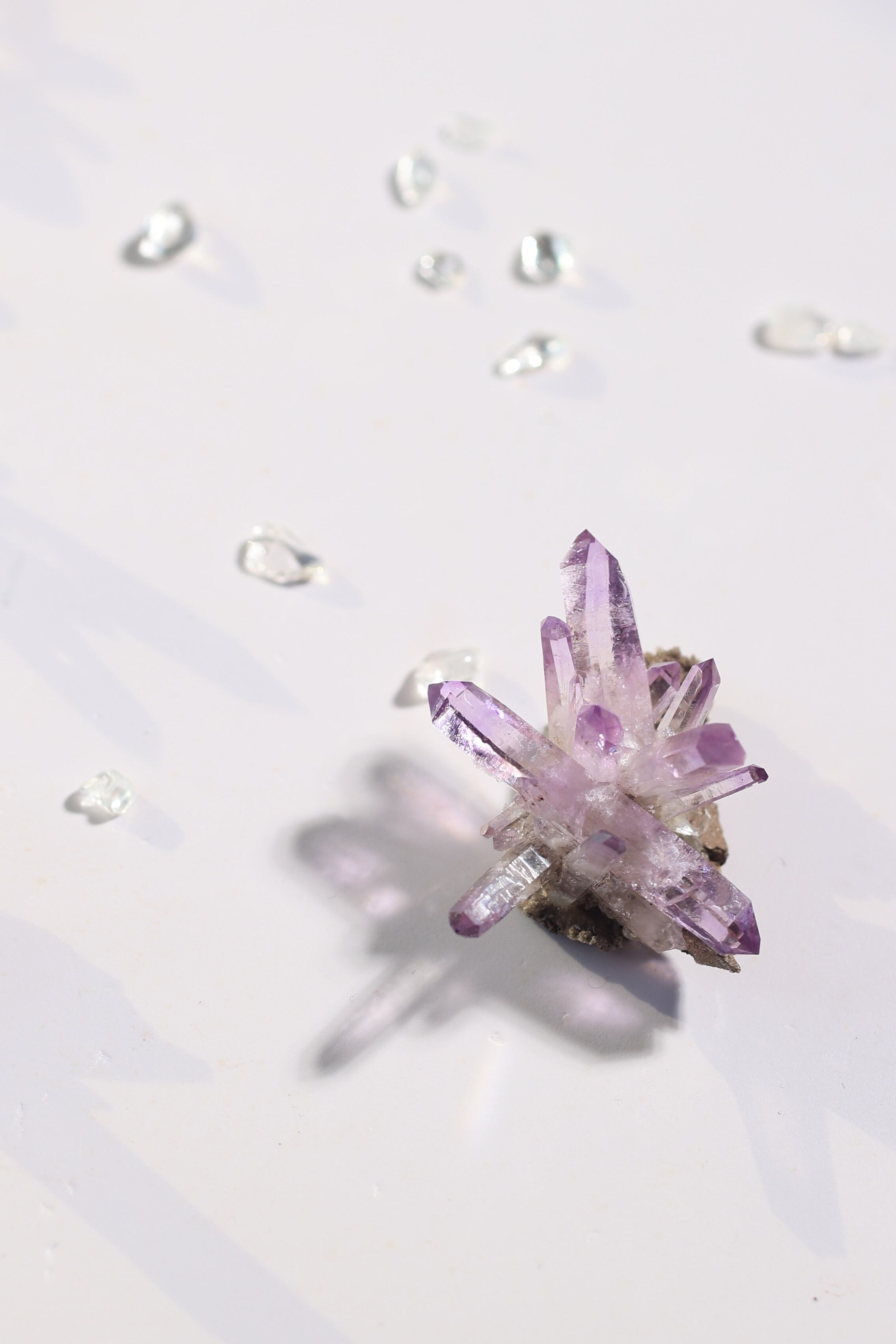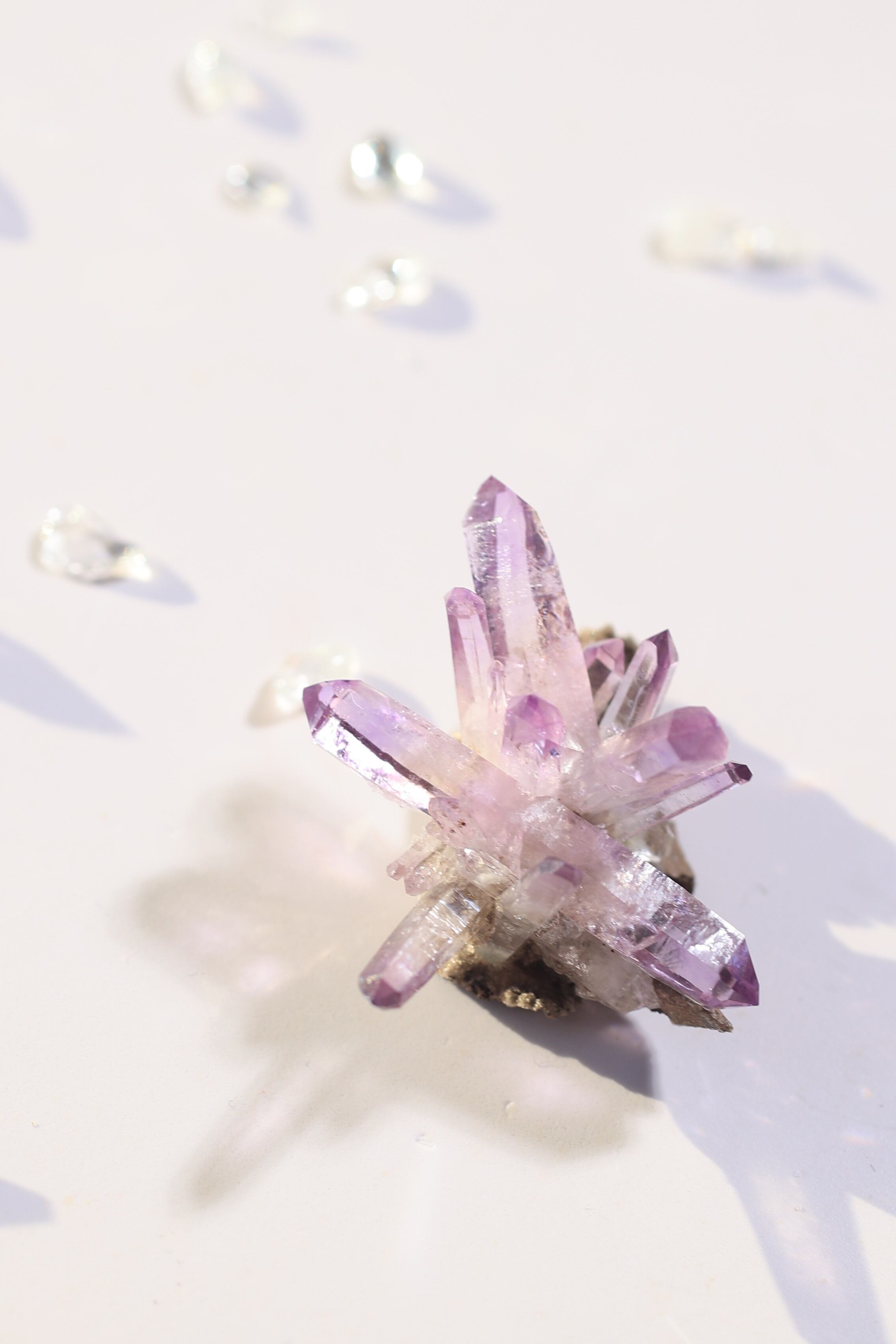 透明度が非常に高く、結晶は細くすらりと伸び、軽やかな印象を与えます。