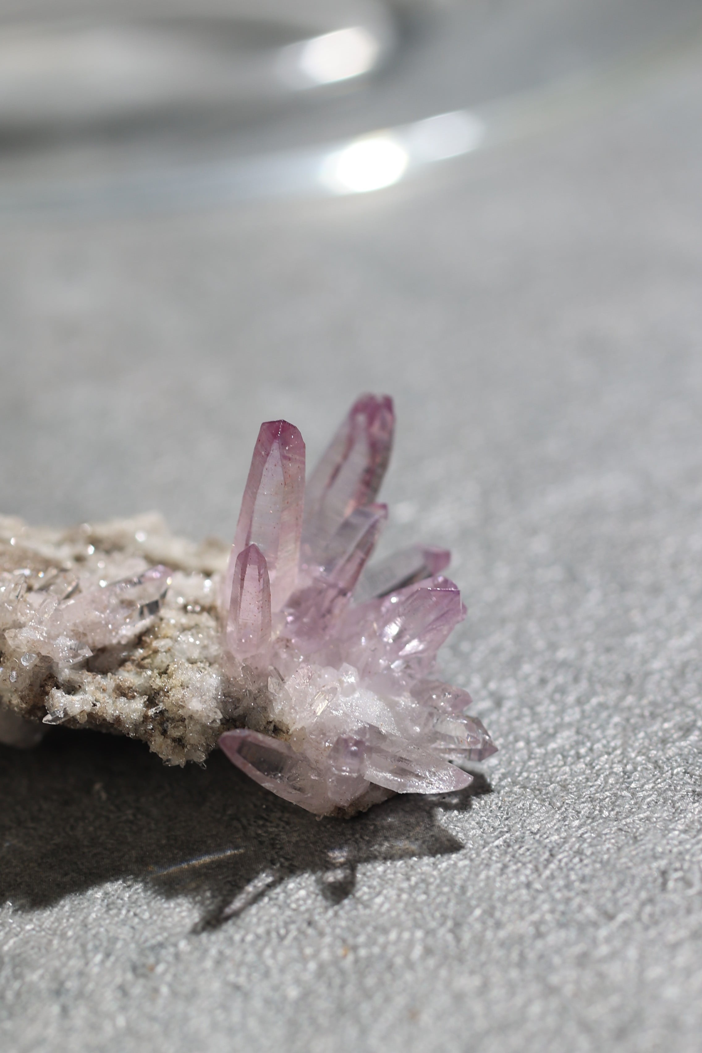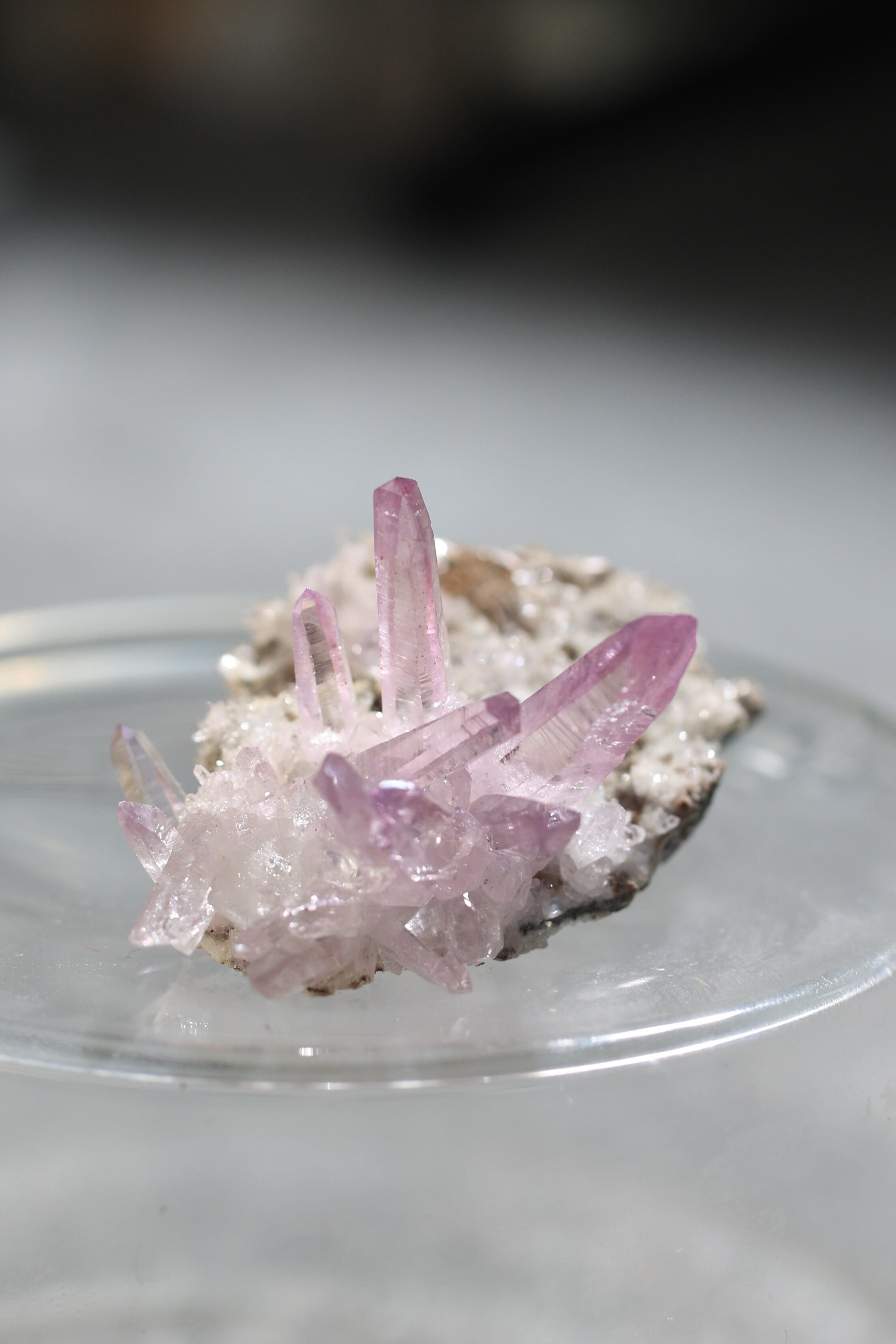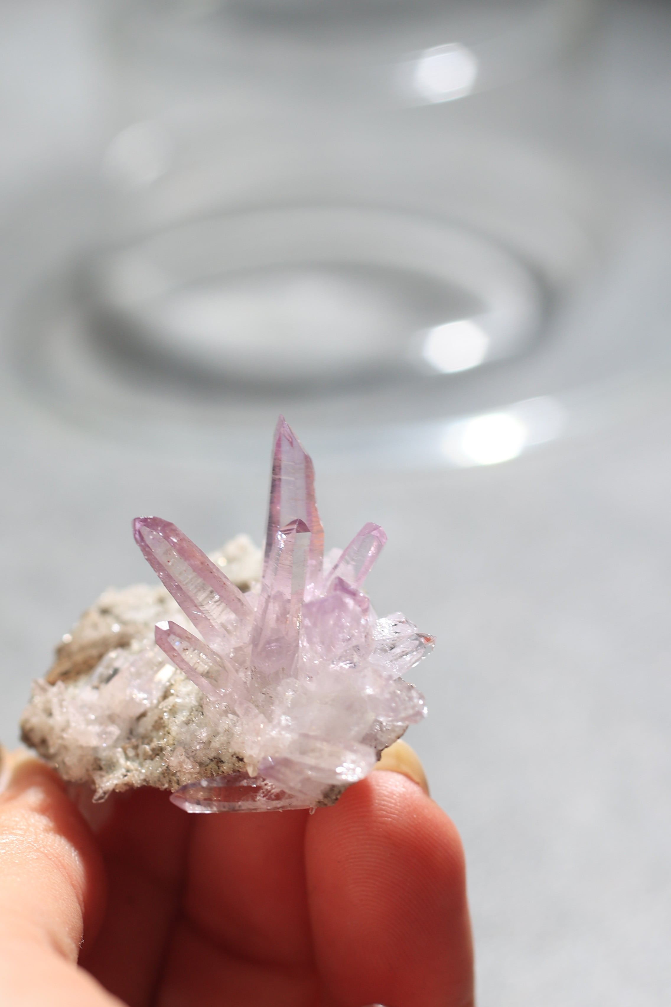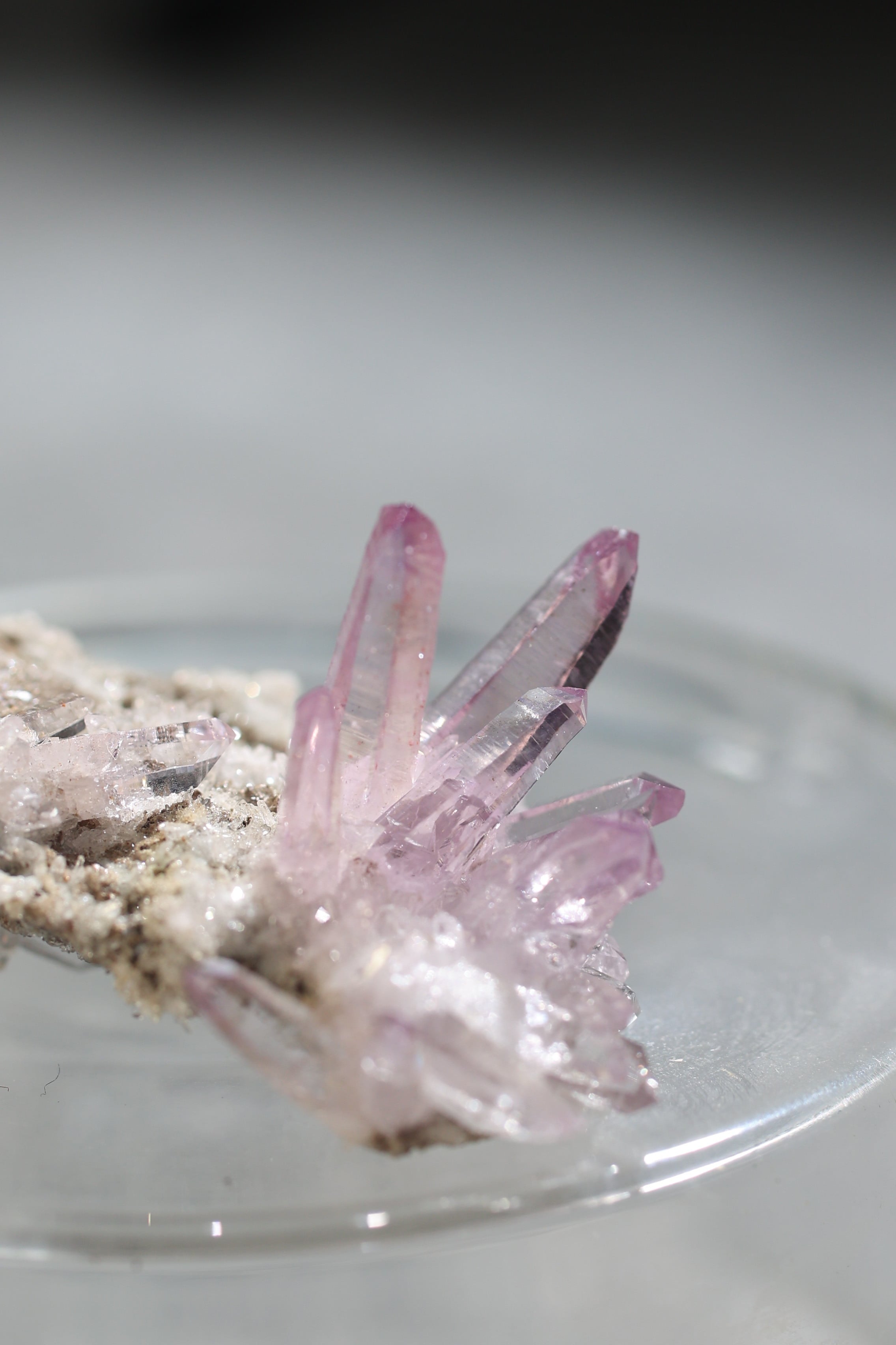 透明度が非常に高く、結晶は細くすらりと伸び、軽やかな印象を与えます。