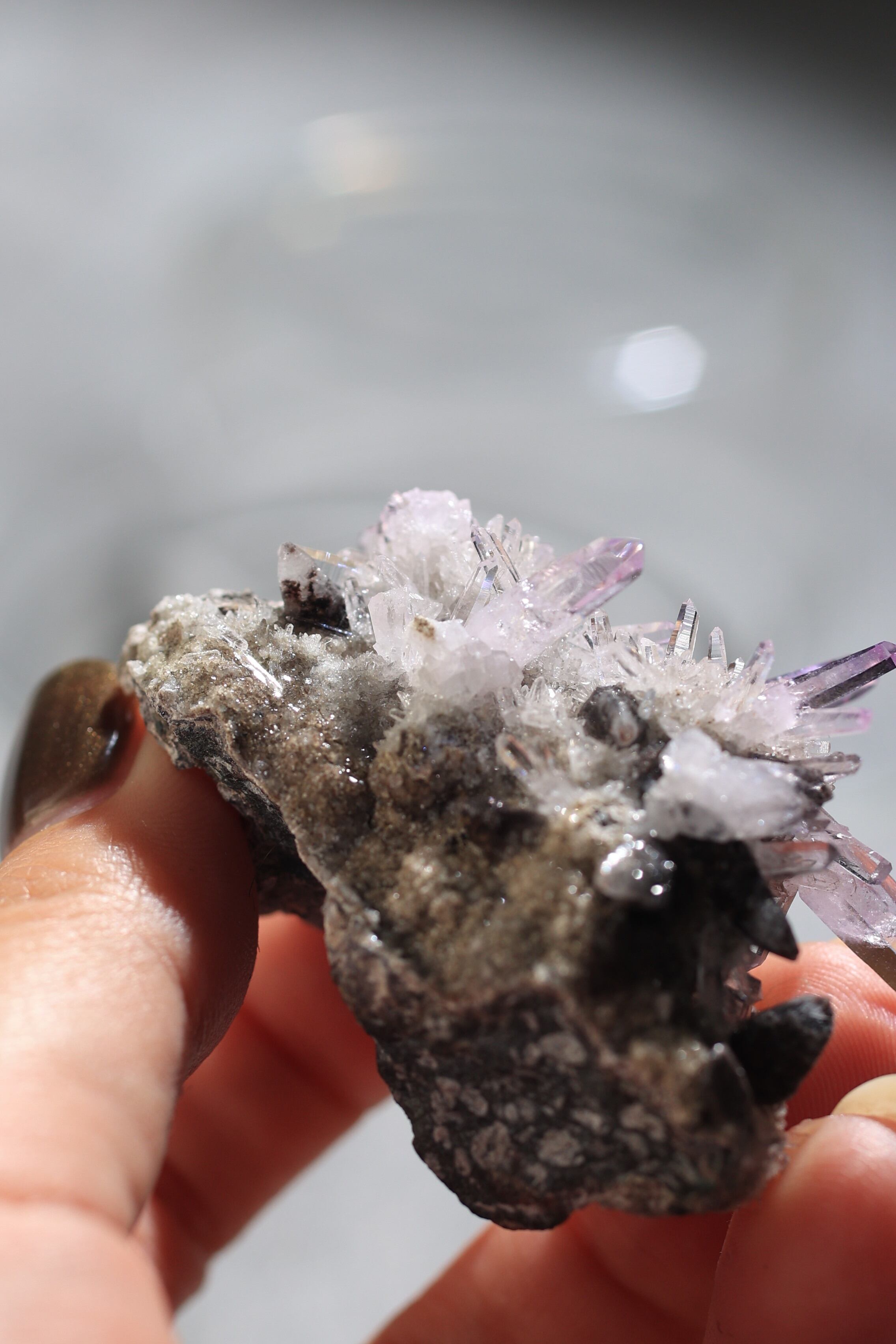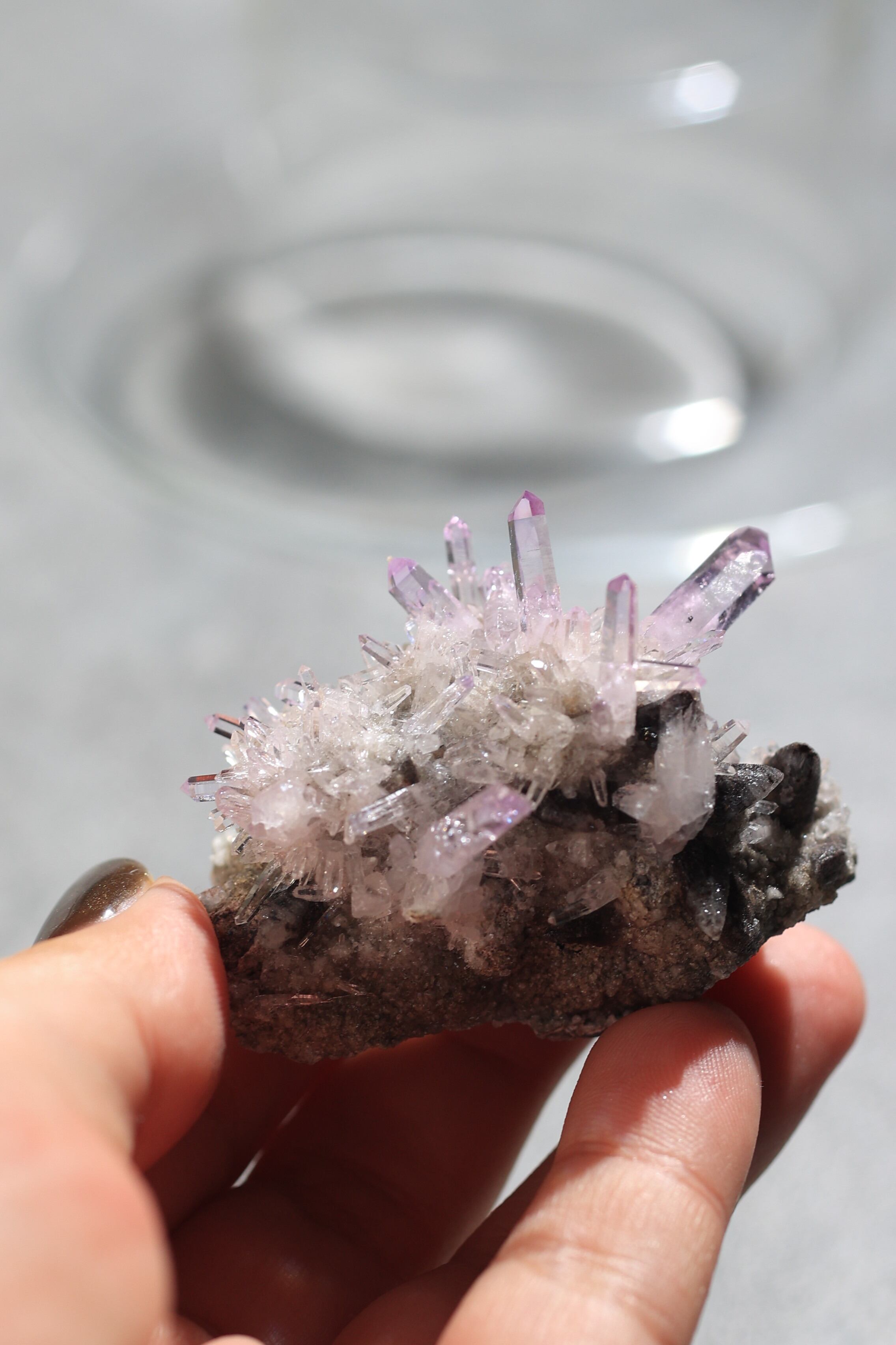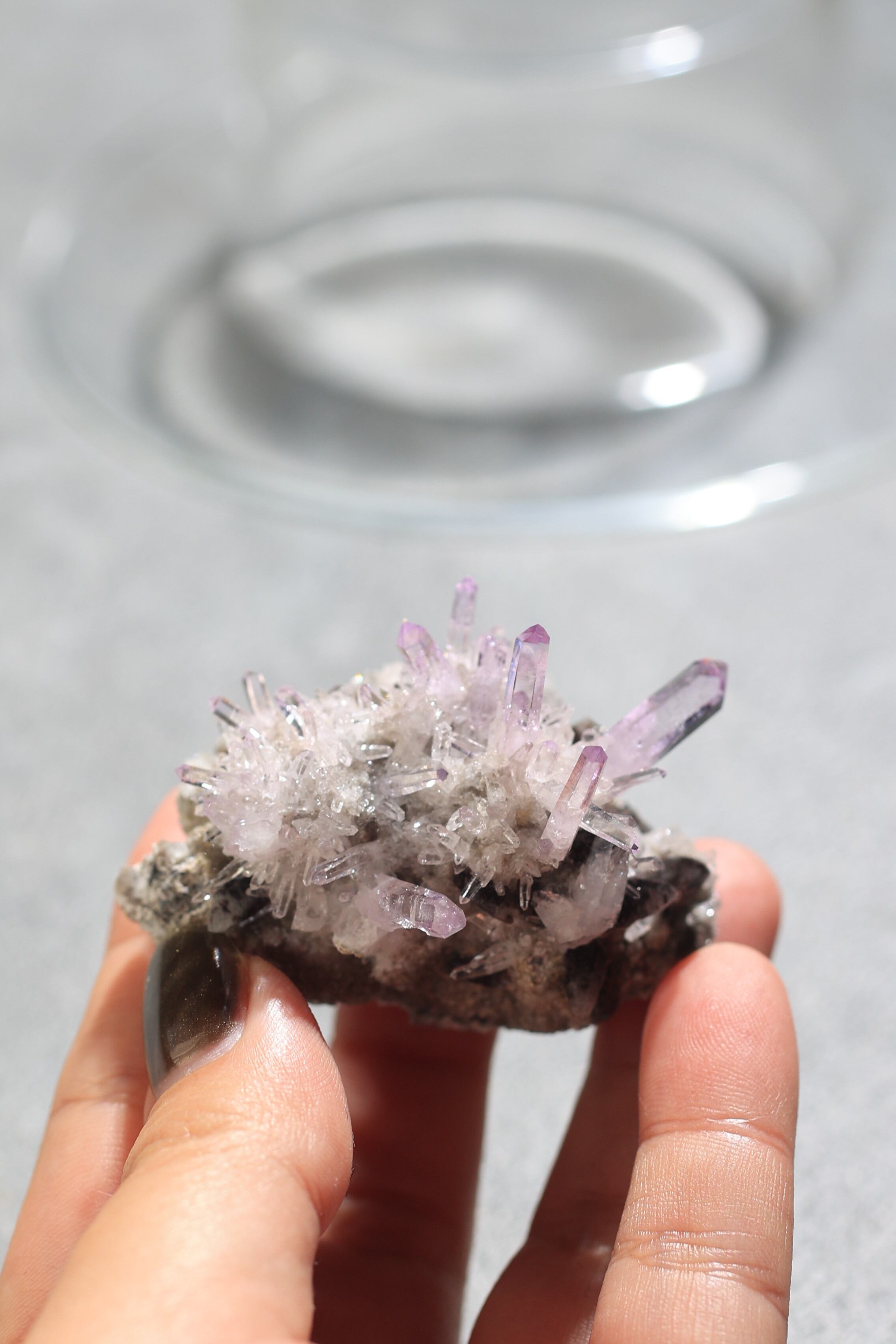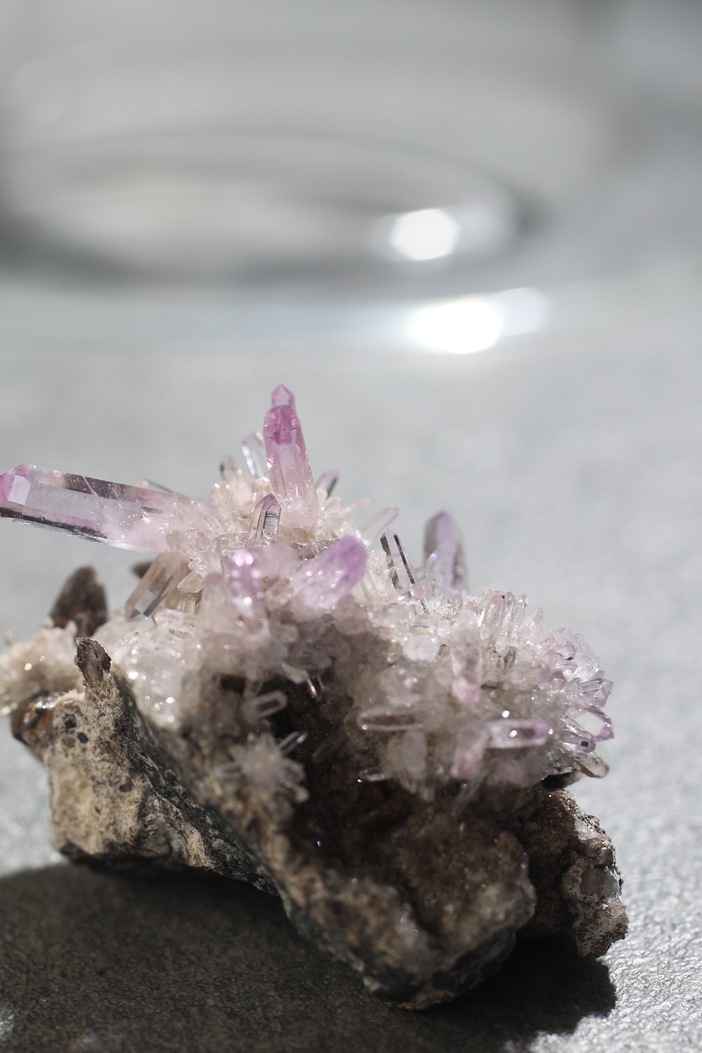 透明度が非常に高く、結晶は細くすらりと伸び、軽やかな印象を与えます。