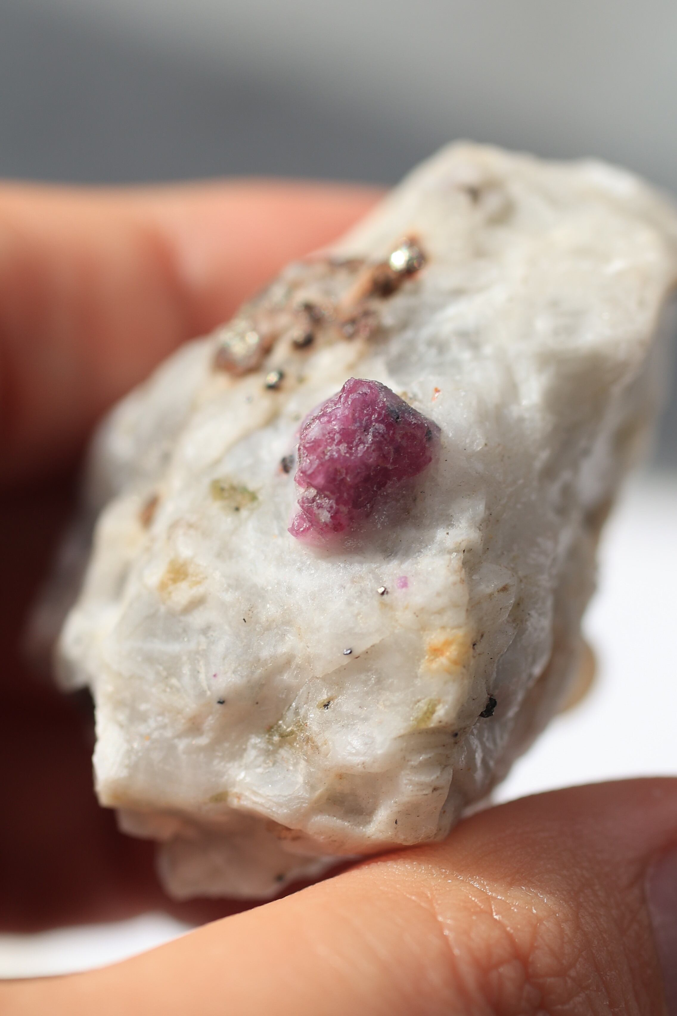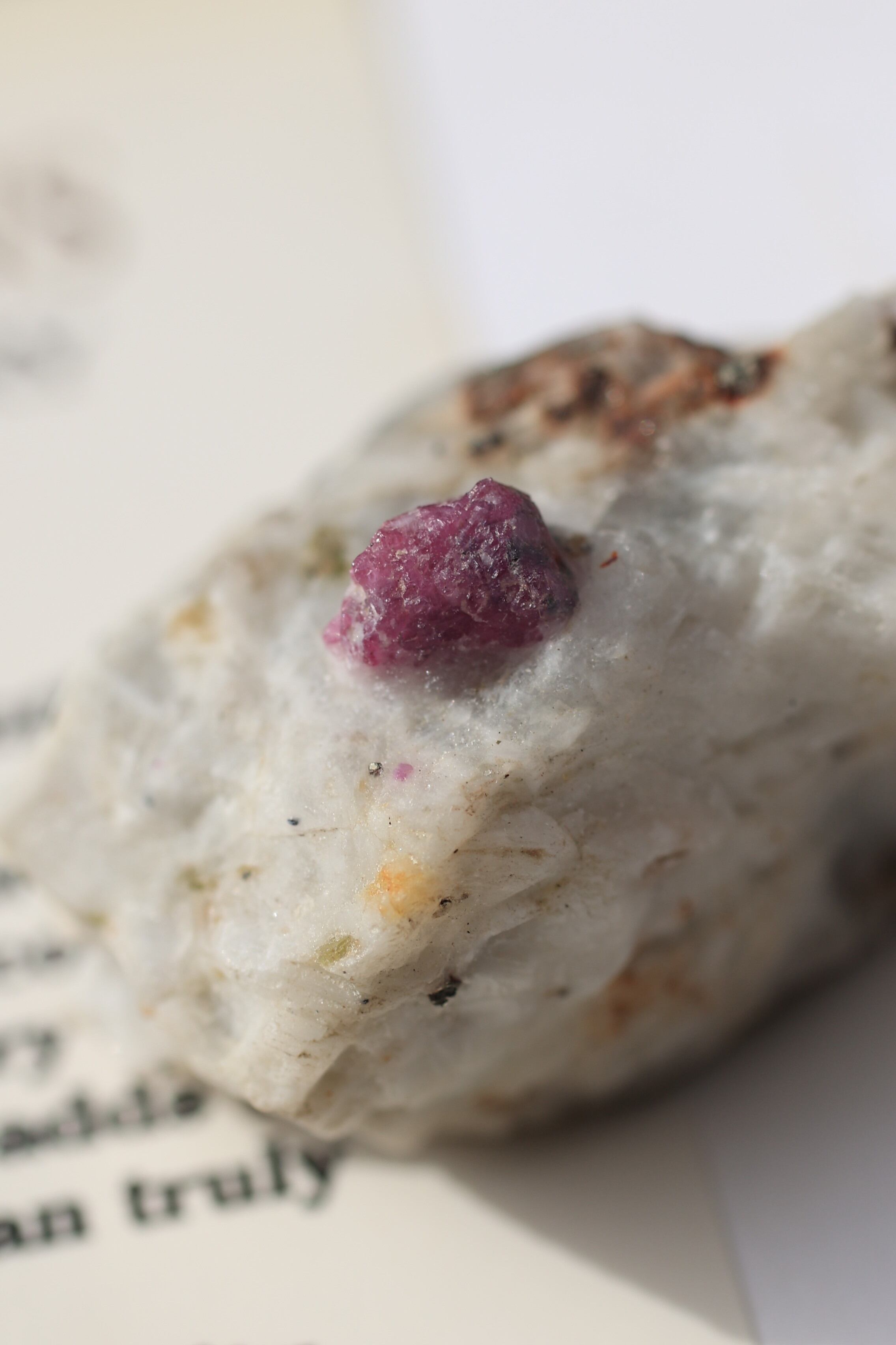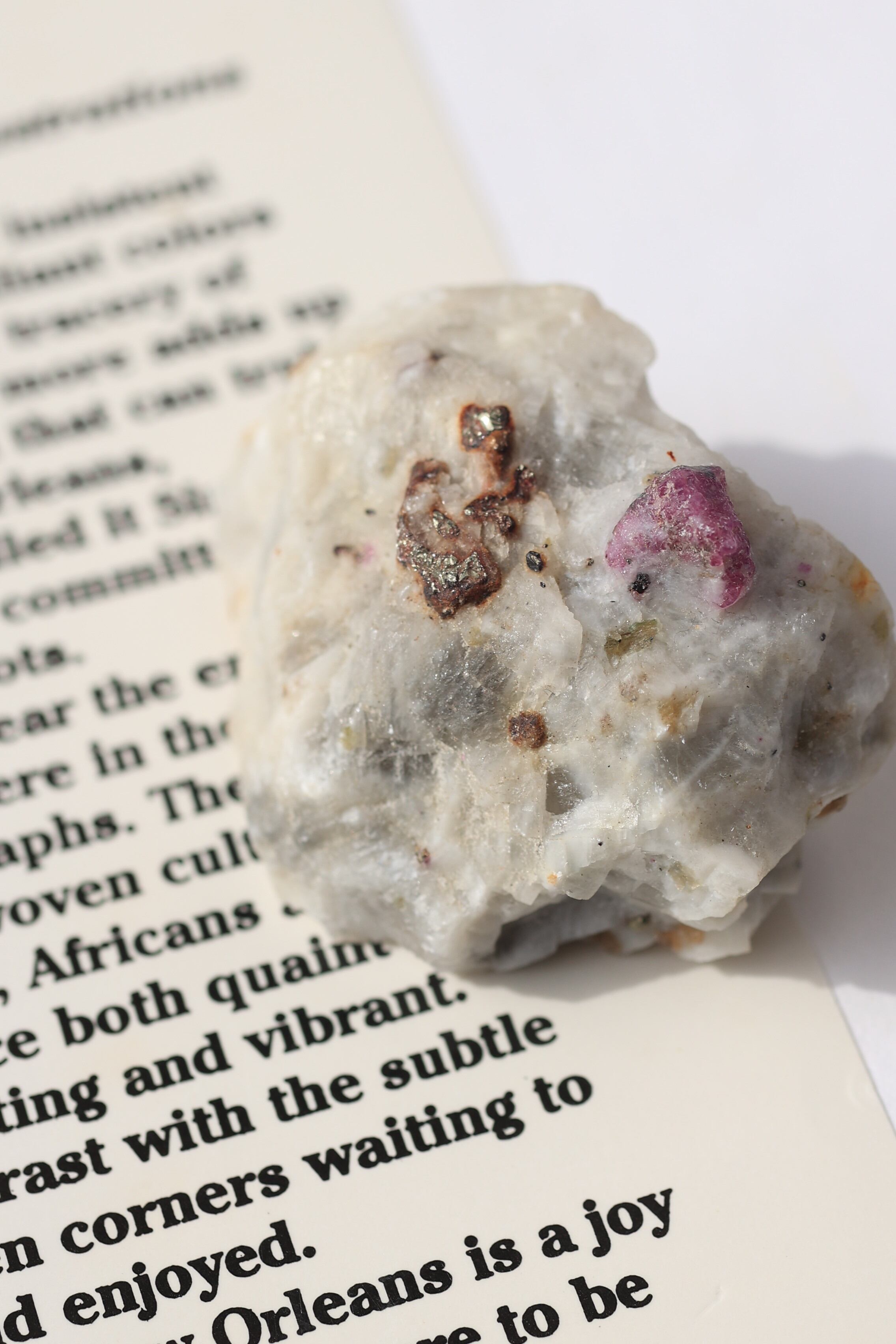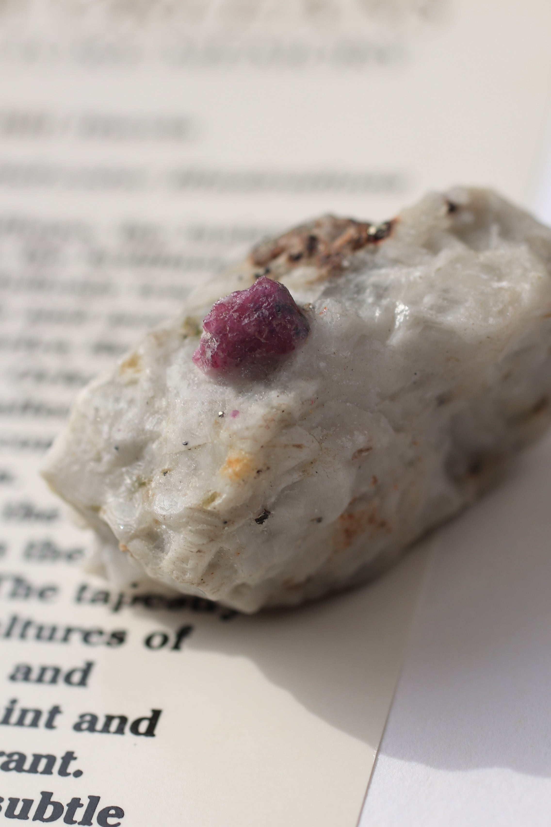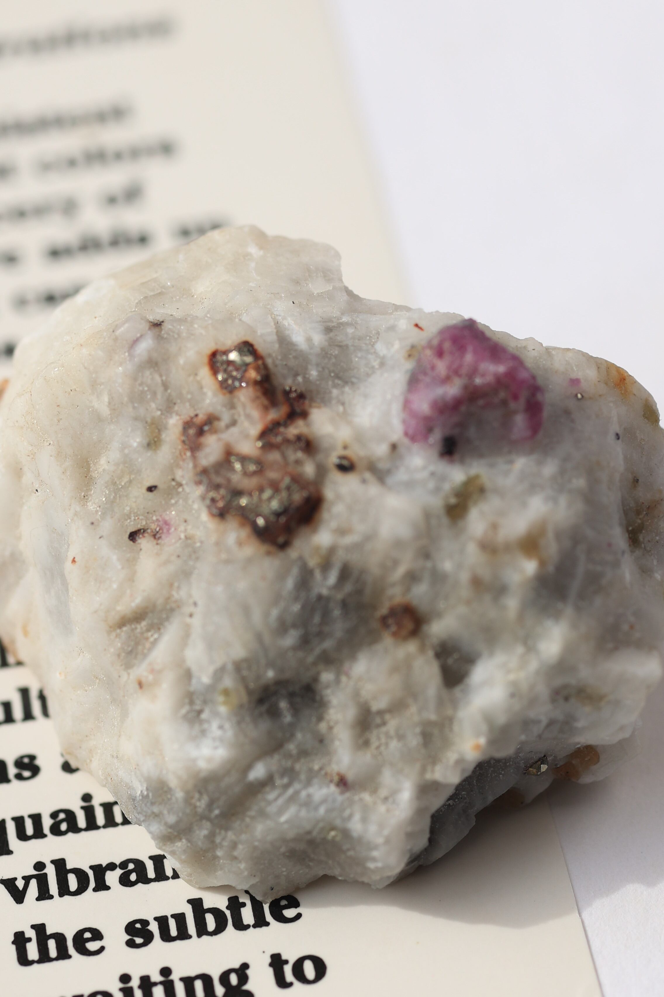 ルビー原石の中には、パイライト(黄鉄鉱)が共生している個体も見られます。パイライトは金属的な輝きを持ち、光を受けるとキラッと反射し、ルビーの赤色とのコントラストが際立ちます。