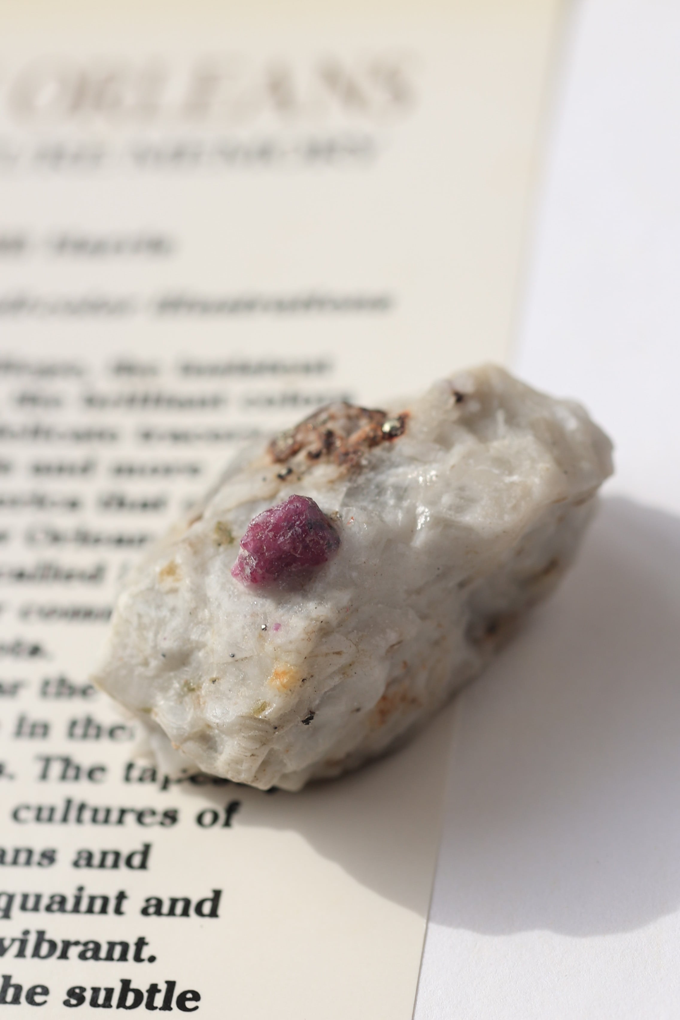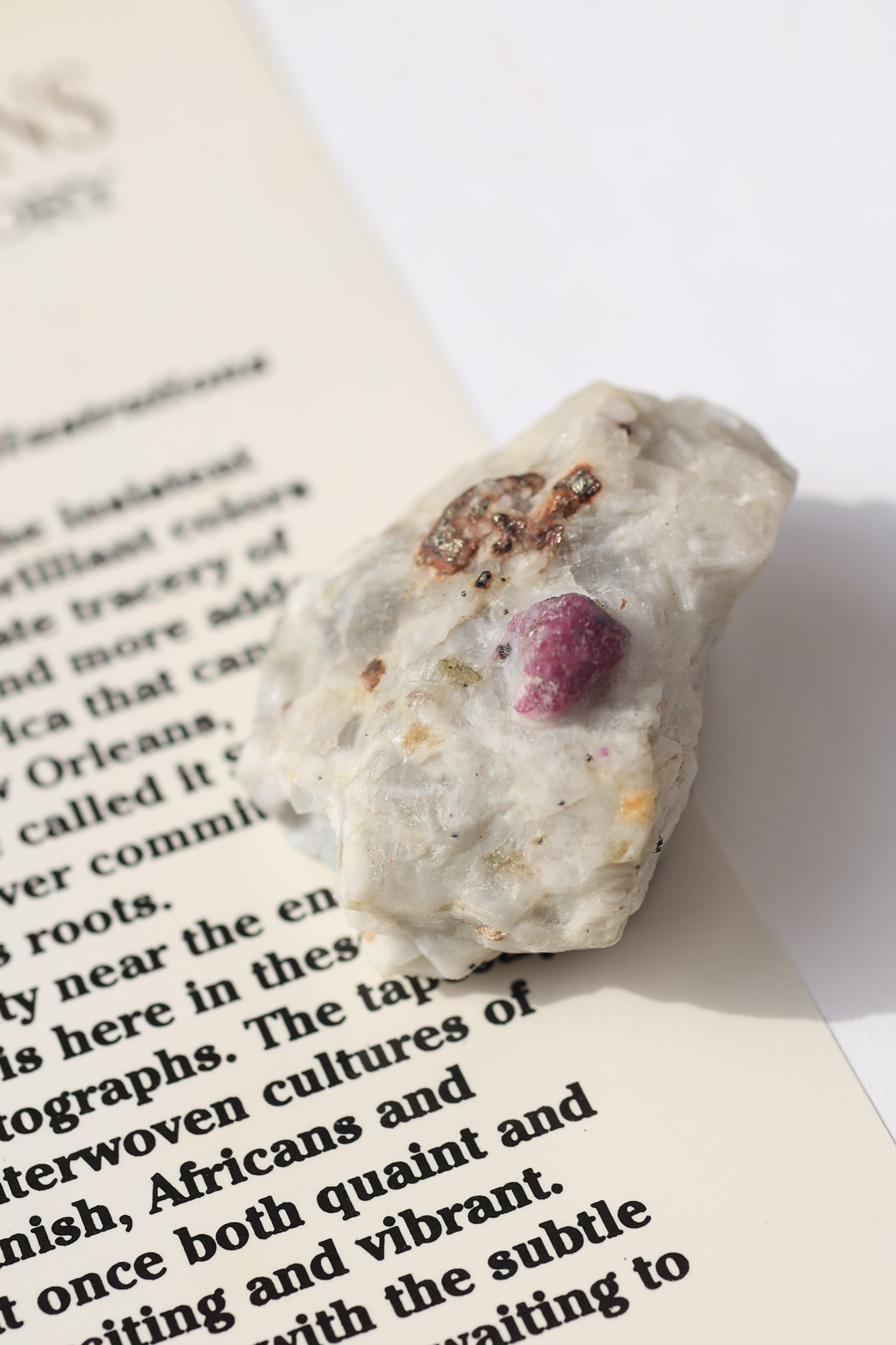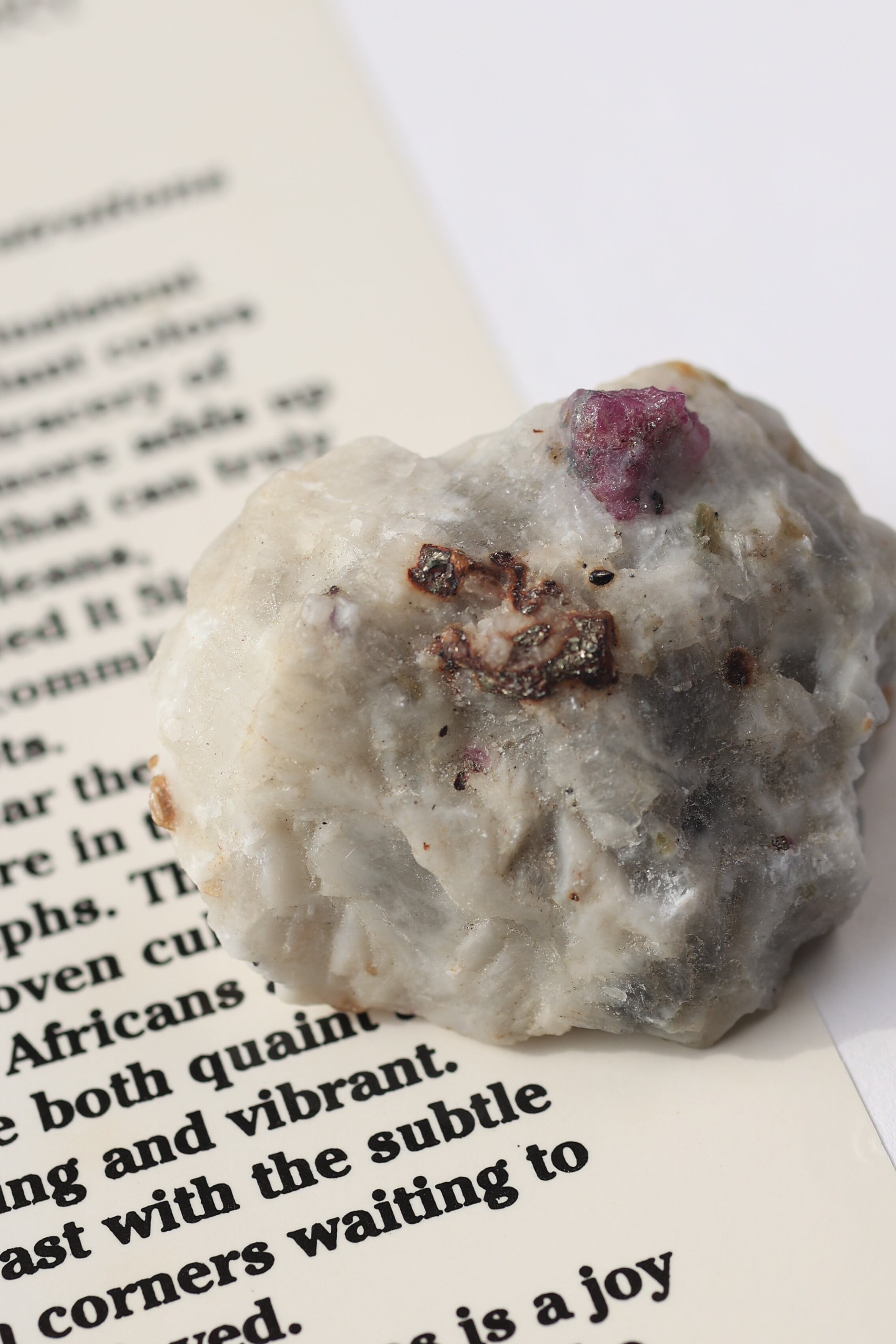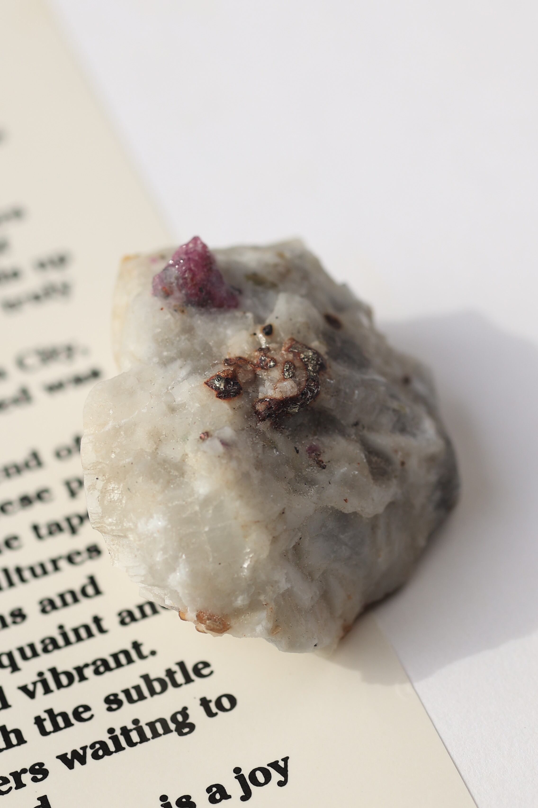 ルビー原石の中には、パイライト(黄鉄鉱)が共生している個体も見られます。パイライトは金属的な輝きを持ち、光を受けるとキラッと反射し、ルビーの赤色とのコントラストが際立ちます。