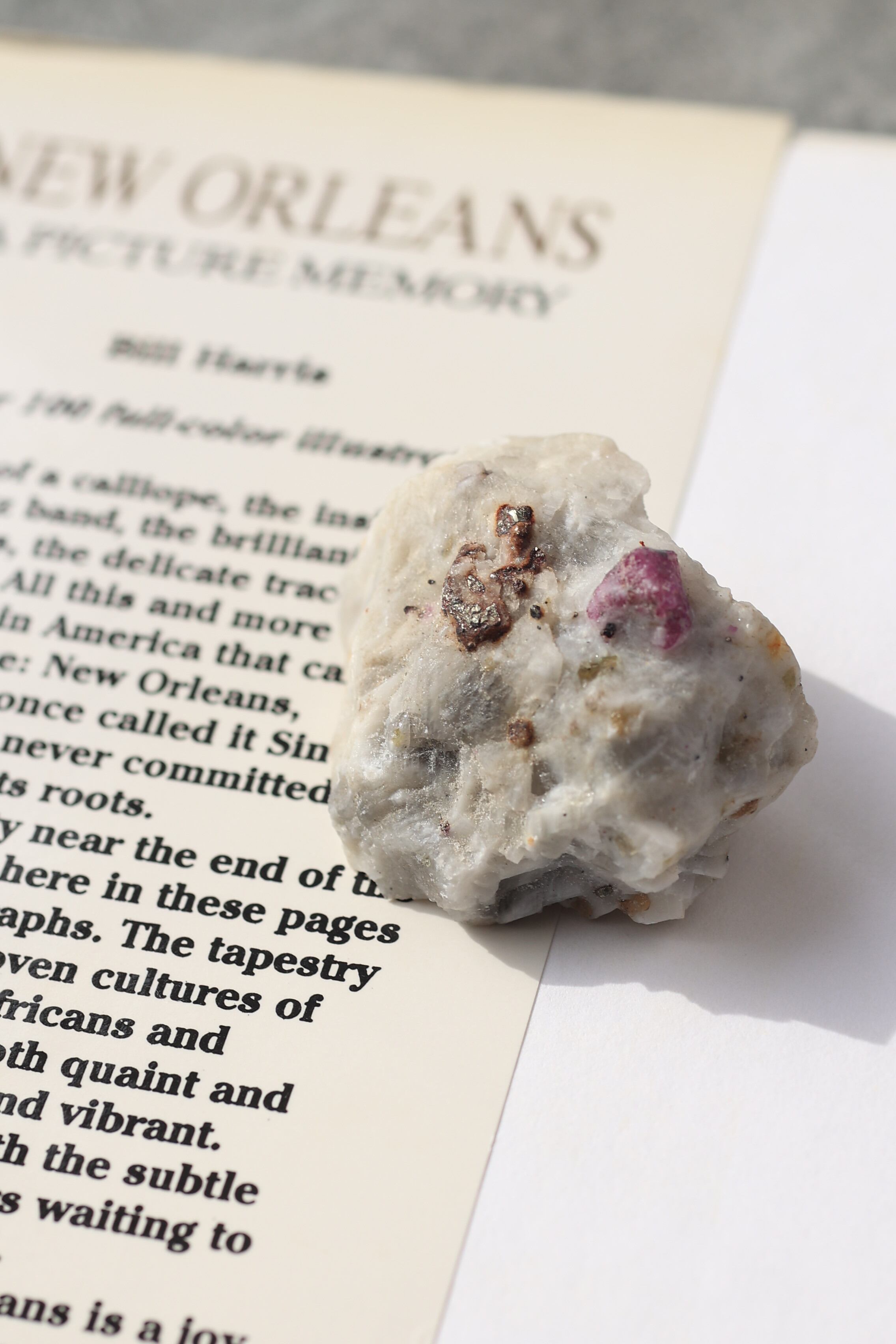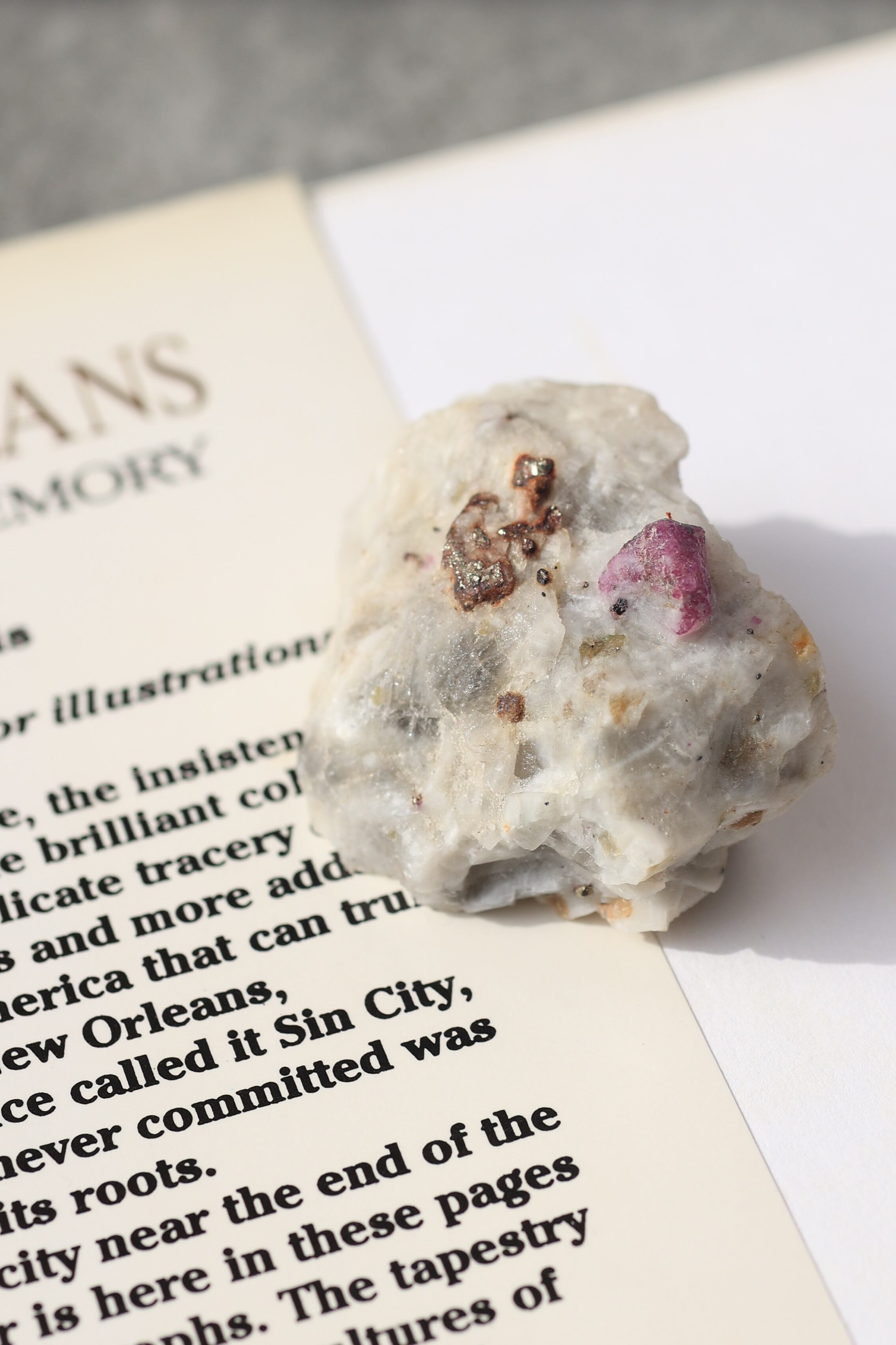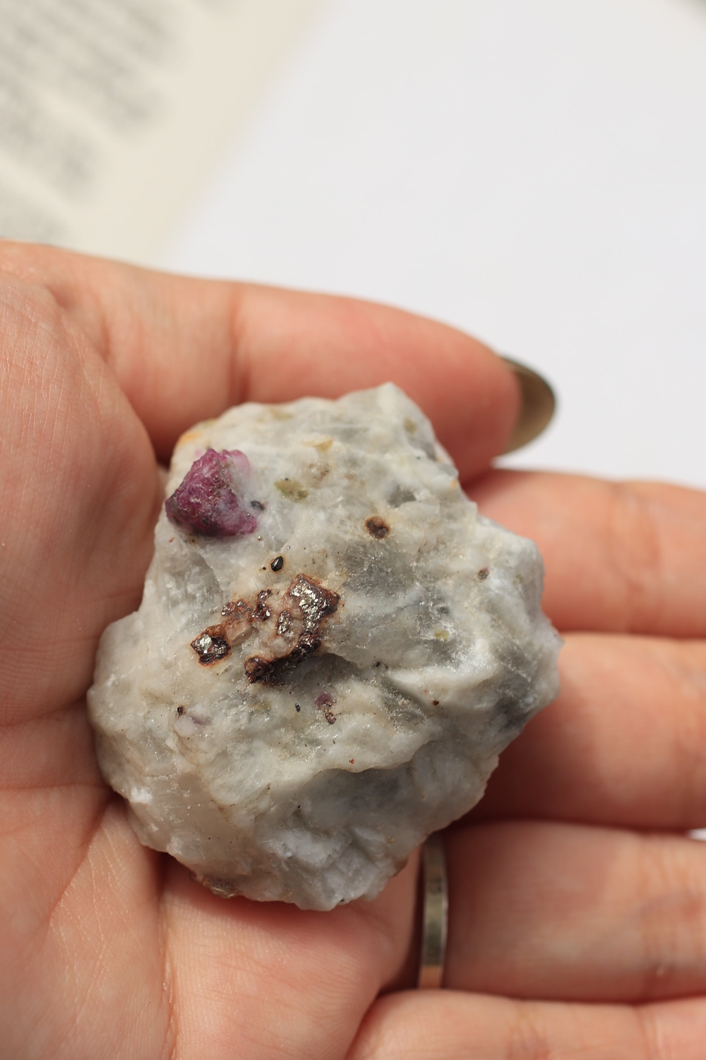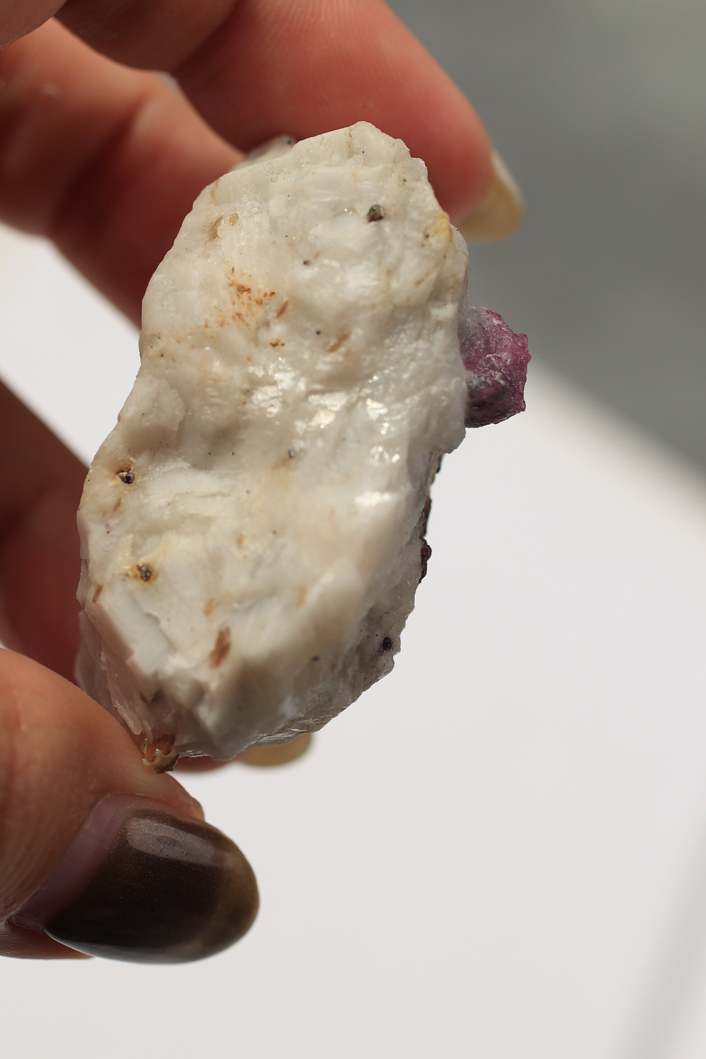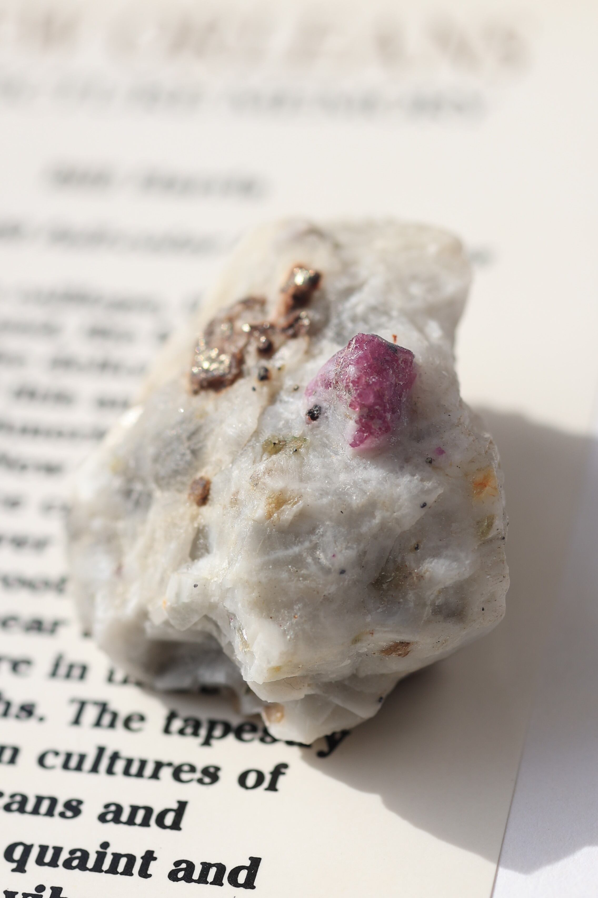 ルビー原石の中には、パイライト(黄鉄鉱)が共生している個体も見られます。パイライトは金属的な輝きを持ち、光を受けるとキラッと反射し、ルビーの赤色とのコントラストが際立ちます。