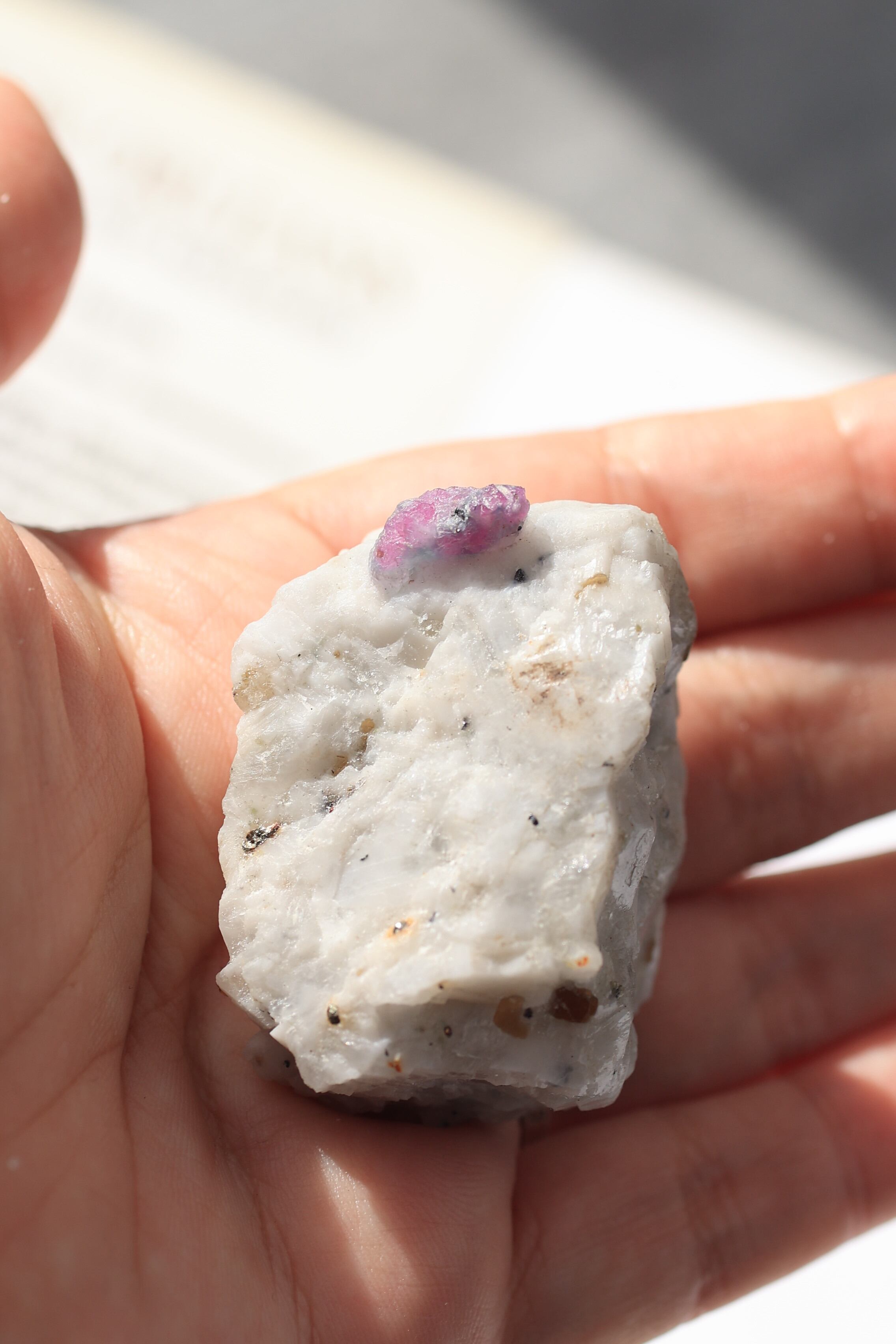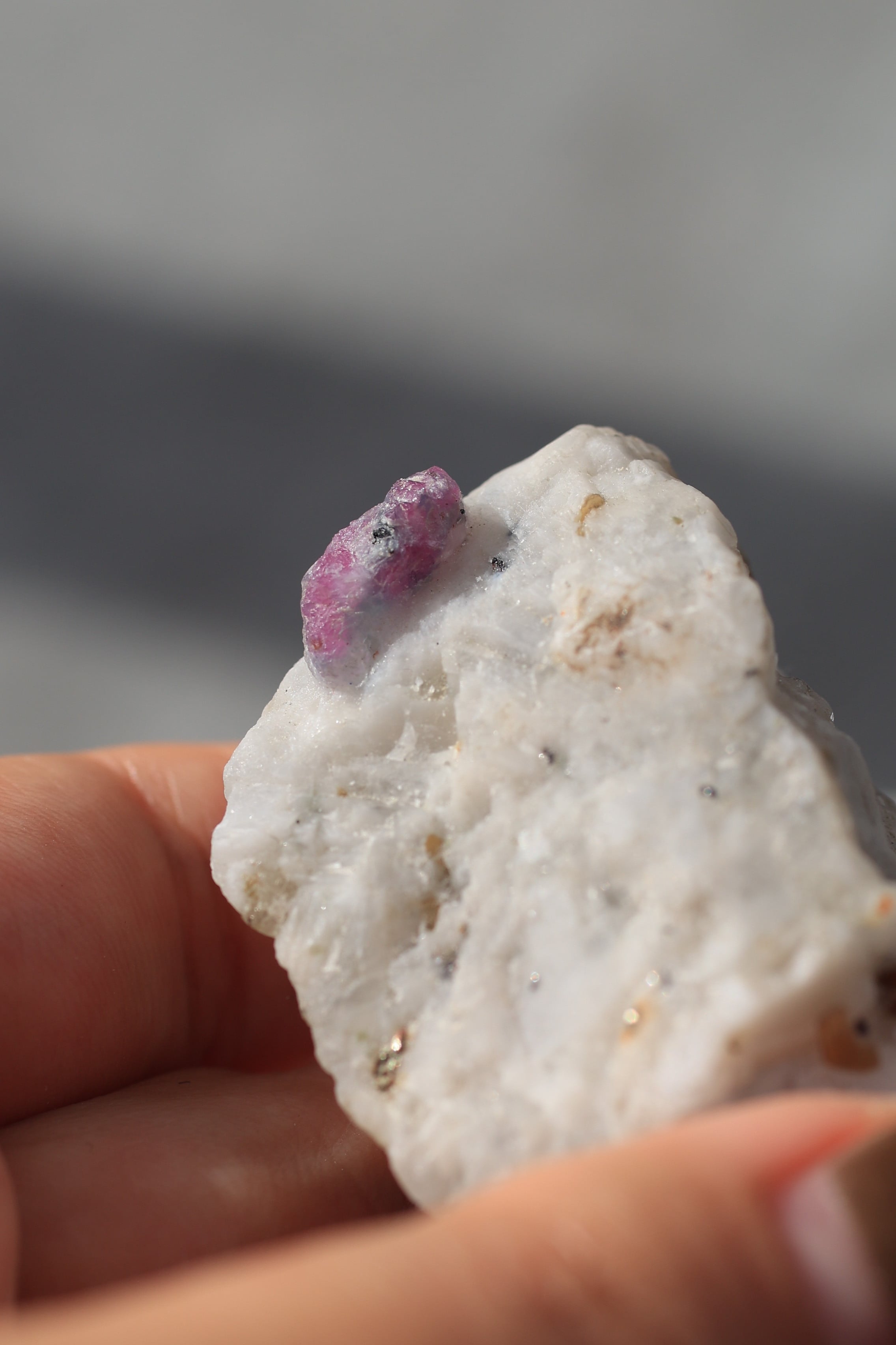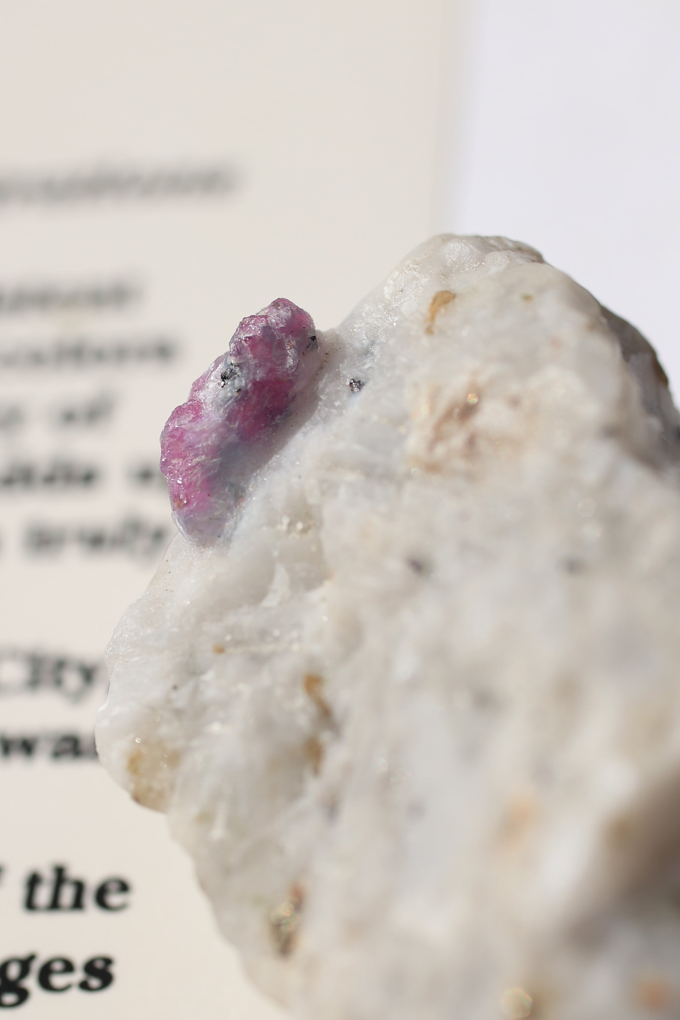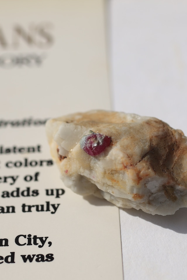 ルビー原石の中には、パイライト(黄鉄鉱)が共生している個体も見られます。パイライトは金属的な輝きを持ち、光を受けるとキラッと反射し、ルビーの赤色とのコントラストが際立ちます。