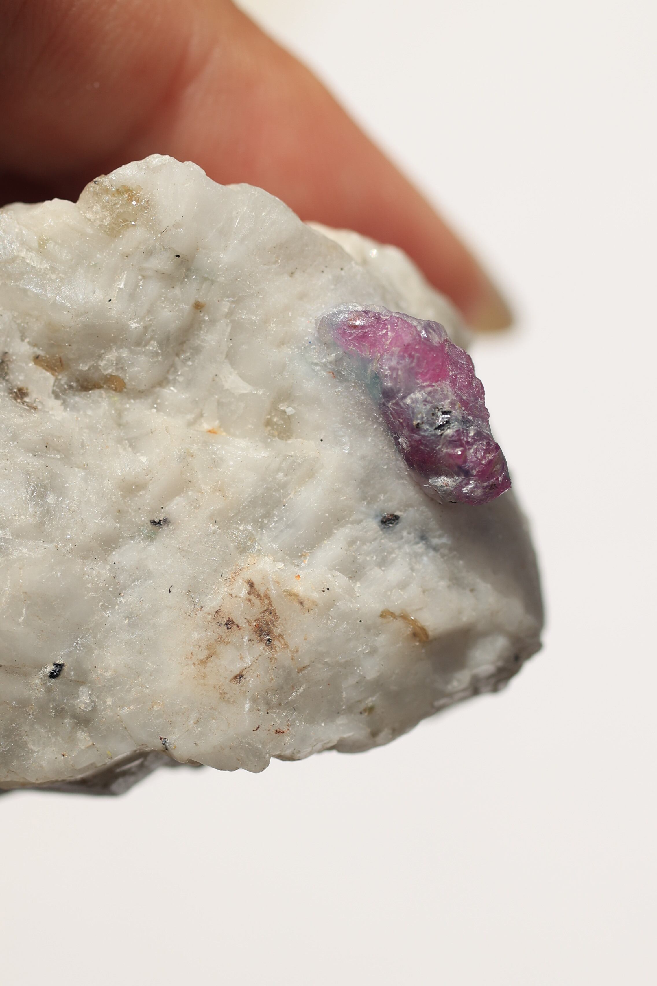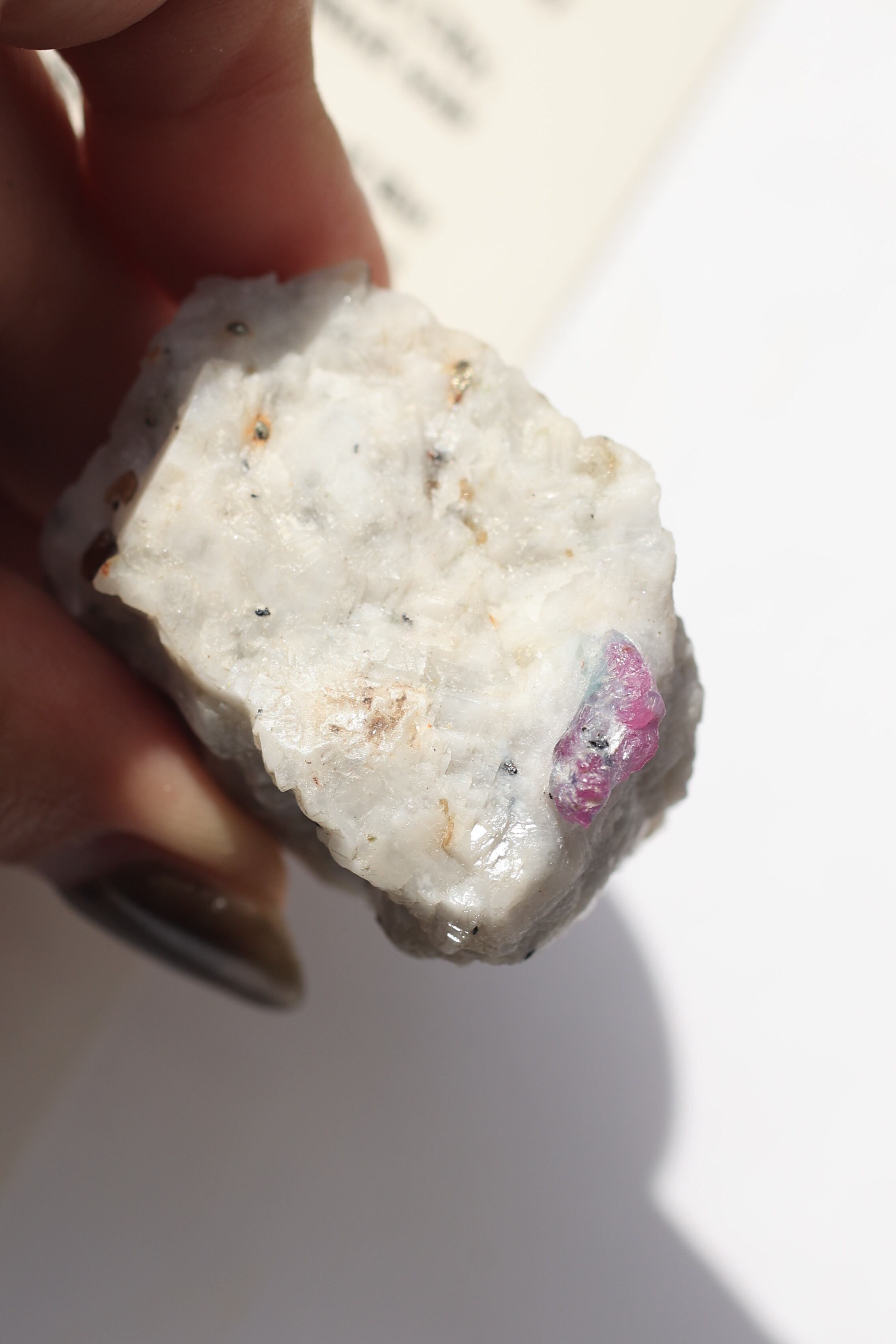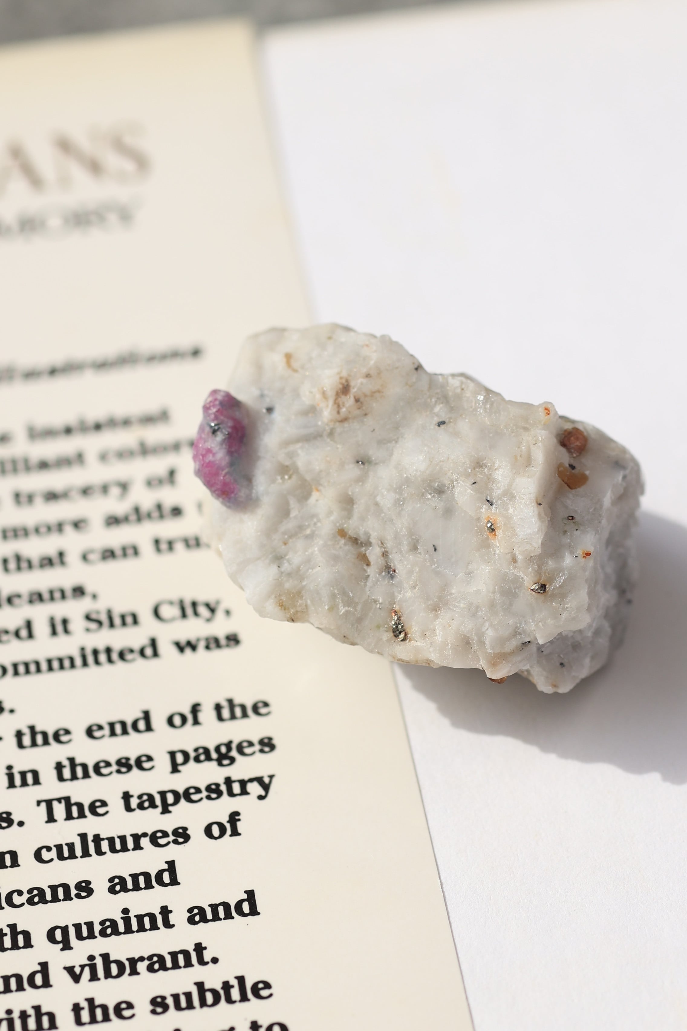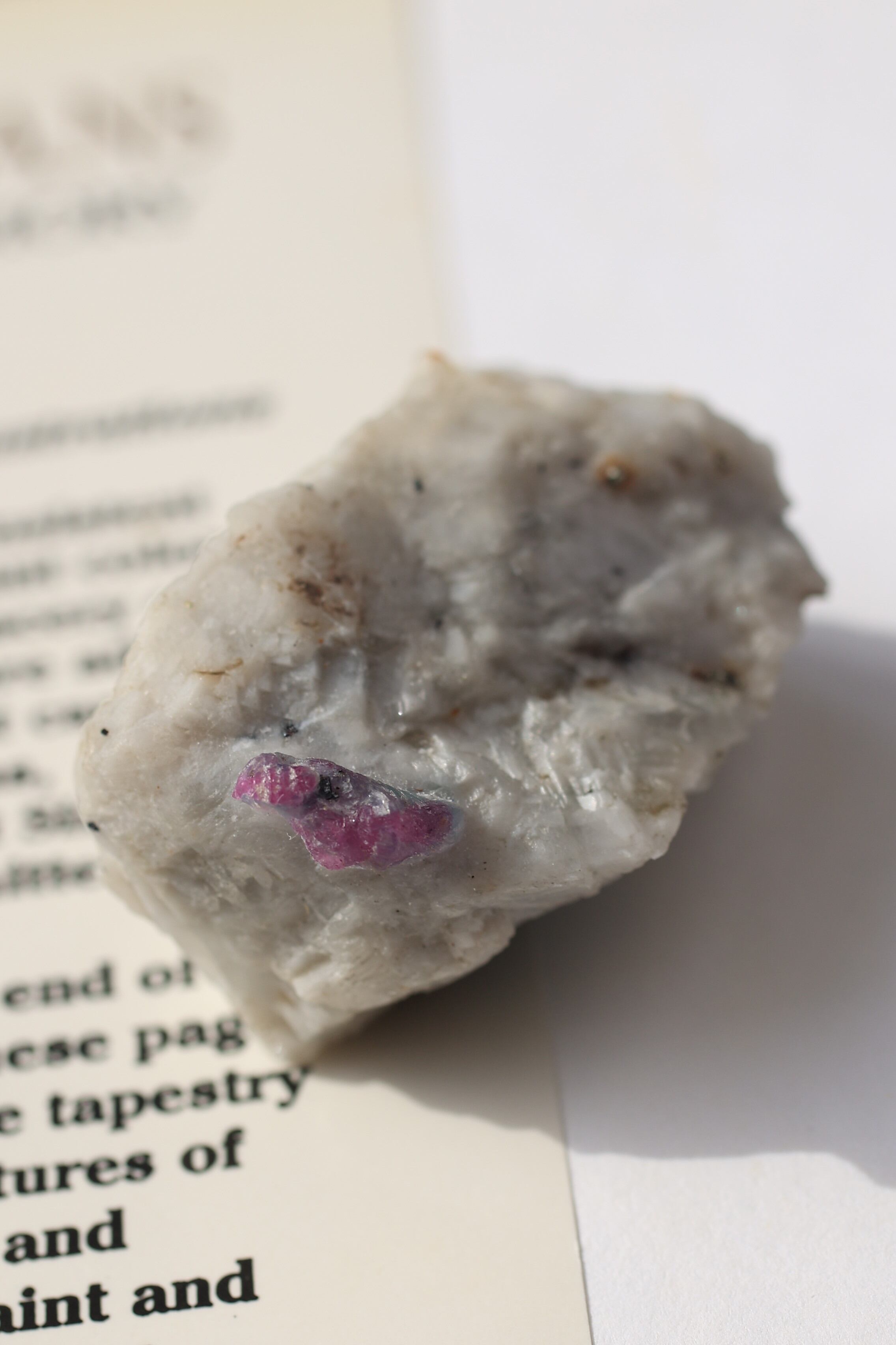 ルビー原石の中には、パイライト(黄鉄鉱)が共生している個体も見られます。パイライトは金属的な輝きを持ち、光を受けるとキラッと反射し、ルビーの赤色とのコントラストが際立ちます。