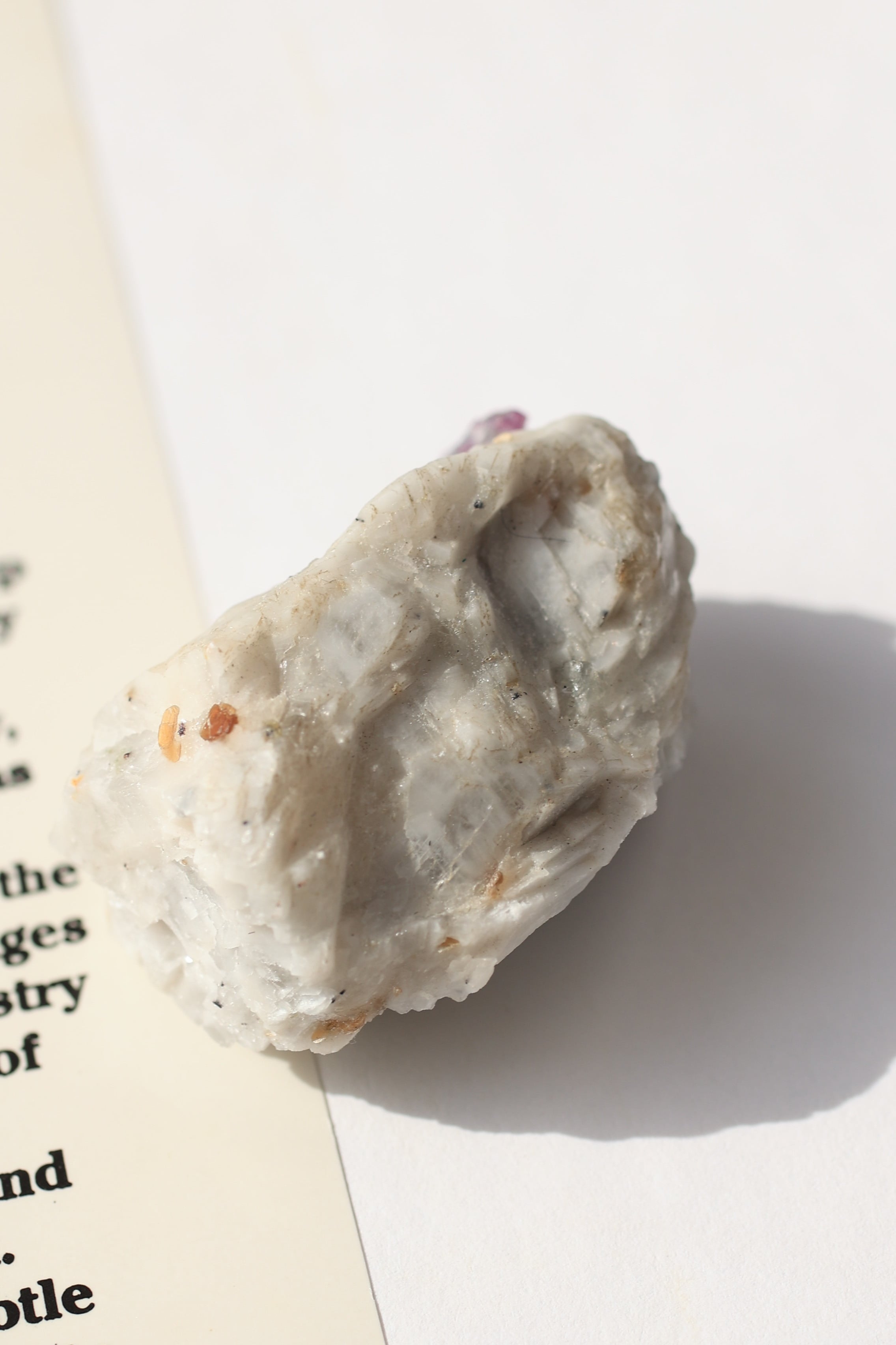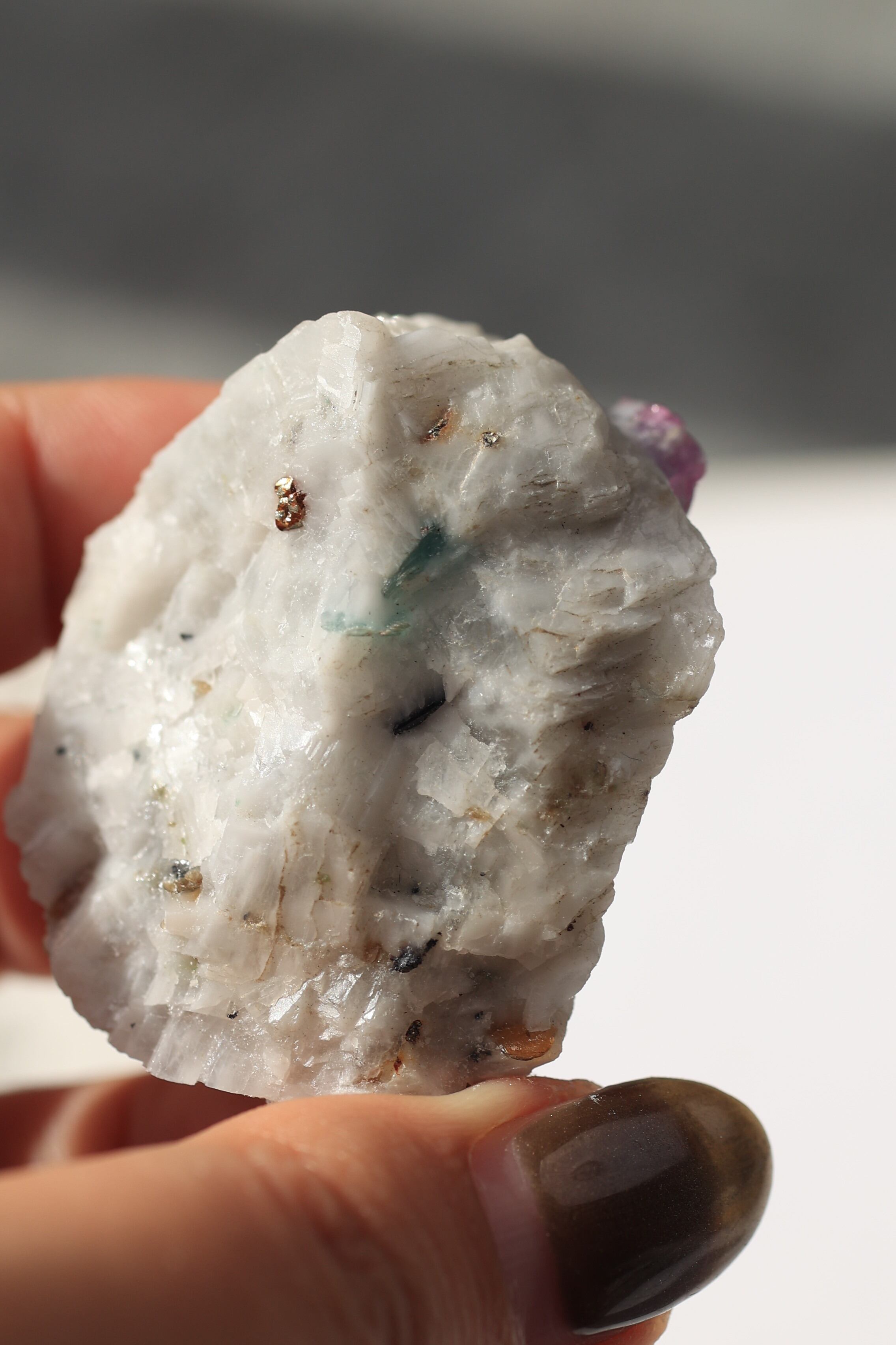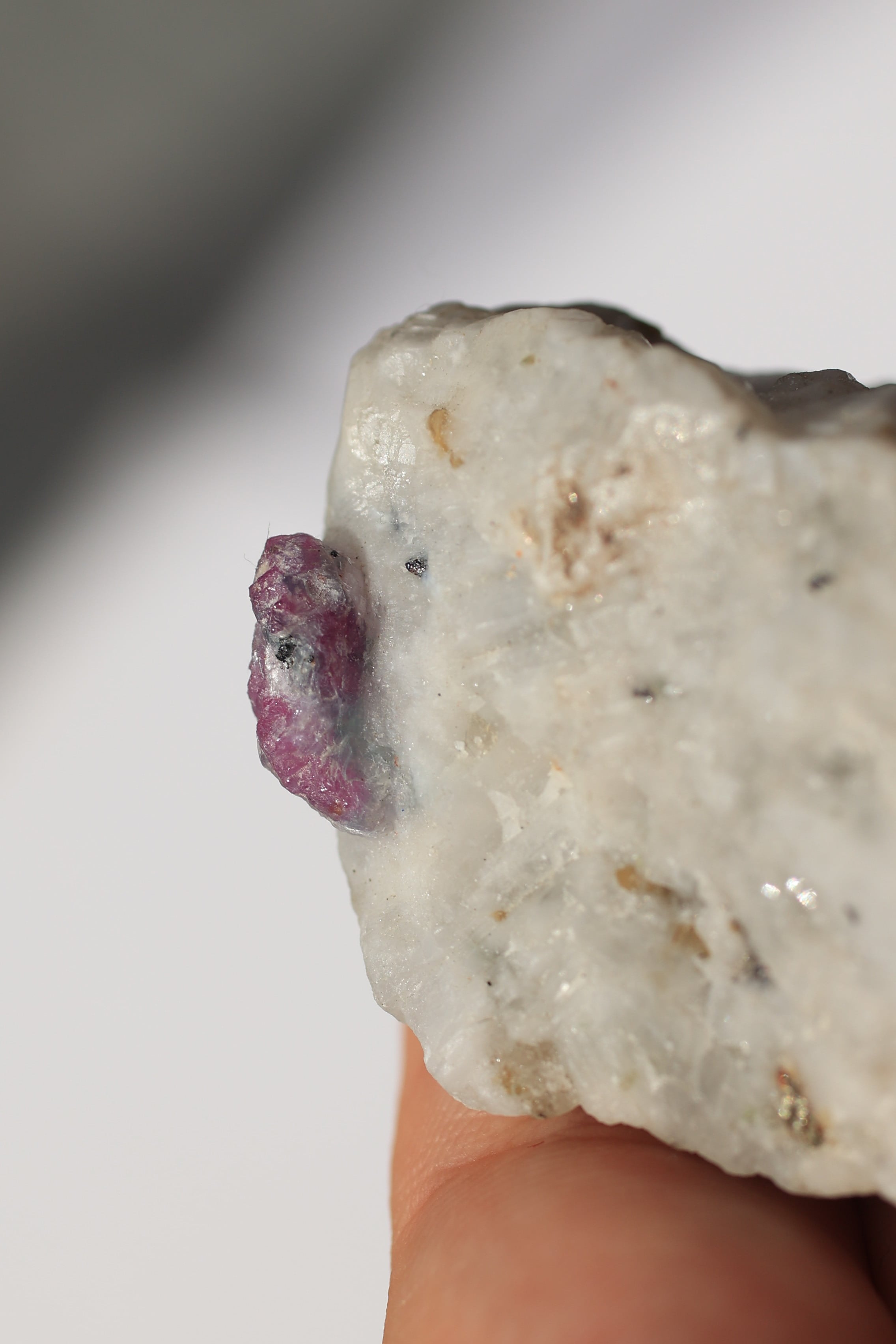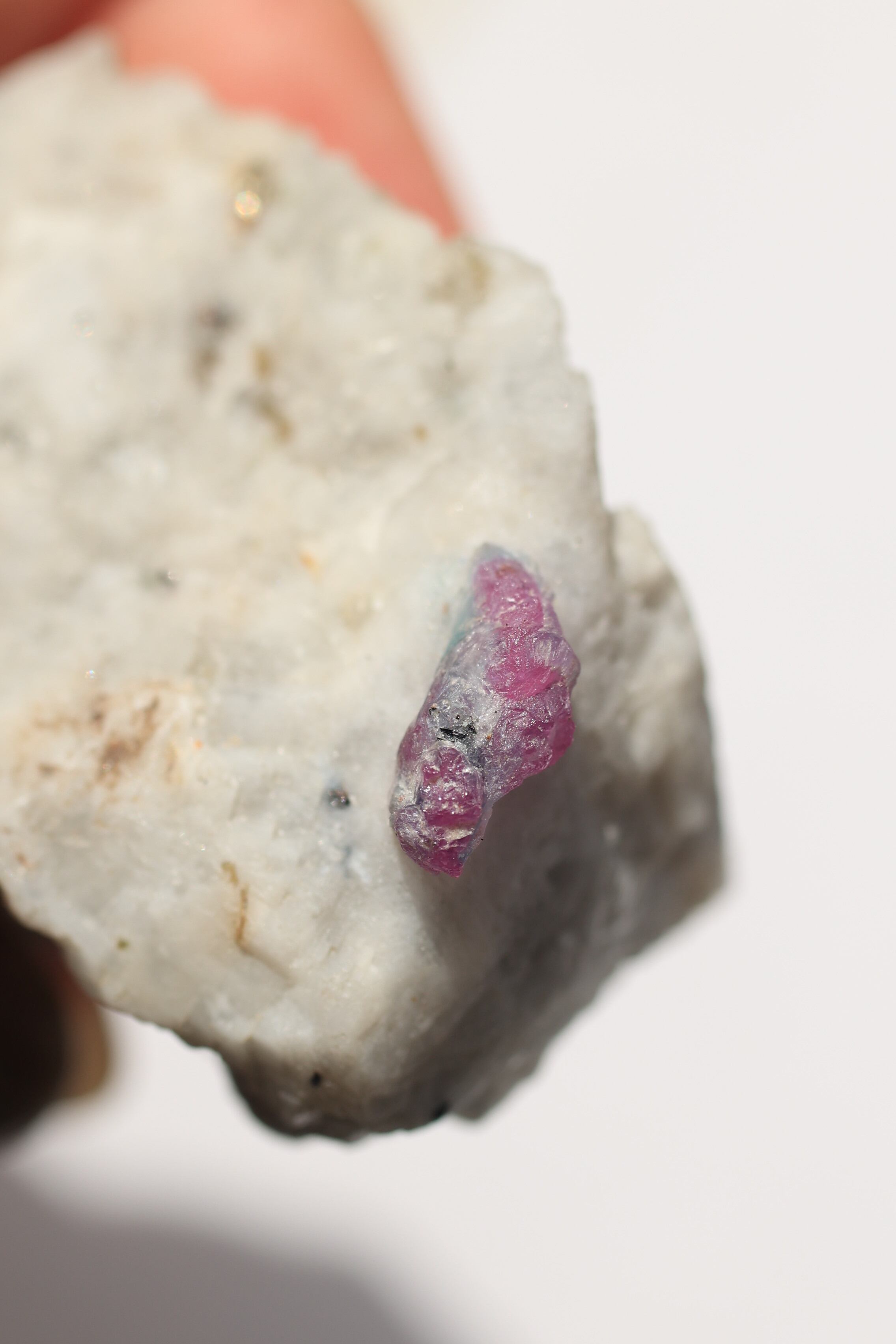 ルビー原石の中には、パイライト(黄鉄鉱)が共生している個体も見られます。パイライトは金属的な輝きを持ち、光を受けるとキラッと反射し、ルビーの赤色とのコントラストが際立ちます。