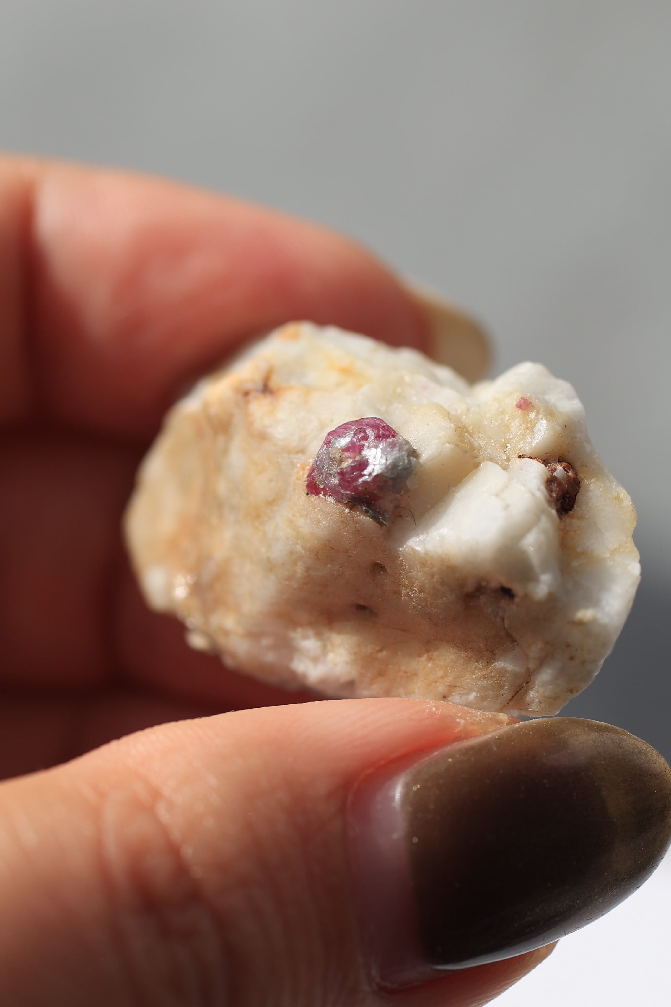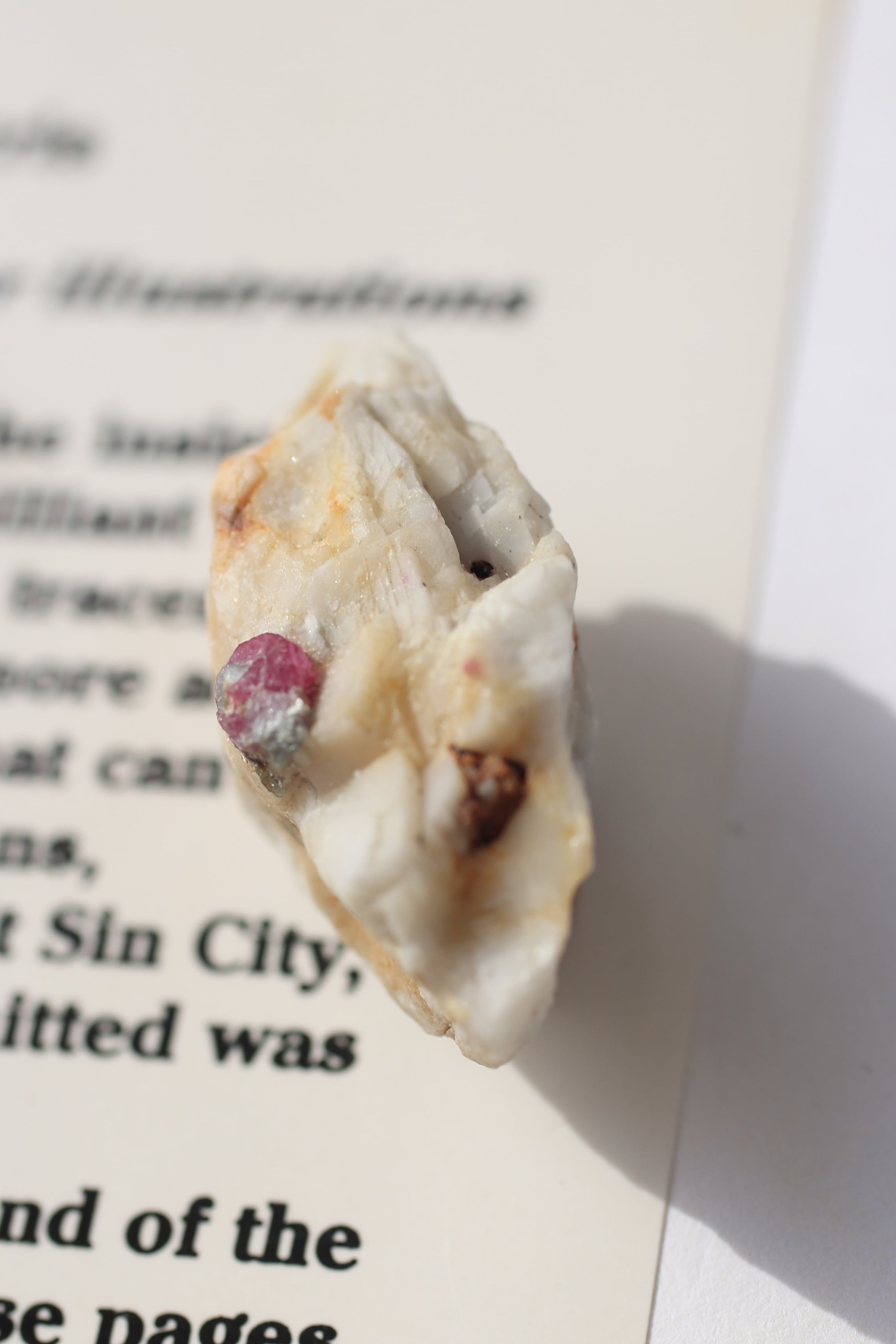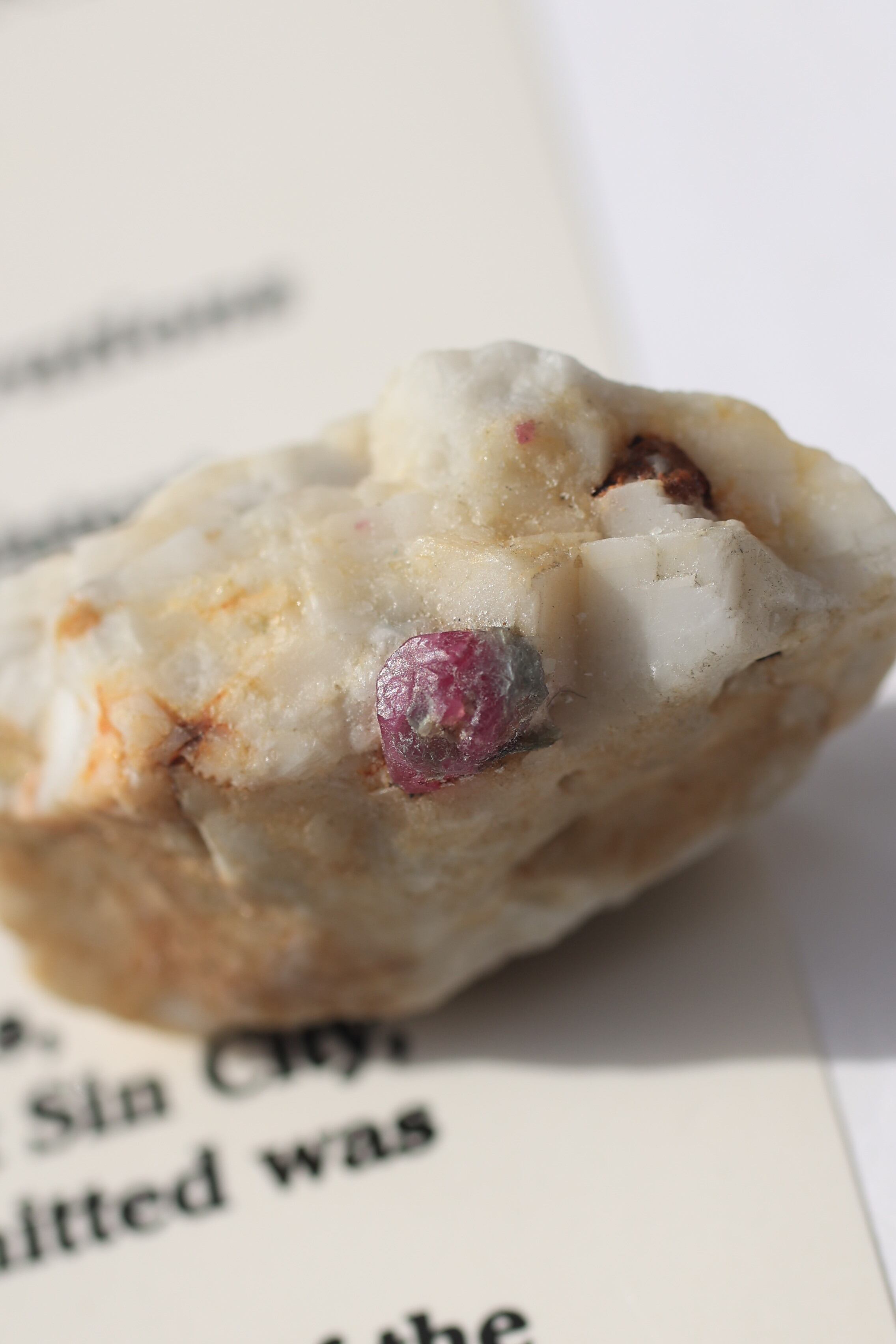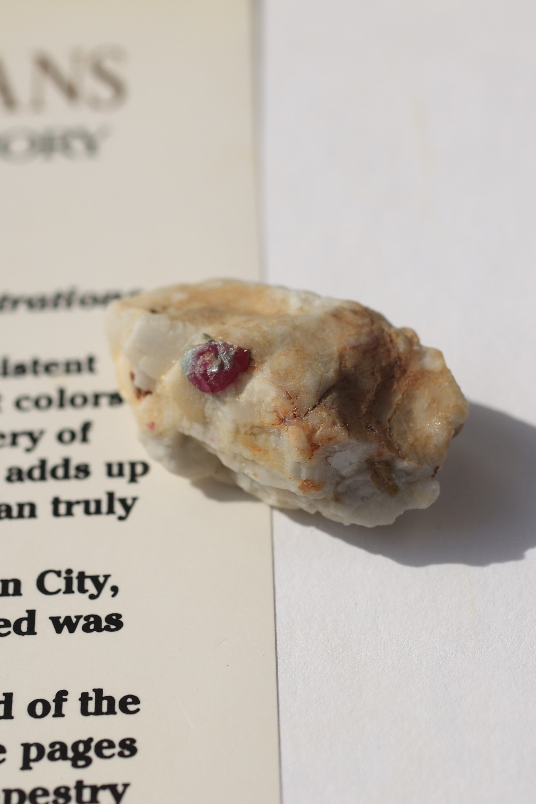 ルビー原石の中には、パイライト(黄鉄鉱)が共生している個体も見られます。パイライトは金属的な輝きを持ち、光を受けるとキラッと反射し、ルビーの赤色とのコントラストが際立ちます。