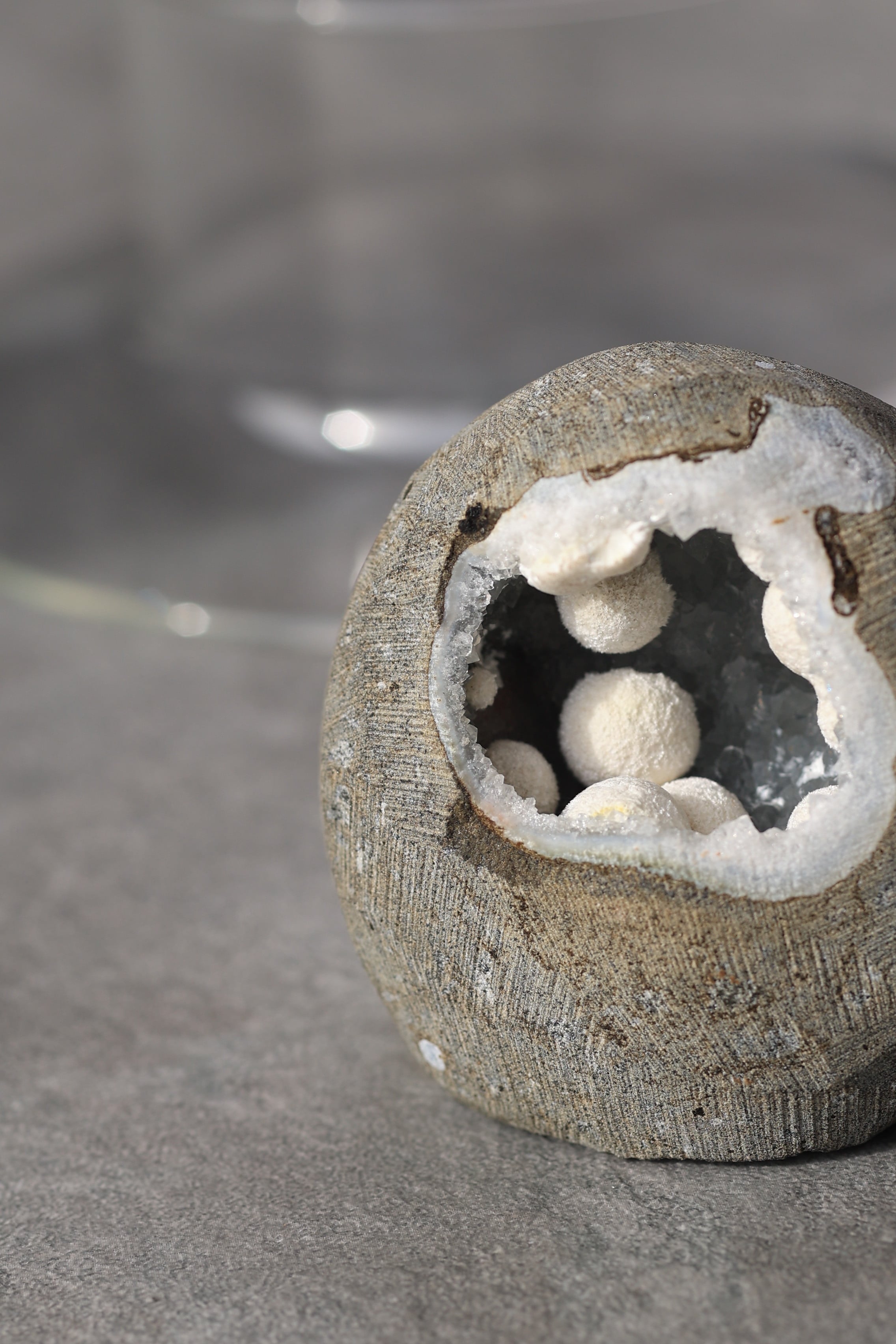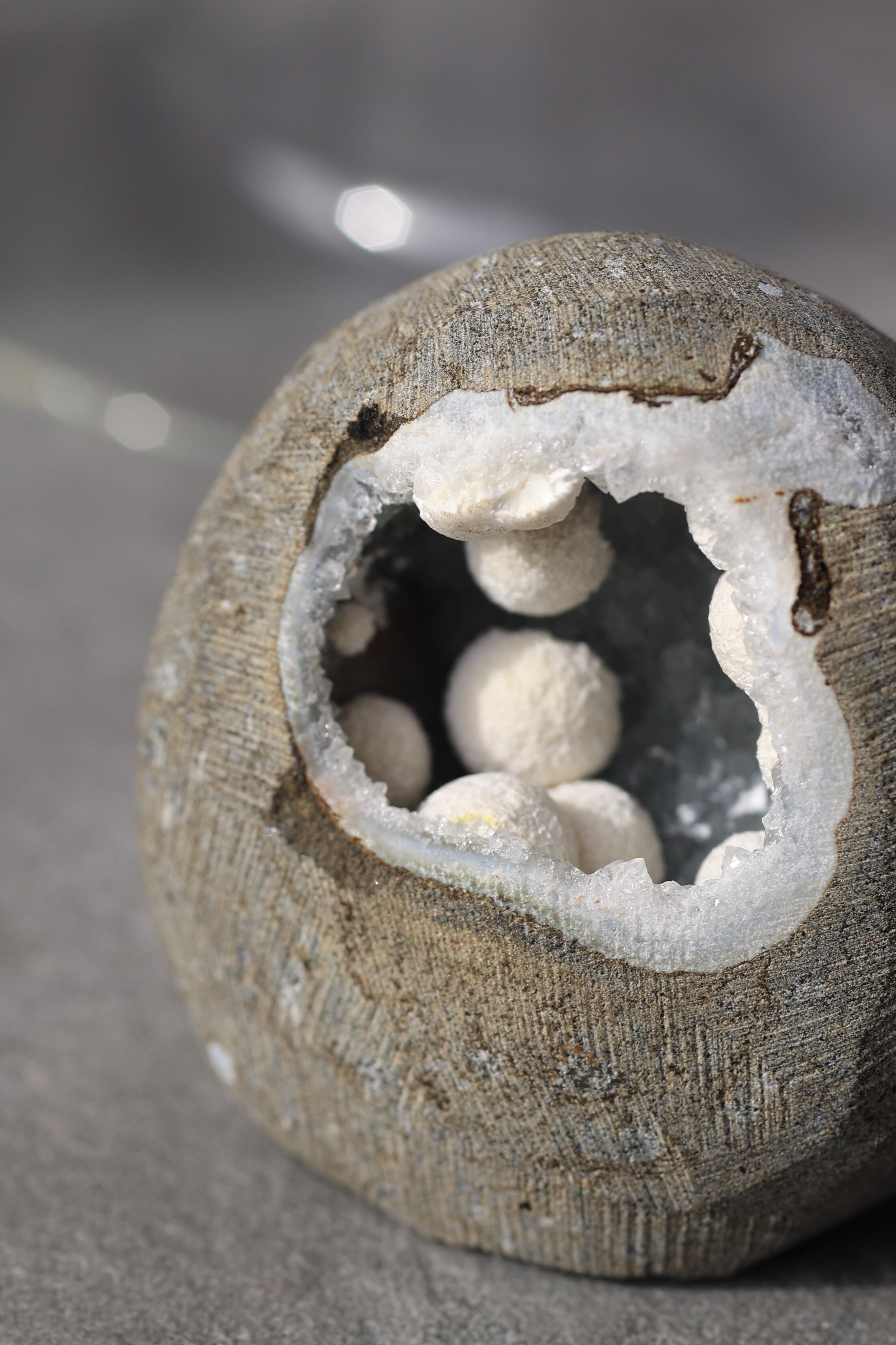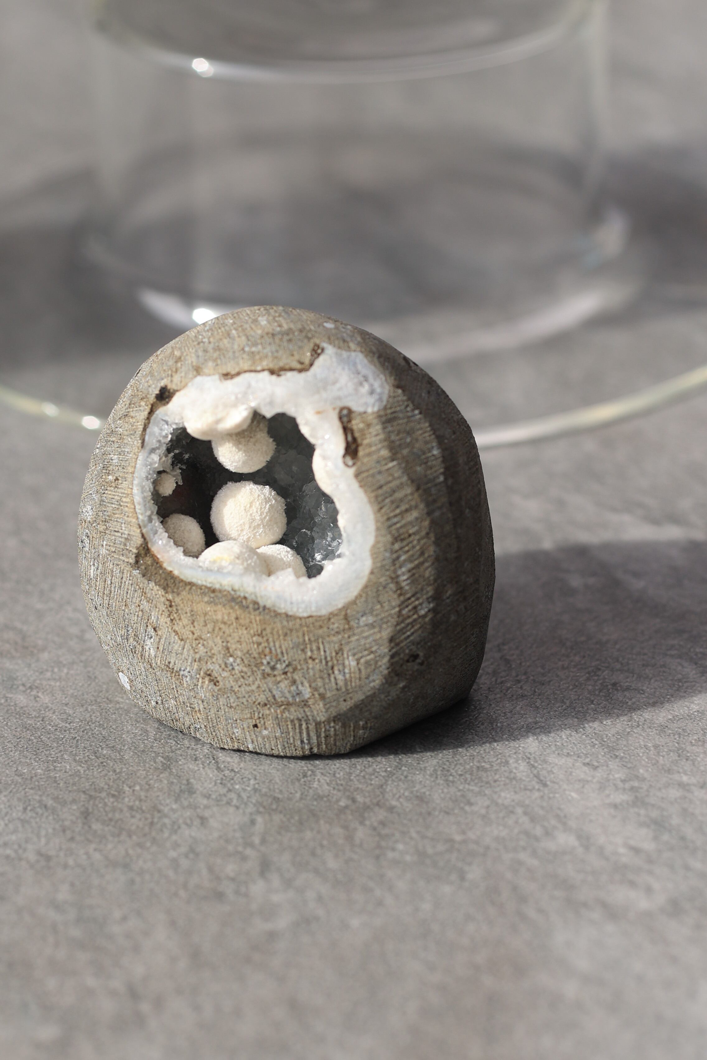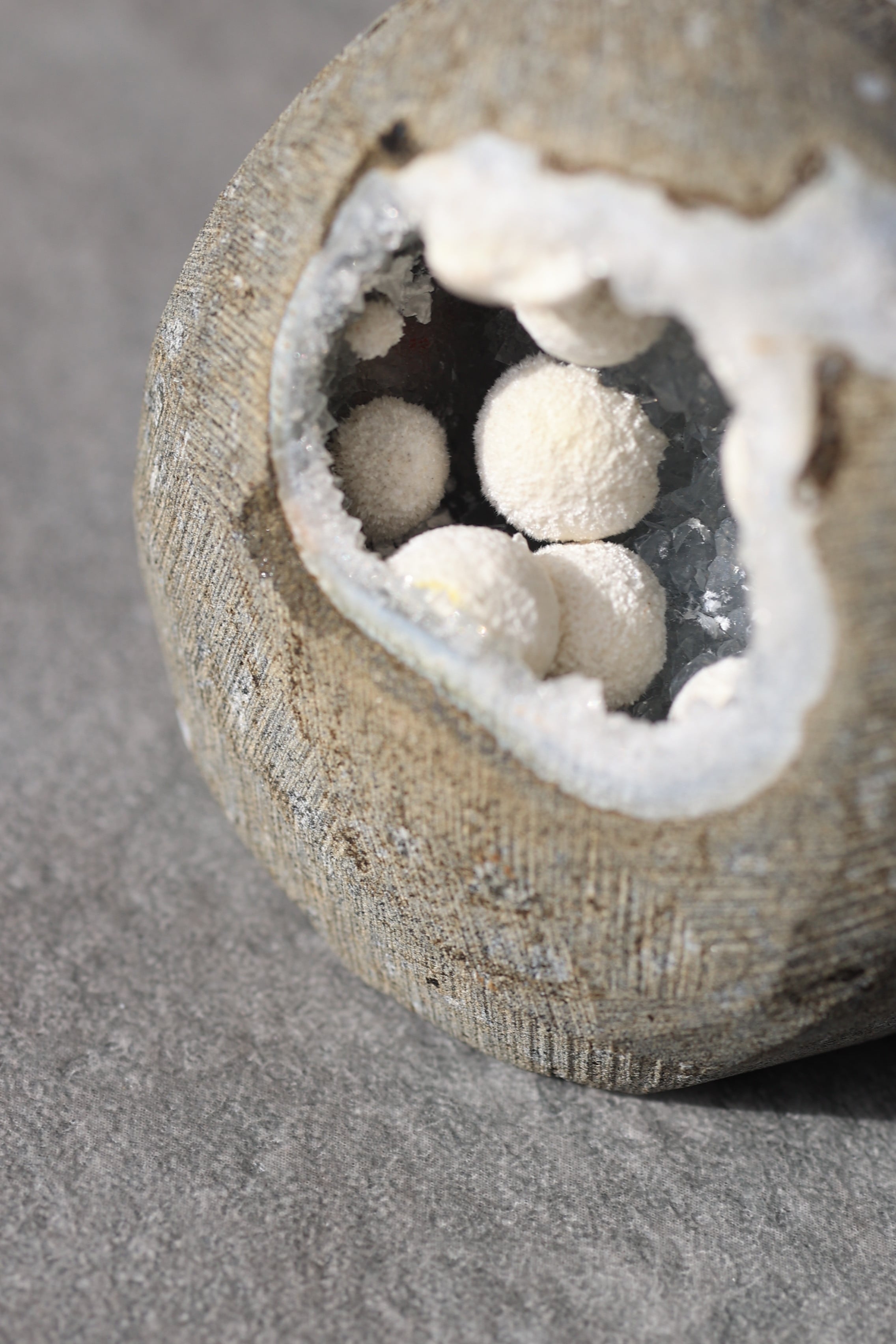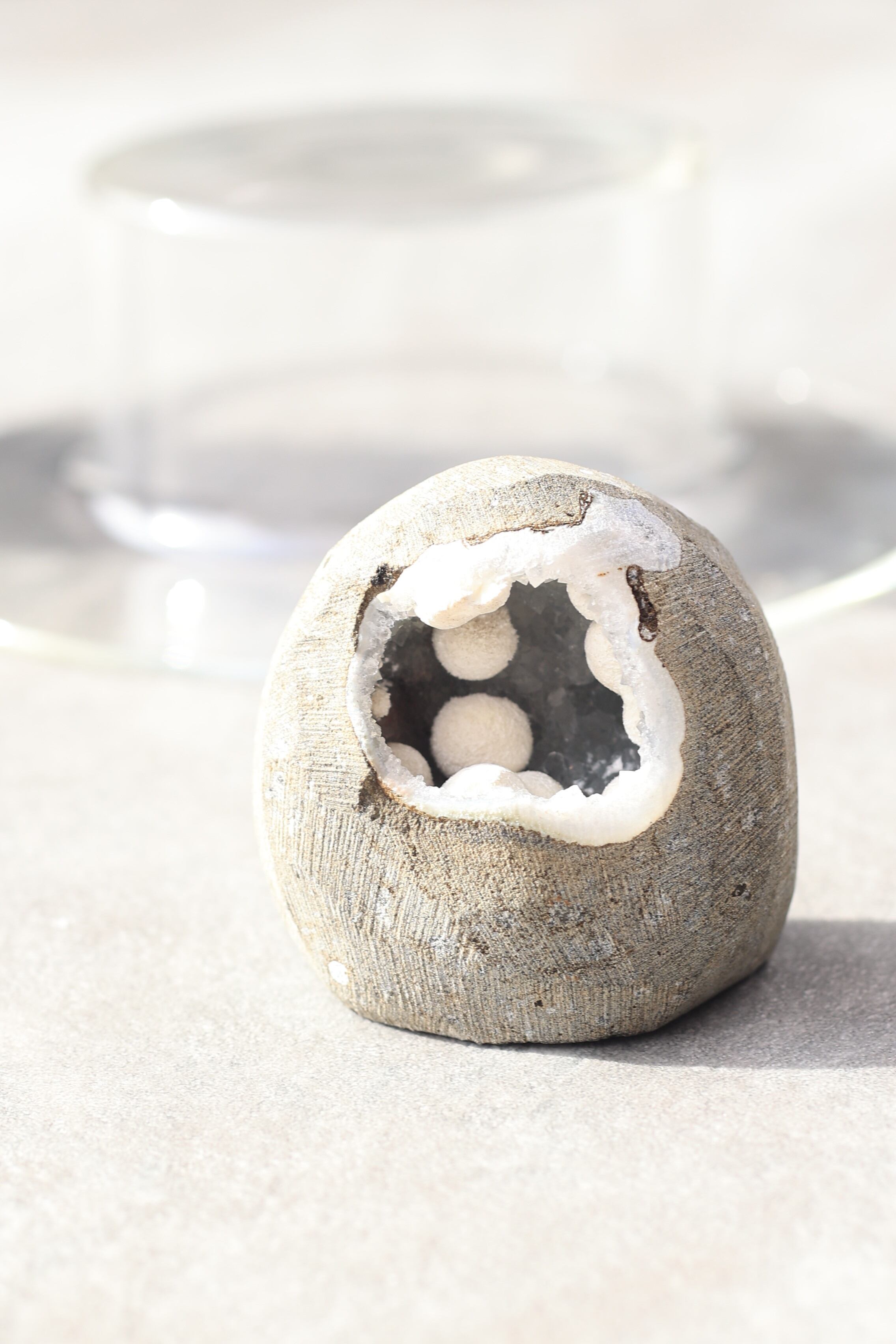 ジオードの内壁には、やわらかな質感のカルセドニーが広がり、その上にモルデナイトが成長することで、硬質さと柔らかさが同時に感じられる、不思議な調和が生まれています。