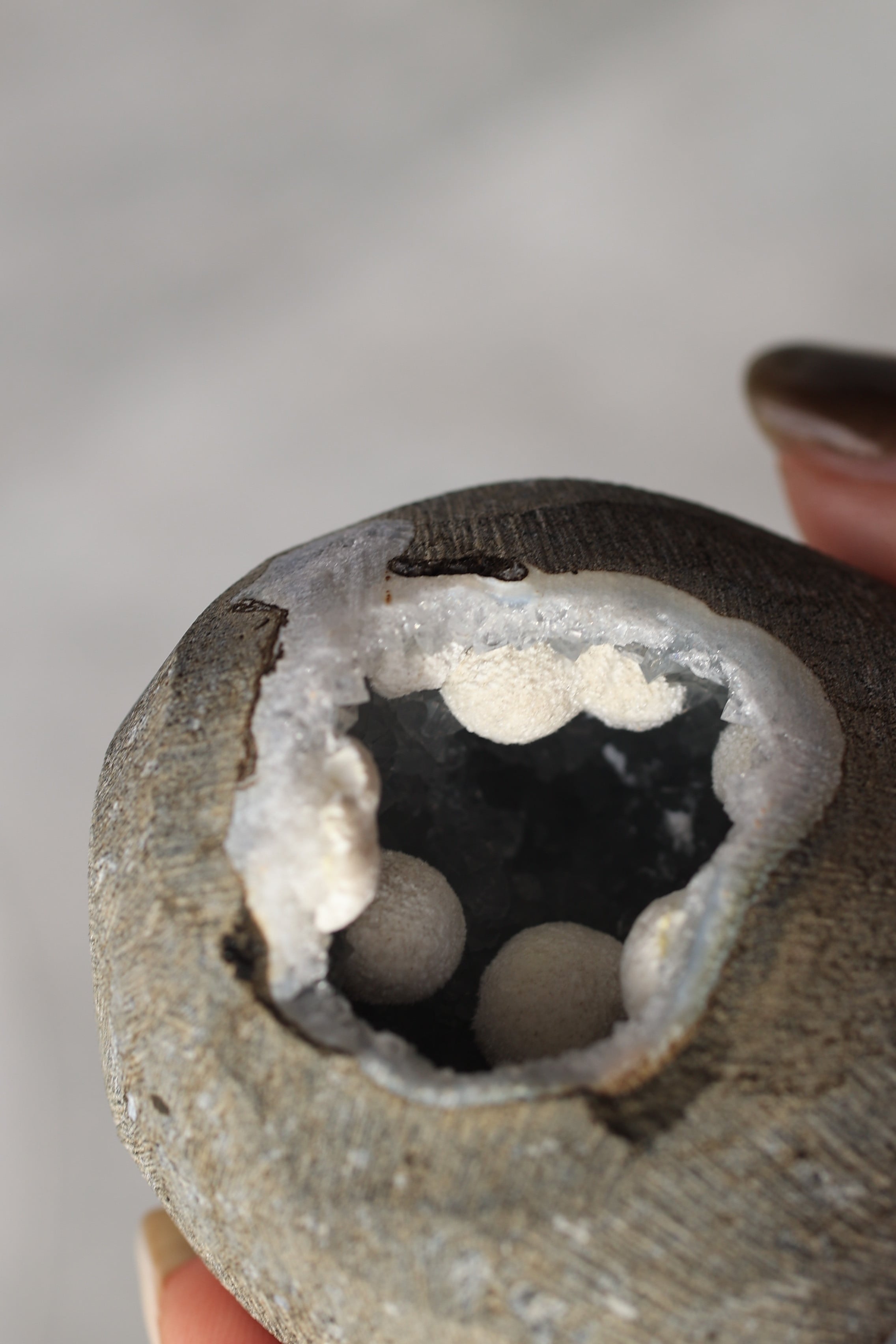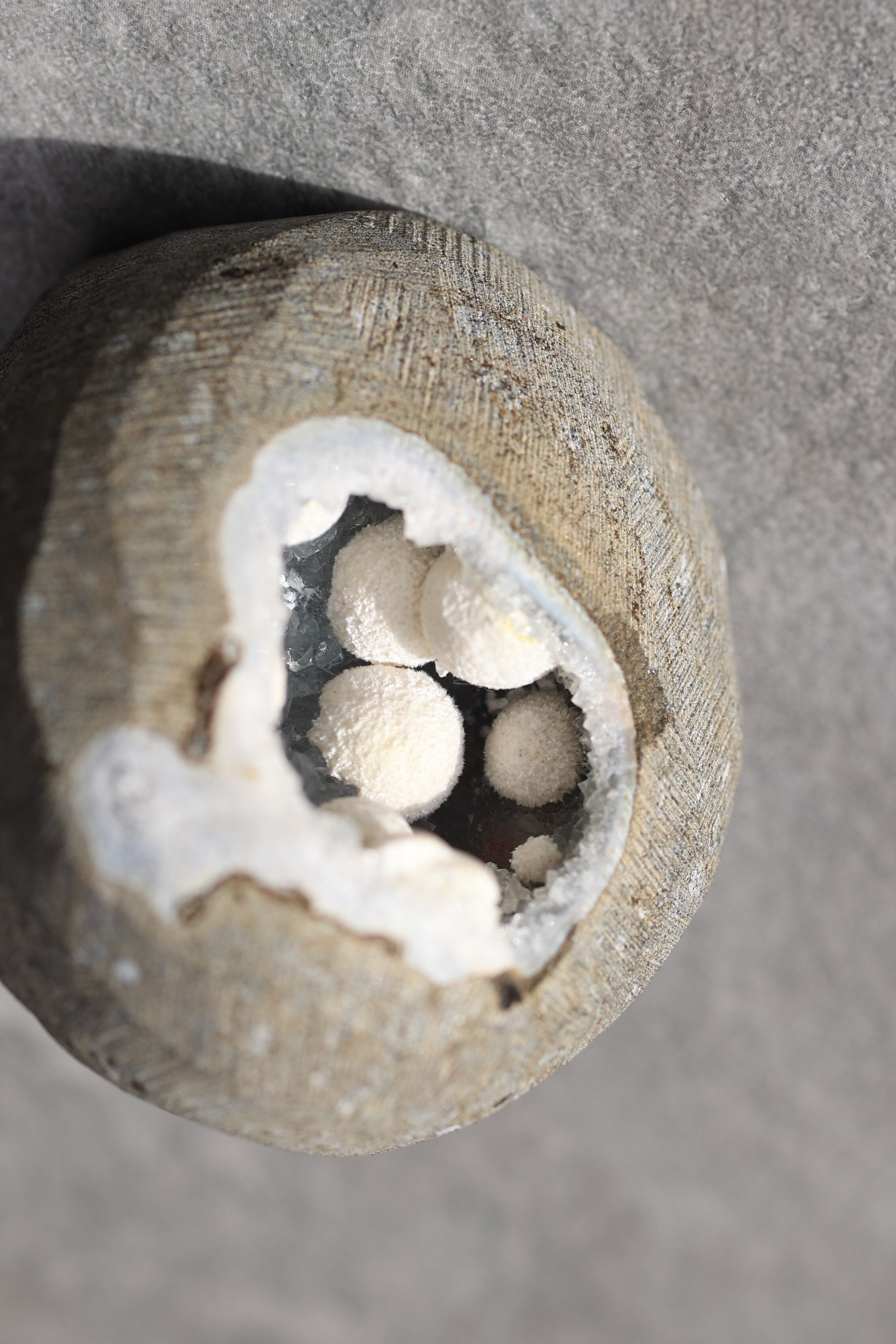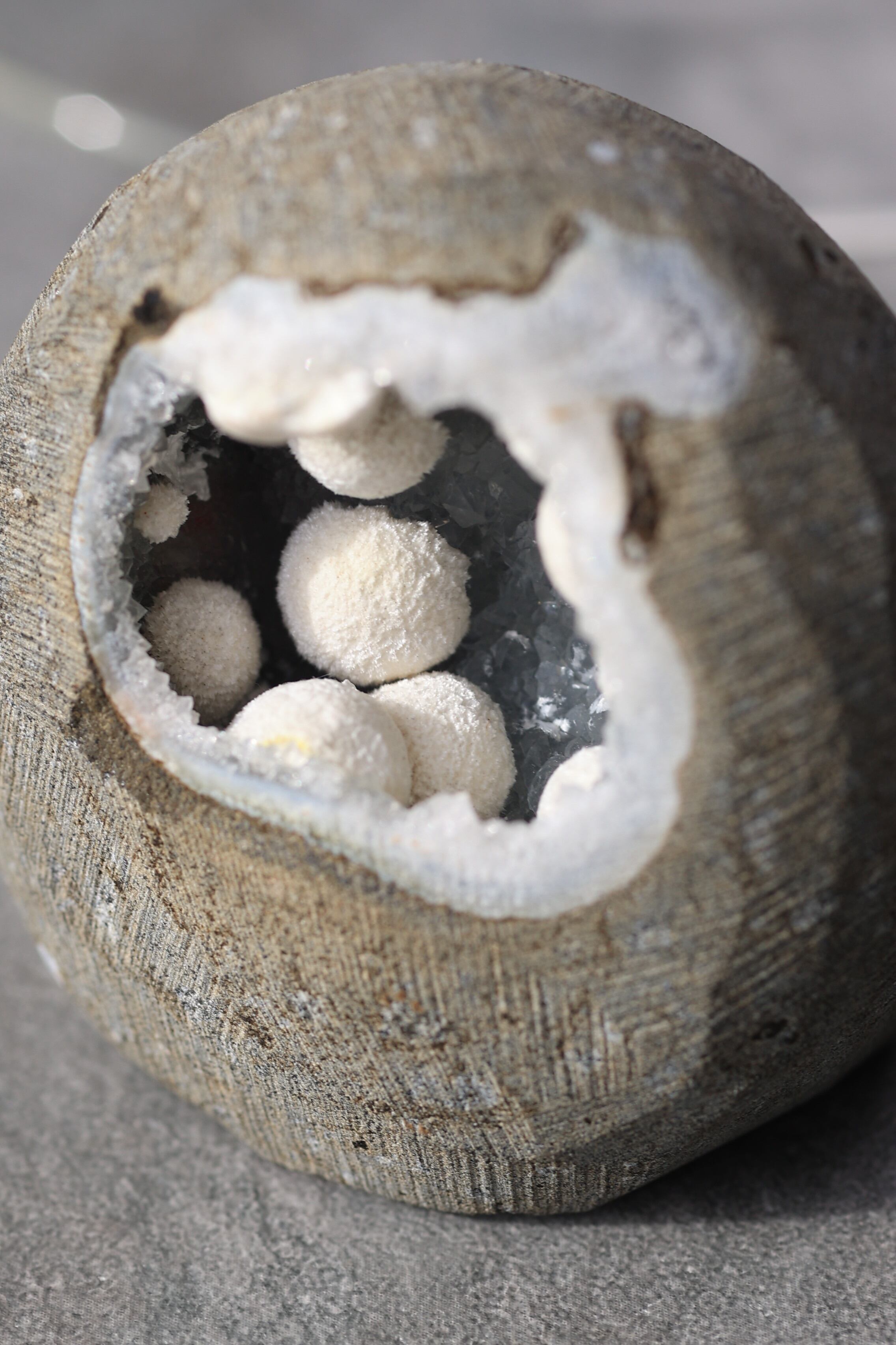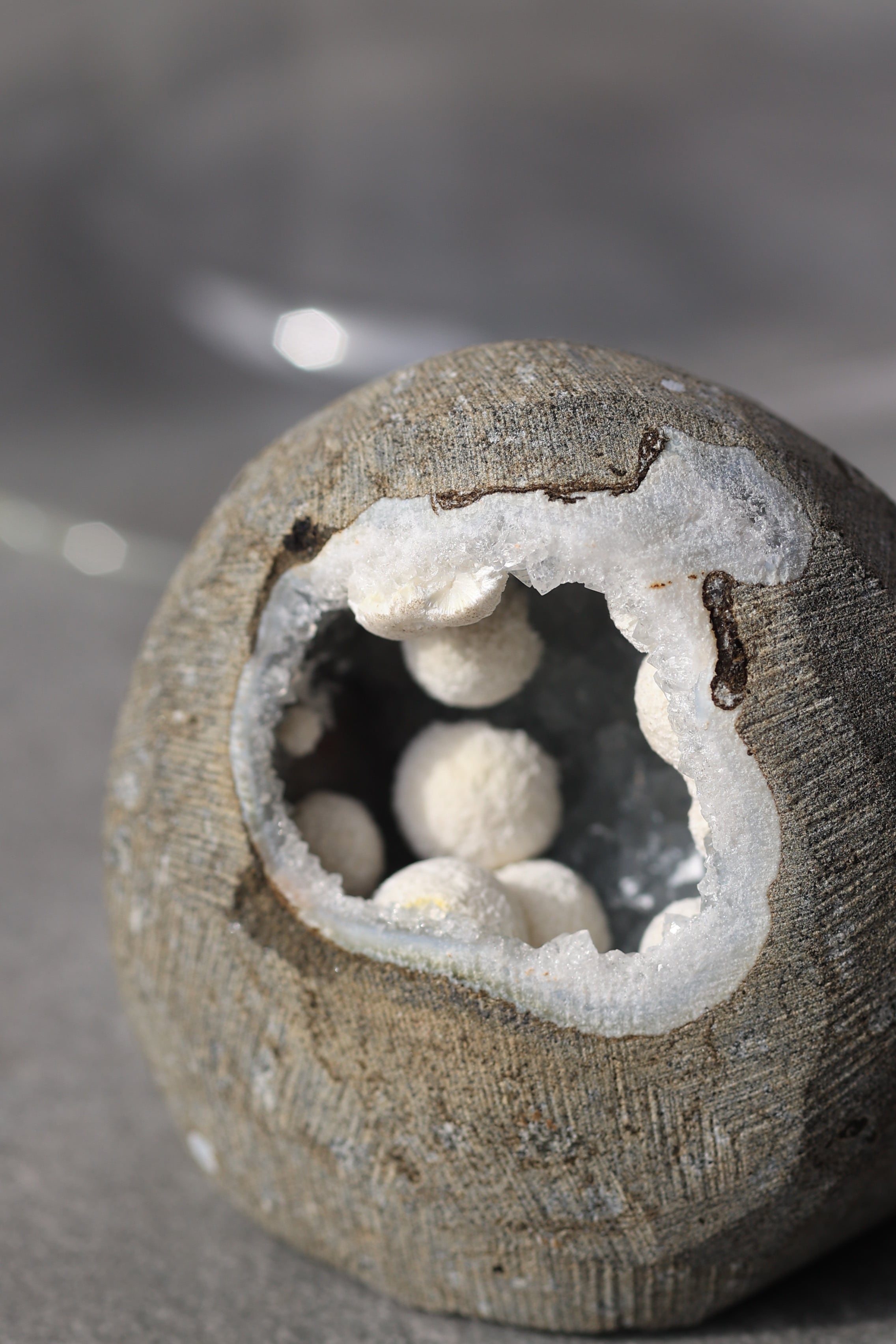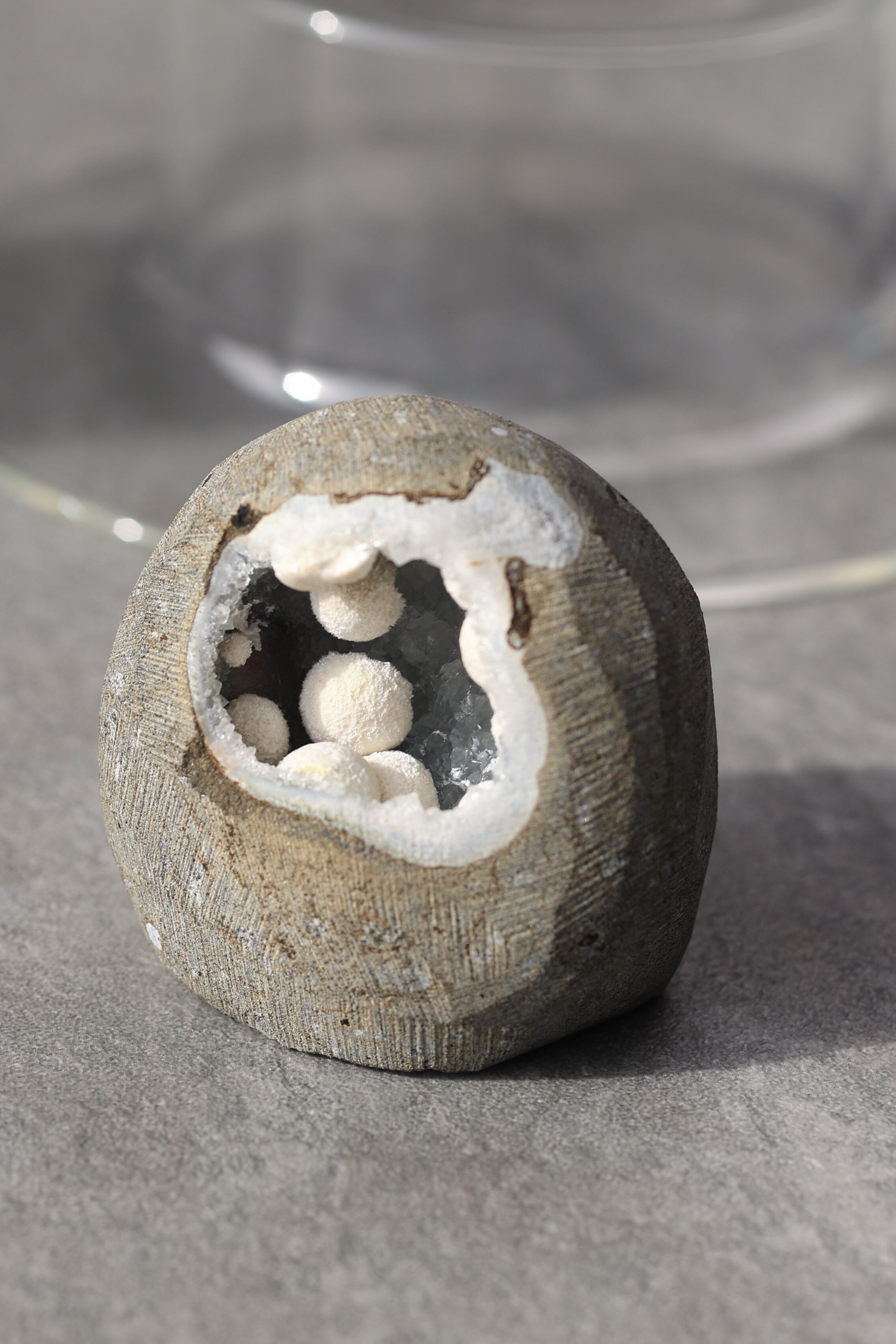 ジオードの内壁には、やわらかな質感のカルセドニーが広がり、その上にモルデナイトが成長することで、硬質さと柔らかさが同時に感じられる、不思議な調和が生まれています。