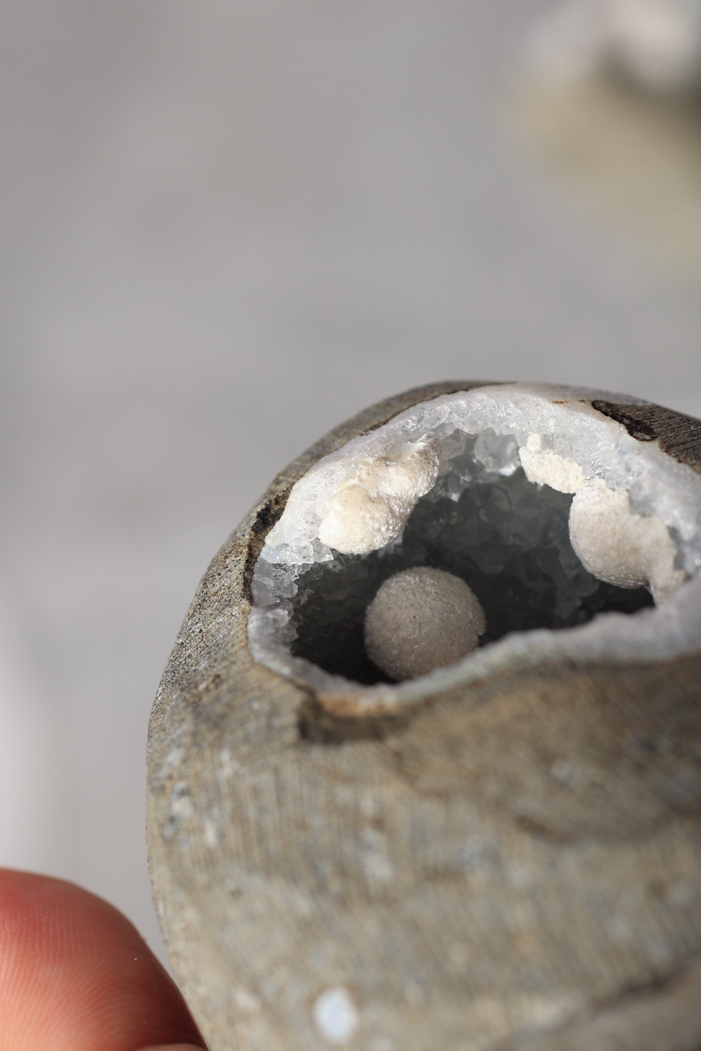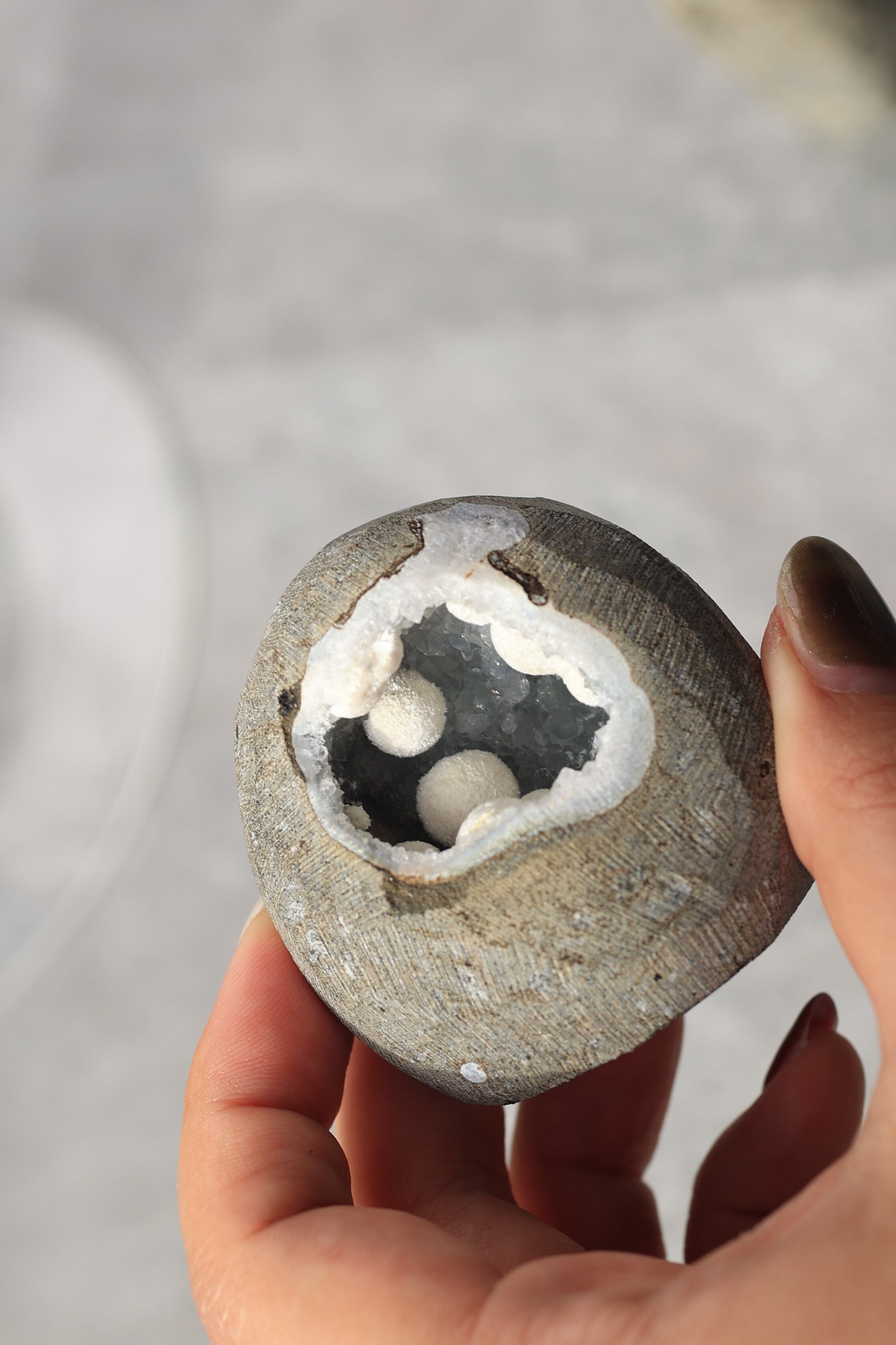 この形状は加工によるものではなく、岩の内部にできた空洞(ジオード)の中で、長い時間をかけて結晶が育まれた自然のままの姿です。