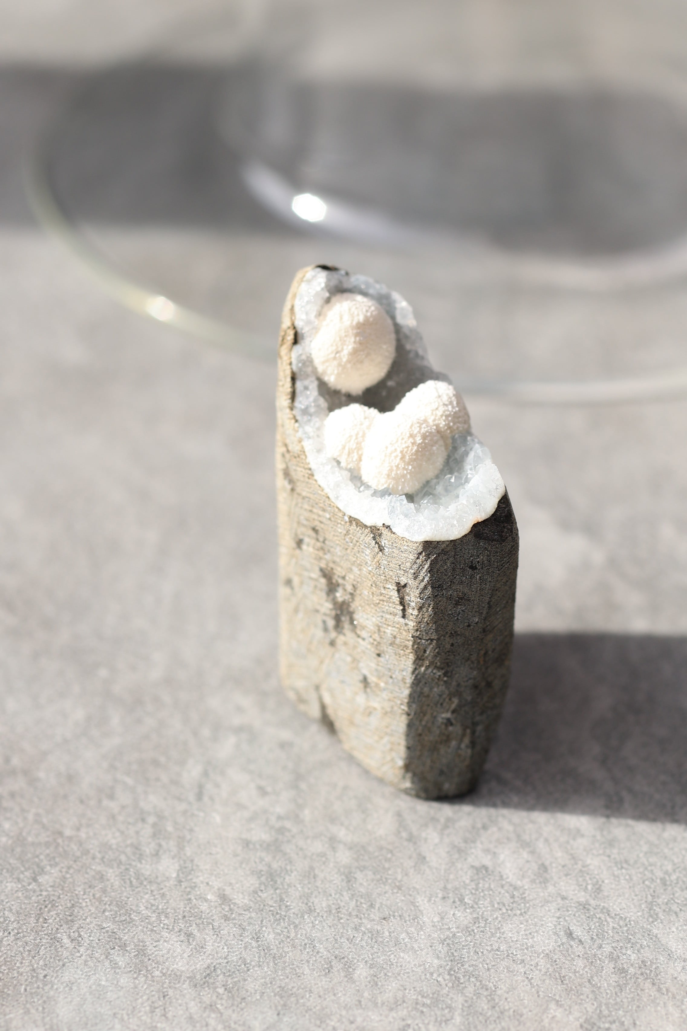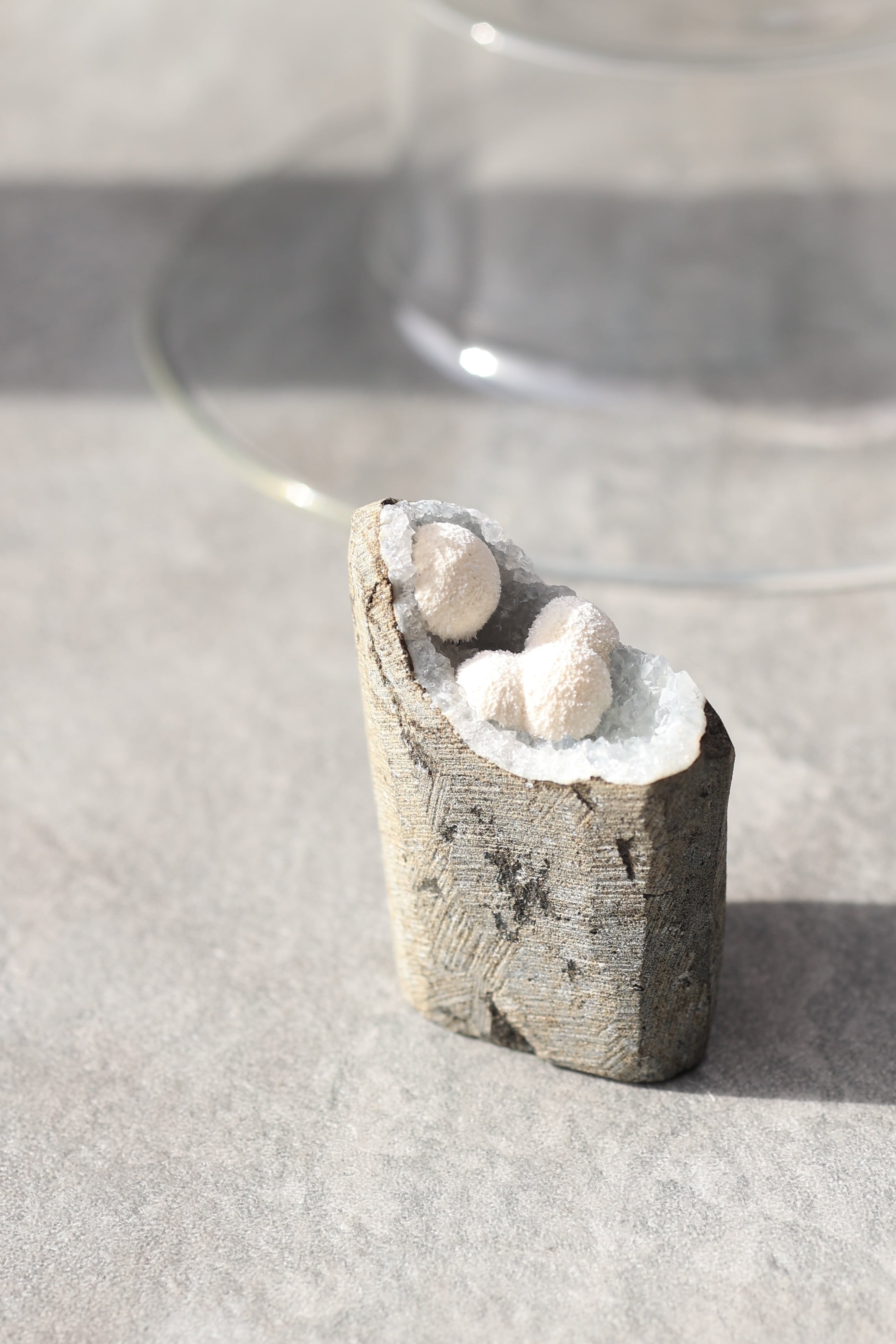 ジオードの内壁には、やわらかな質感のカルセドニーが広がり、その上にモルデナイトが成長することで、硬質さと柔らかさが同時に感じられる、不思議な調和が生まれています。