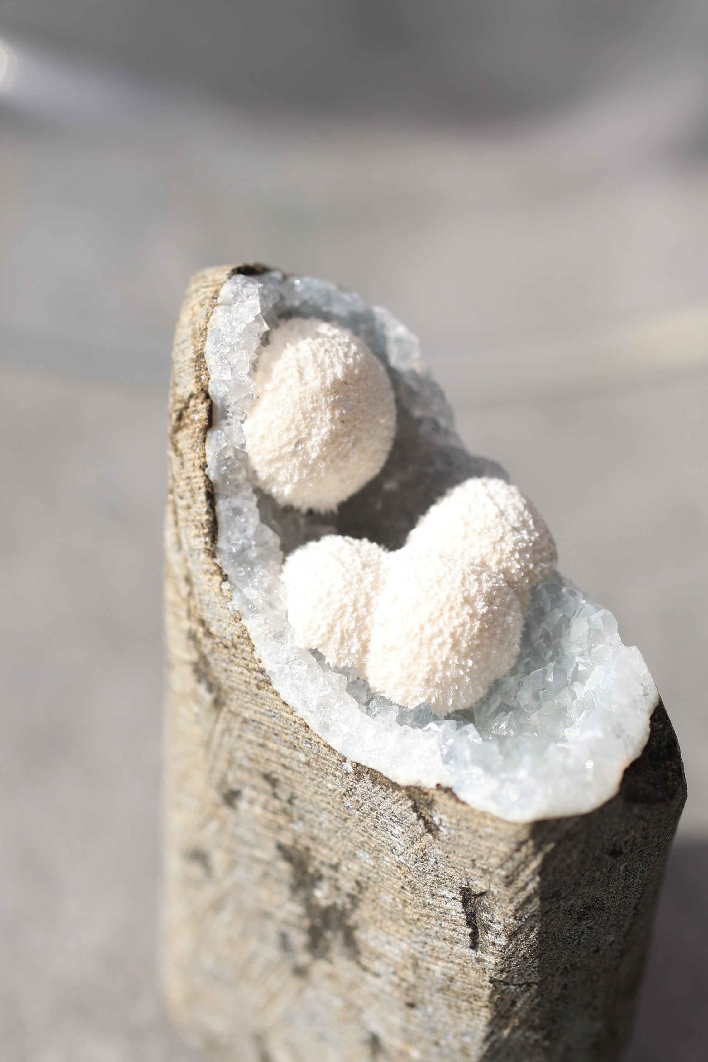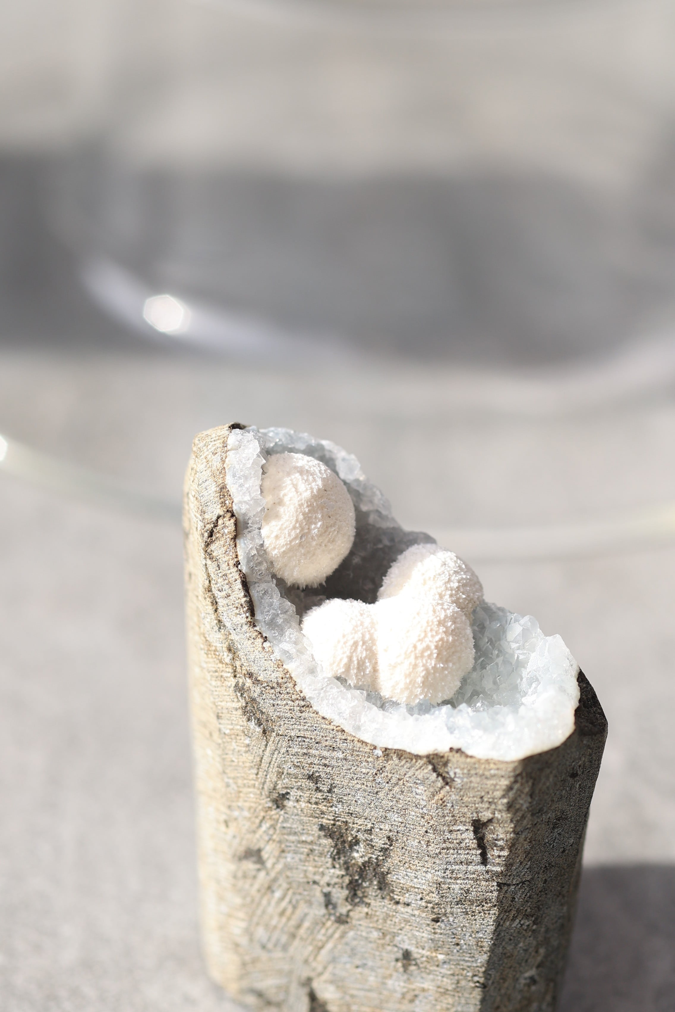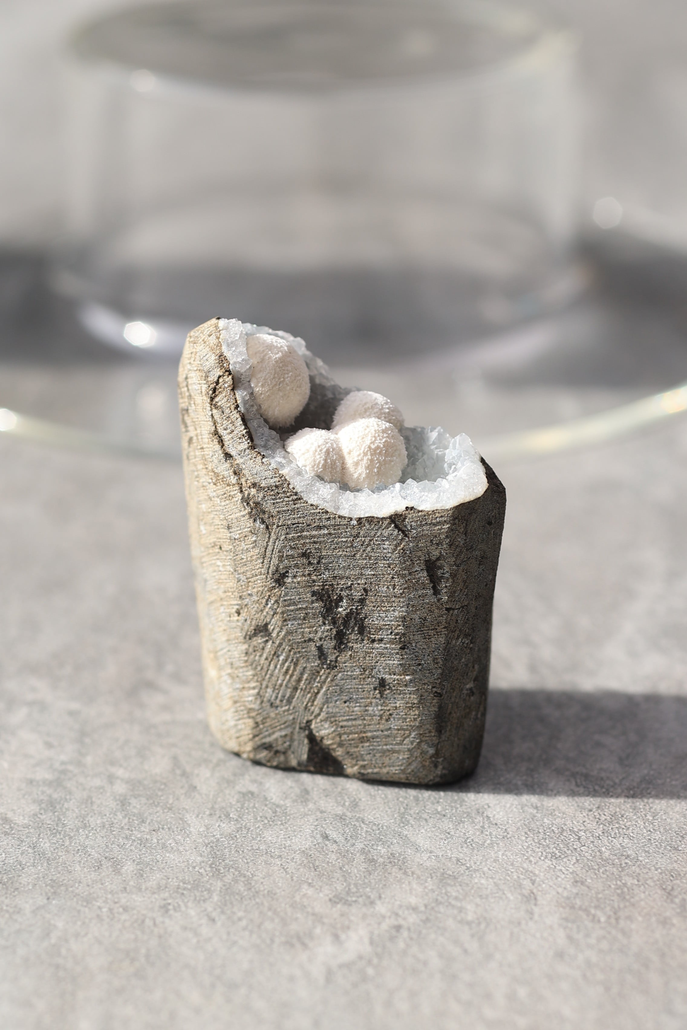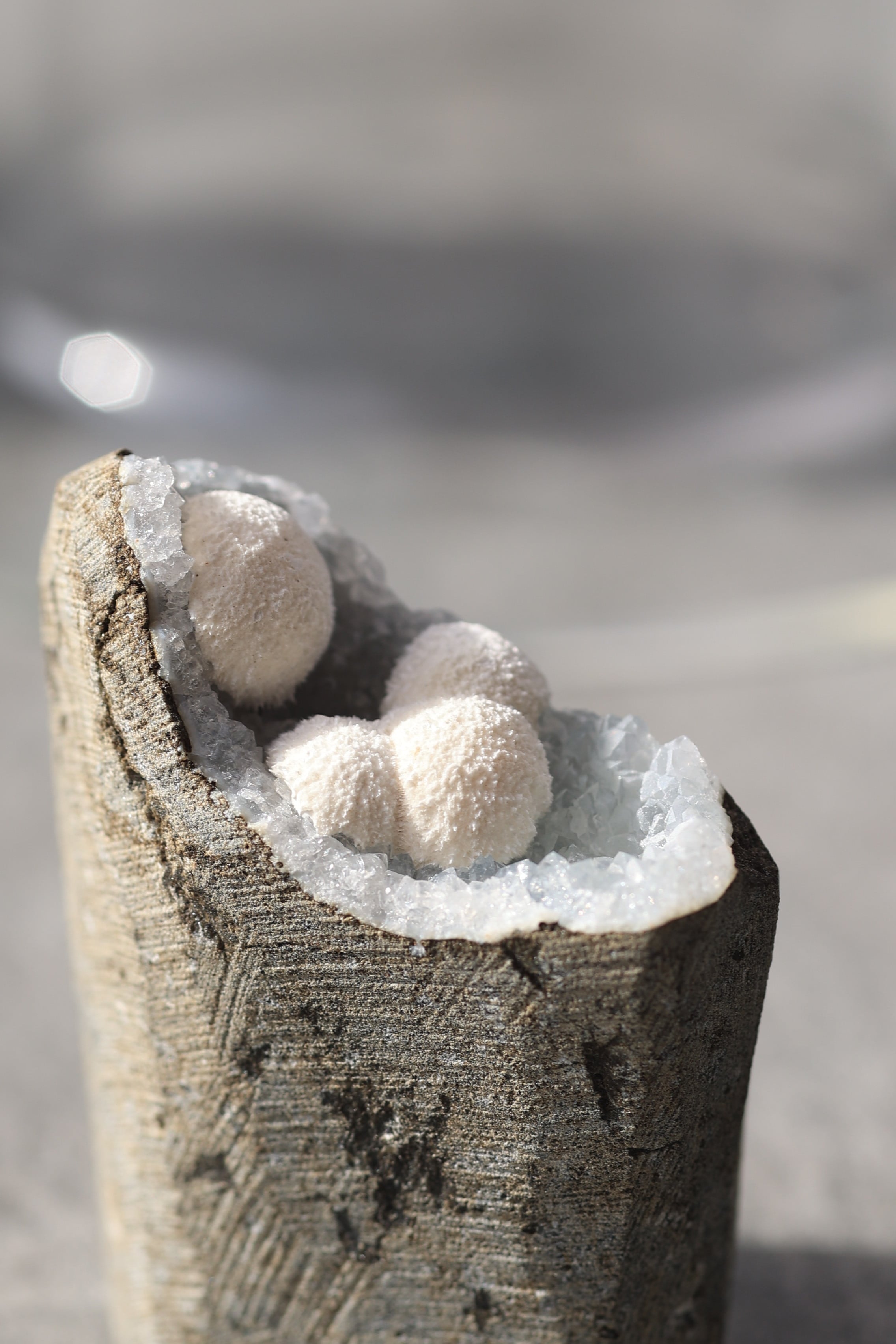 この形状は加工によるものではなく、岩の内部にできた空洞(ジオード)の中で、長い時間をかけて結晶が育まれた自然のままの姿です。