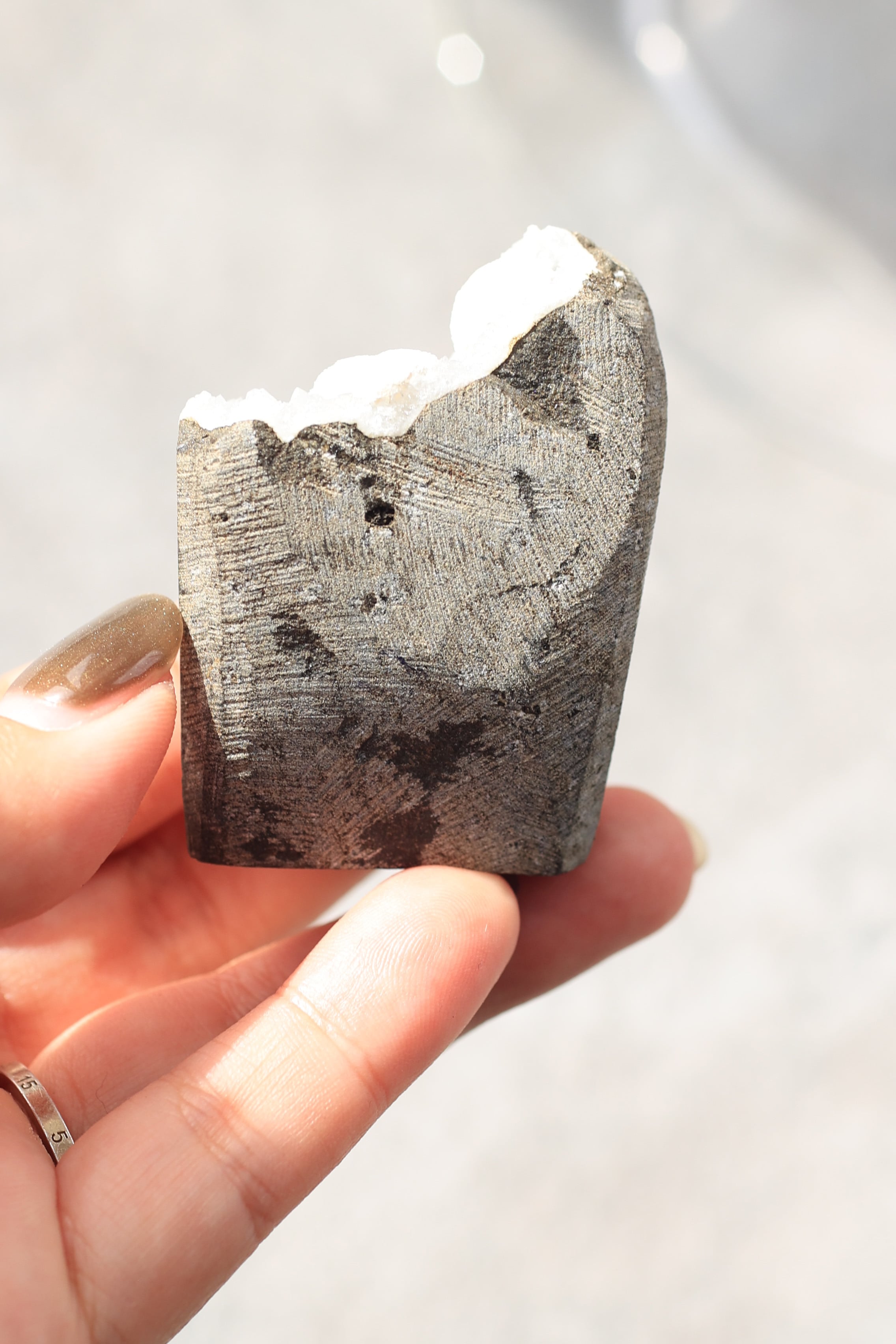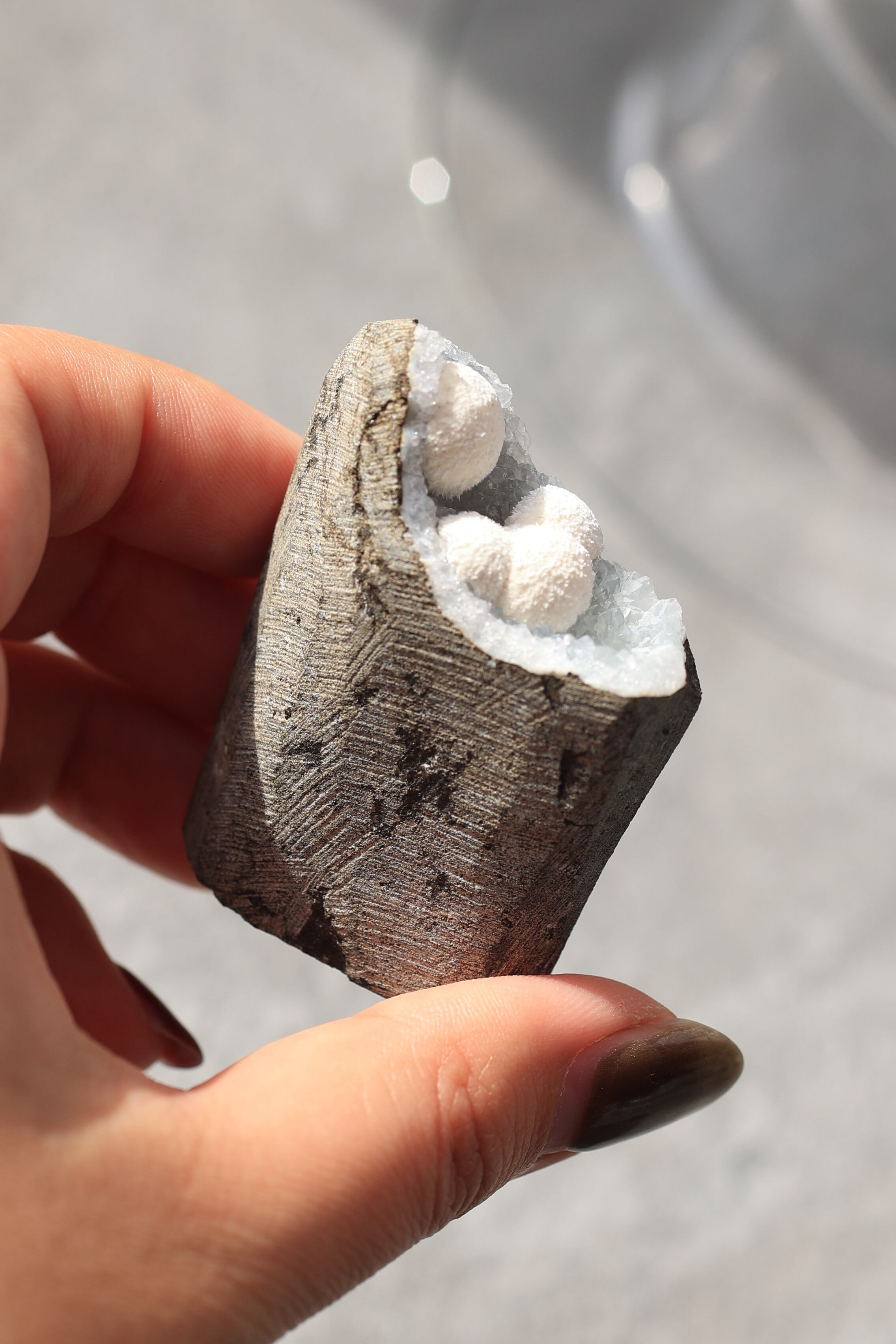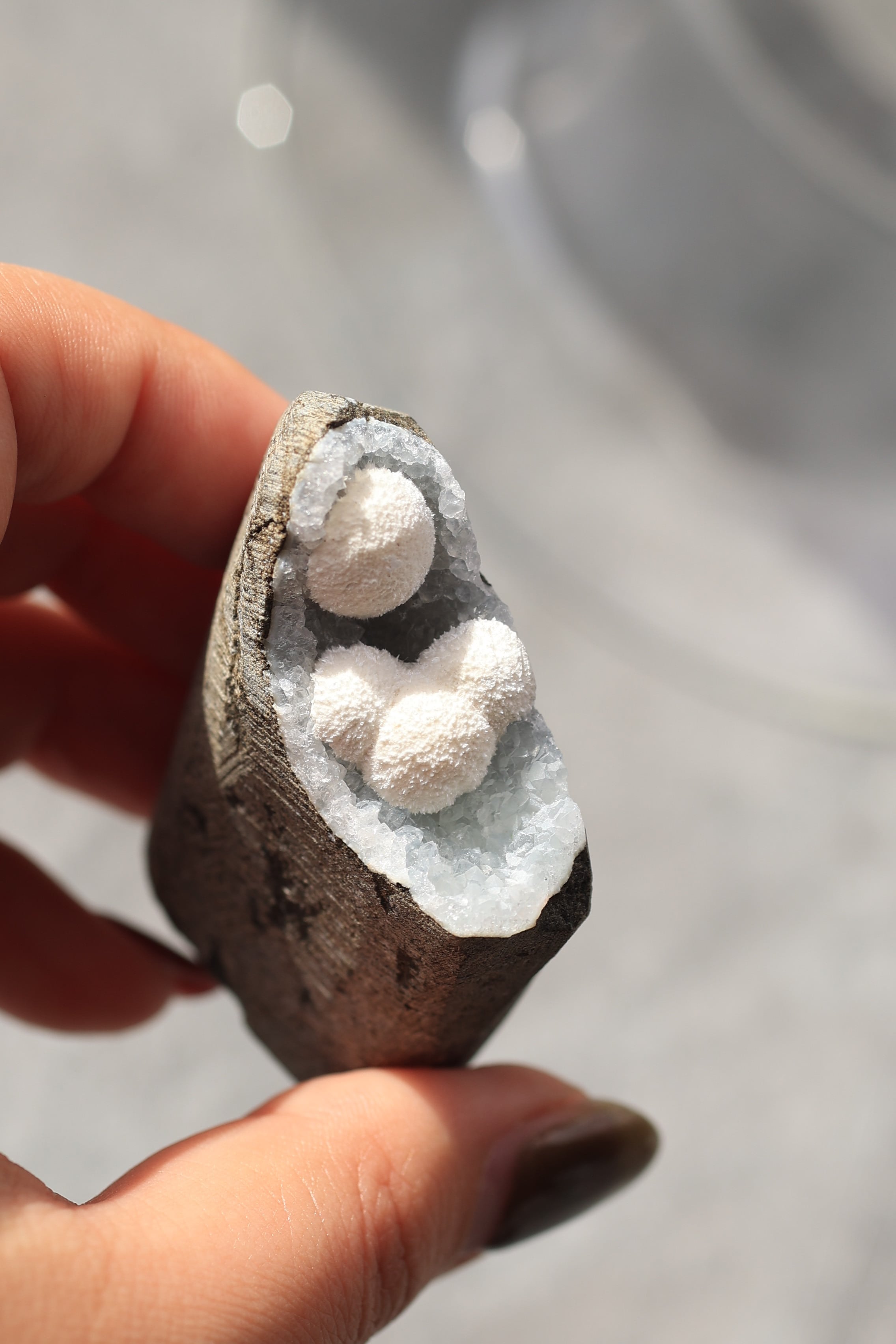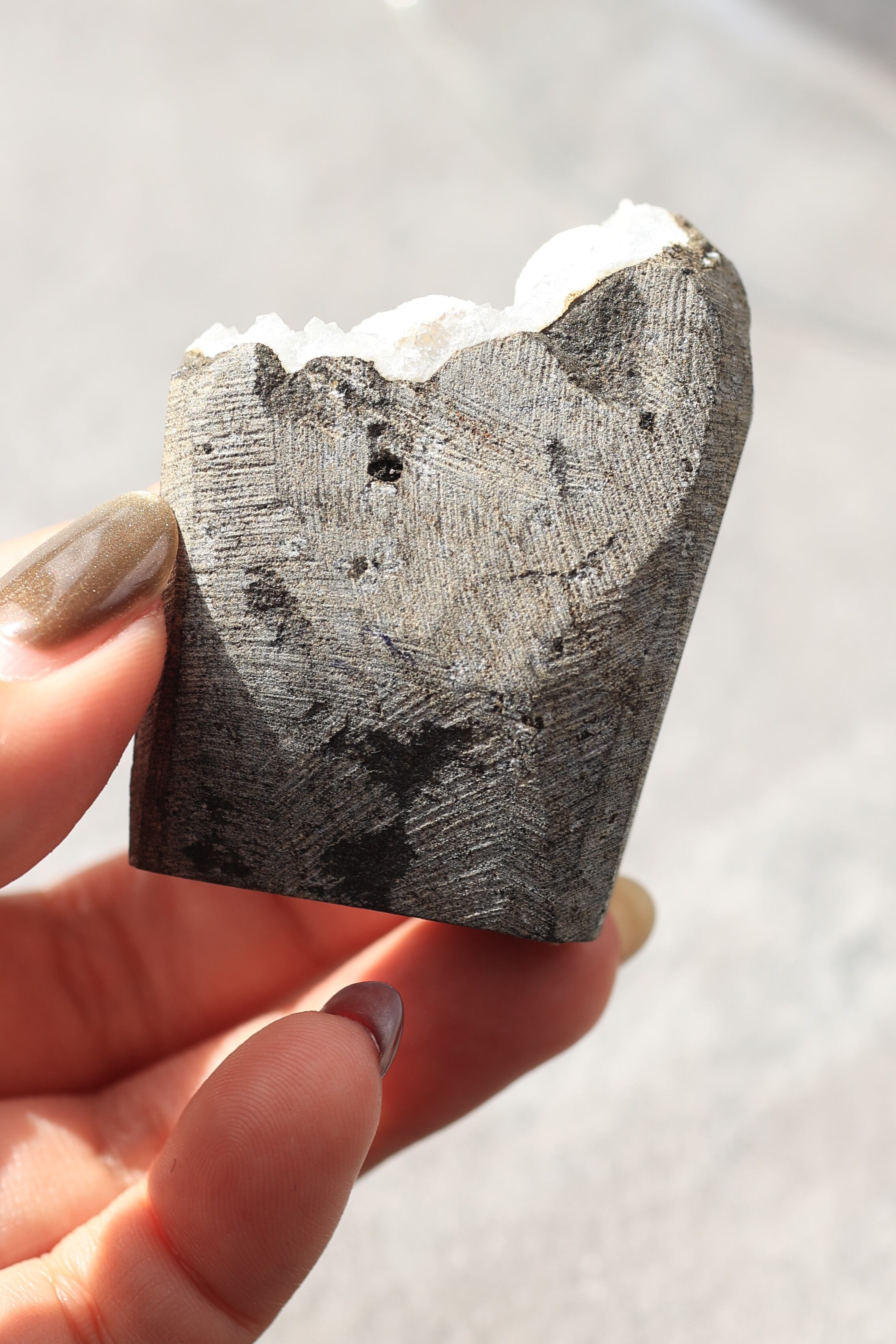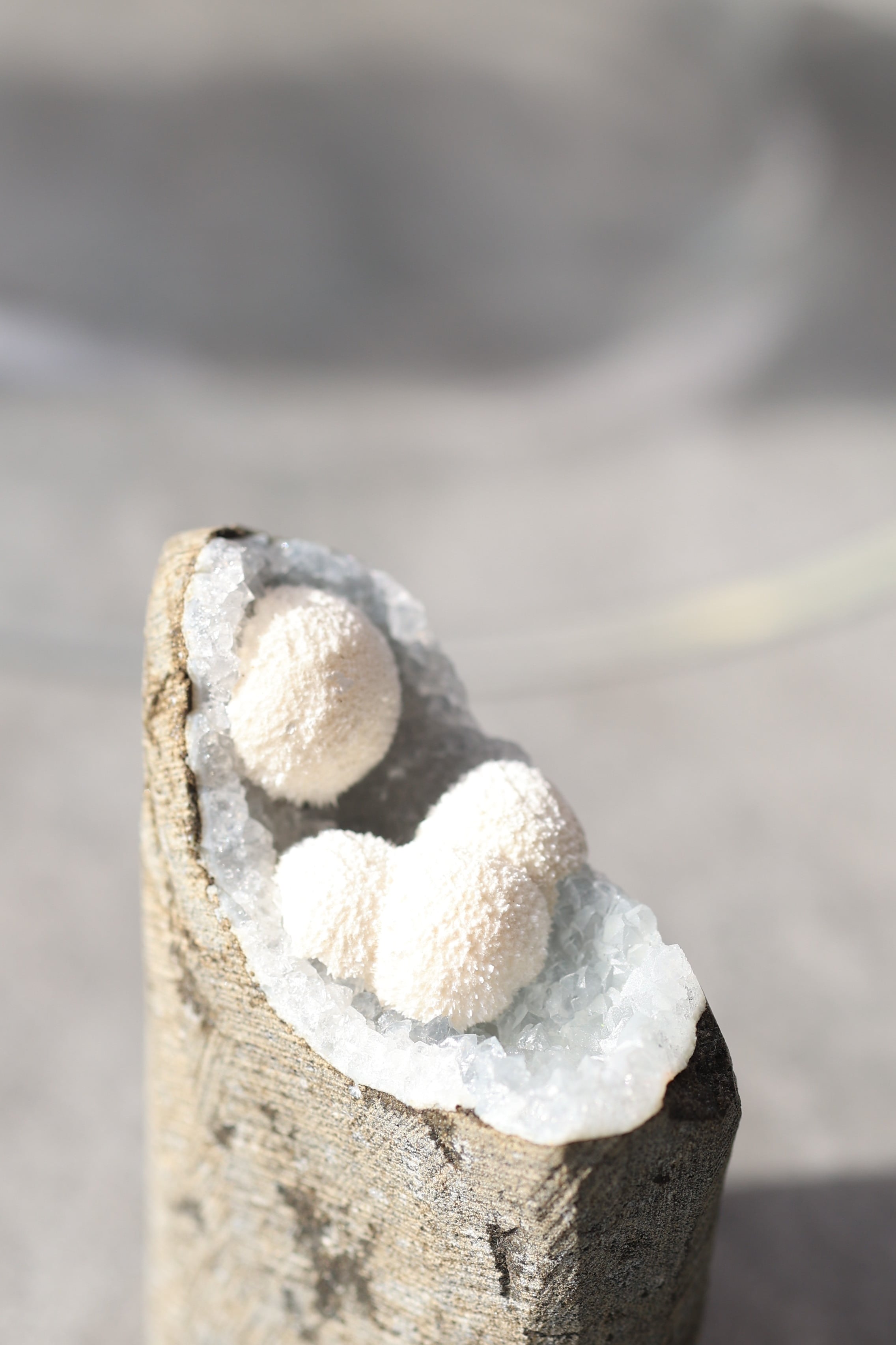 この形状は加工によるものではなく、岩の内部にできた空洞(ジオード)の中で、長い時間をかけて結晶が育まれた自然のままの姿です。